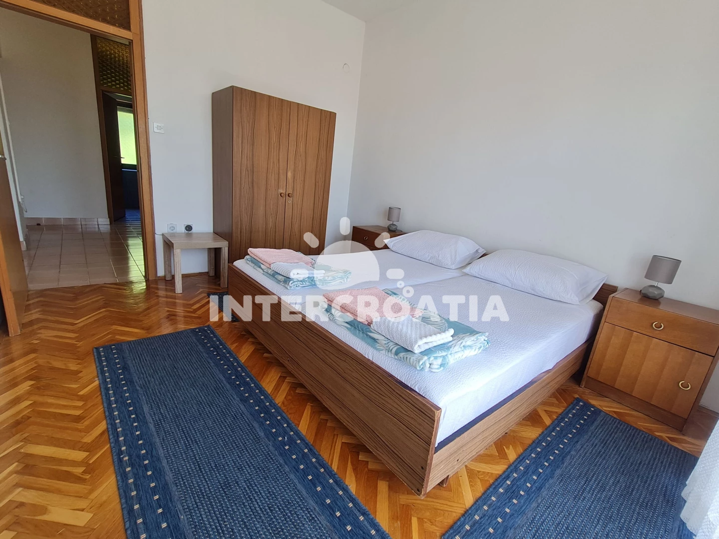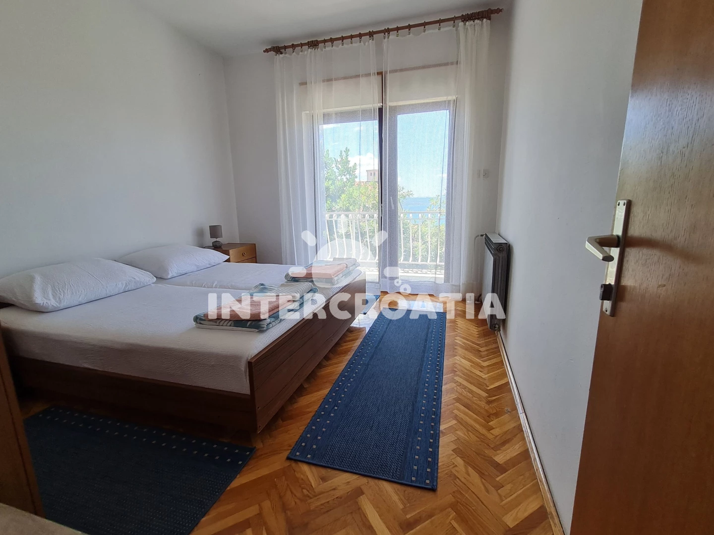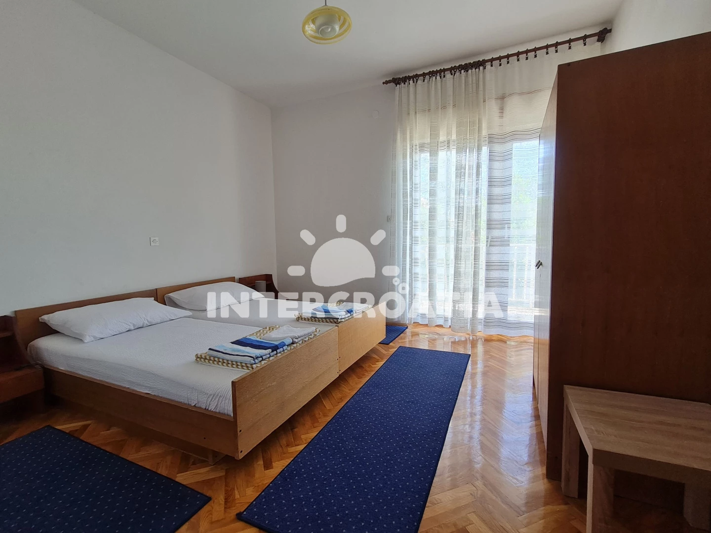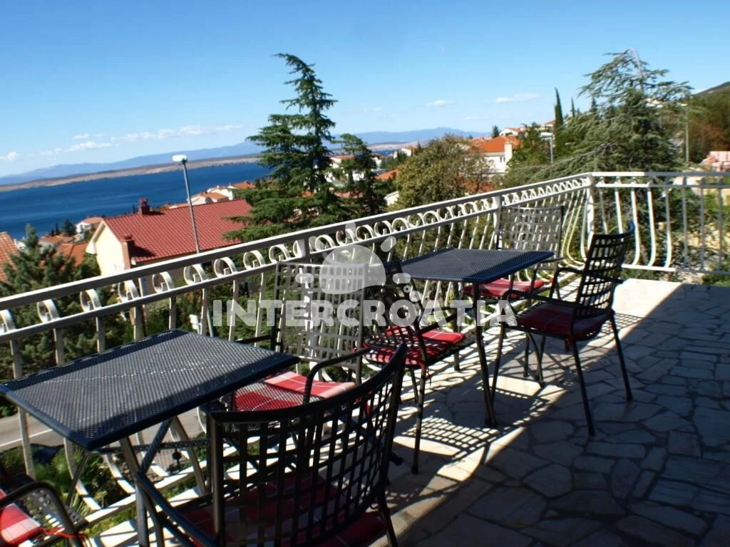 Apartmán (90 m2) s terasou, posezením a výhledem na moře se nachází ve 2. patře domu. Apartmán má 3 ložnice, 2 koupelny a je vhodný pro až 6 osob. Obývací pokoj je spojený s kuchyní. Kuchyňská linka je vybavena sporákem s troubou, rychlovarnou konvicí, kávovarem, toustovačem, nádobím a lednicí s mrazákem. Obývací pokoj s pohovkou, televizí a vstupem na terasu. Dále chodba s klimatizací a vstupy do ložnic. Všechny tři ložnice jsou vybaveny vždy s jedním dvoulůžkem. První koupelna se sprchovým koutem, umyvadlem, bidetem a wc. Druhá koupelna s vanou, umyvadlem, bidetem a wc. Hostům je k dispozici parkování u domu zdarma.