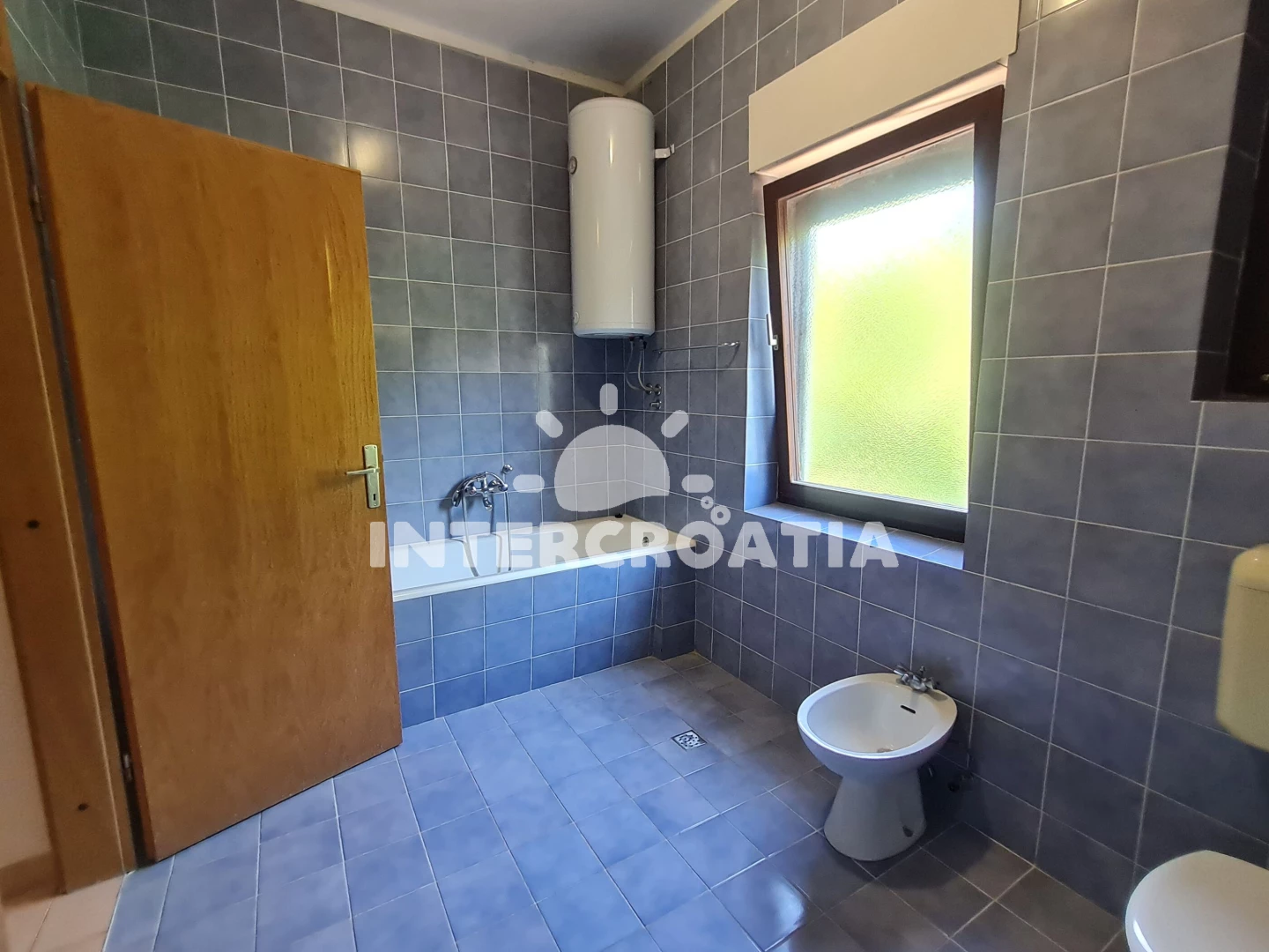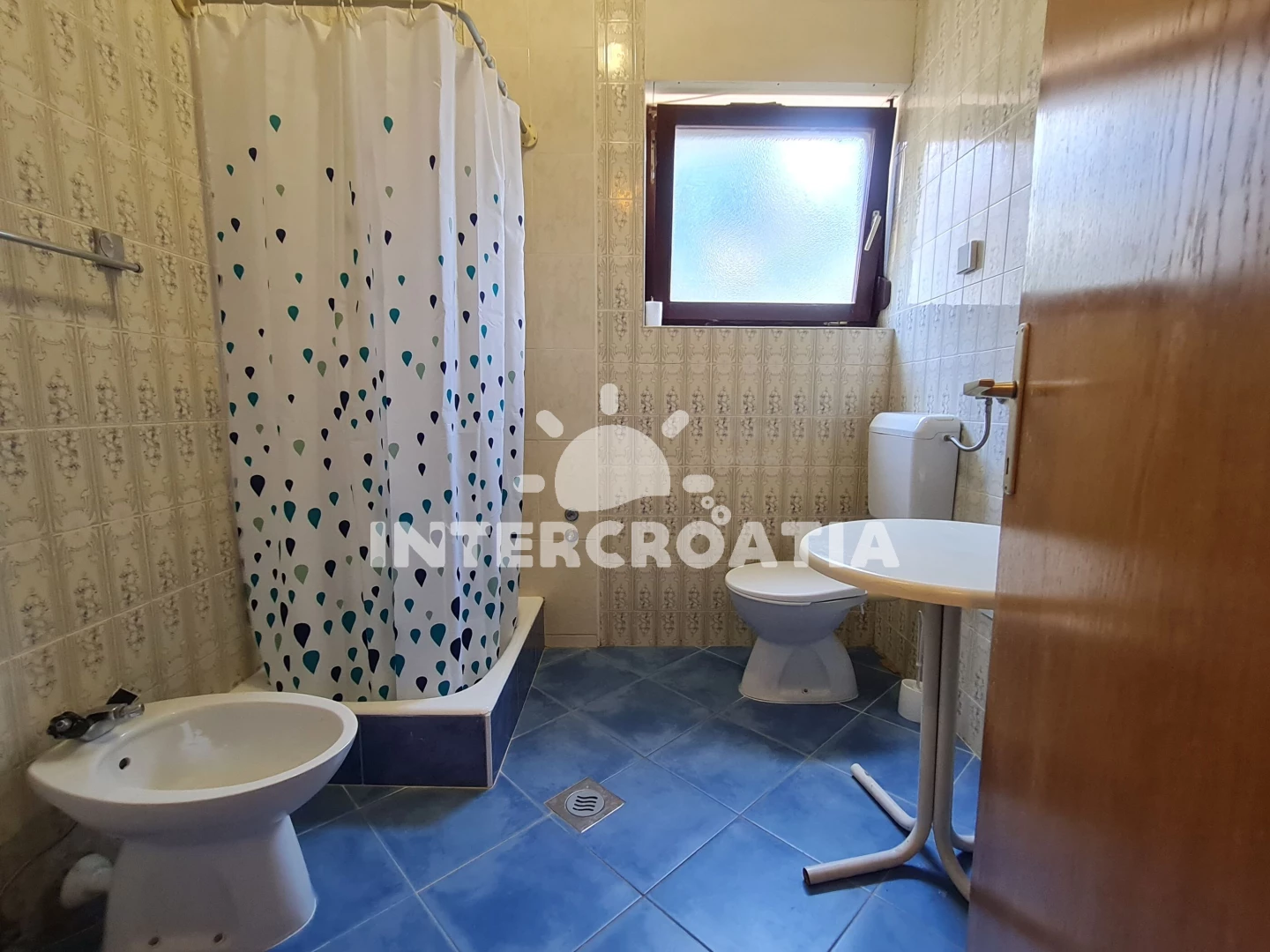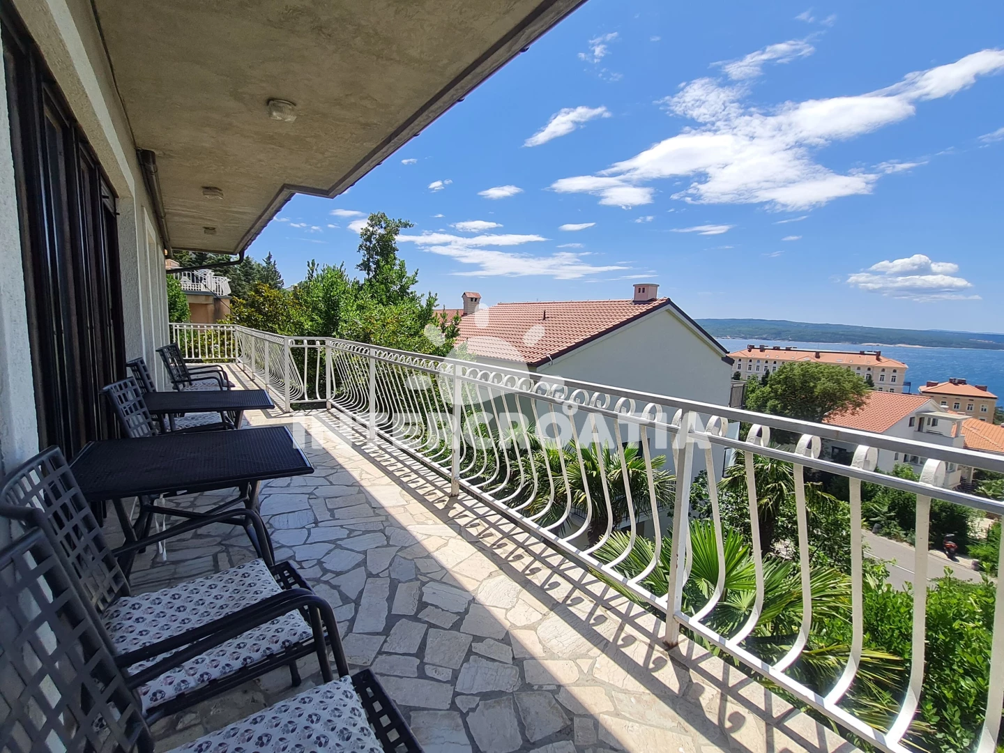 Apartmán (90 m2) s terasou, posezením a výhledem na moře se nachází ve 2. patře domu. Apartmán má 3 ložnice, 2 koupelny a je vhodný pro až 6 osob. Obývací pokoj je spojený s kuchyní. Kuchyňská linka je vybavena sporákem s troubou, rychlovarnou konvicí, kávovarem, toustovačem, nádobím a lednicí s mrazákem. Obývací pokoj s pohovkou, televizí a vstupem na terasu. Dále chodba s klimatizací a vstupy do ložnic. Všechny tři ložnice jsou vybaveny vždy s jedním dvoulůžkem. První koupelna se sprchovým koutem, umyvadlem, bidetem a wc. Druhá koupelna s vanou, umyvadlem, bidetem a wc. Hostům je k dispozici parkování u domu zdarma.