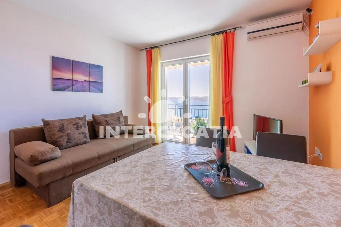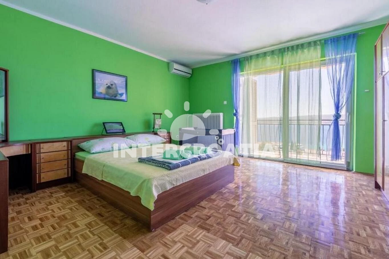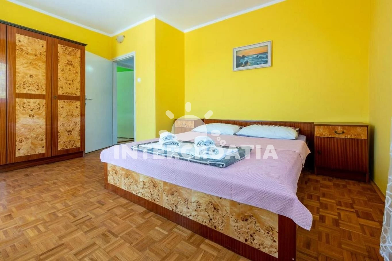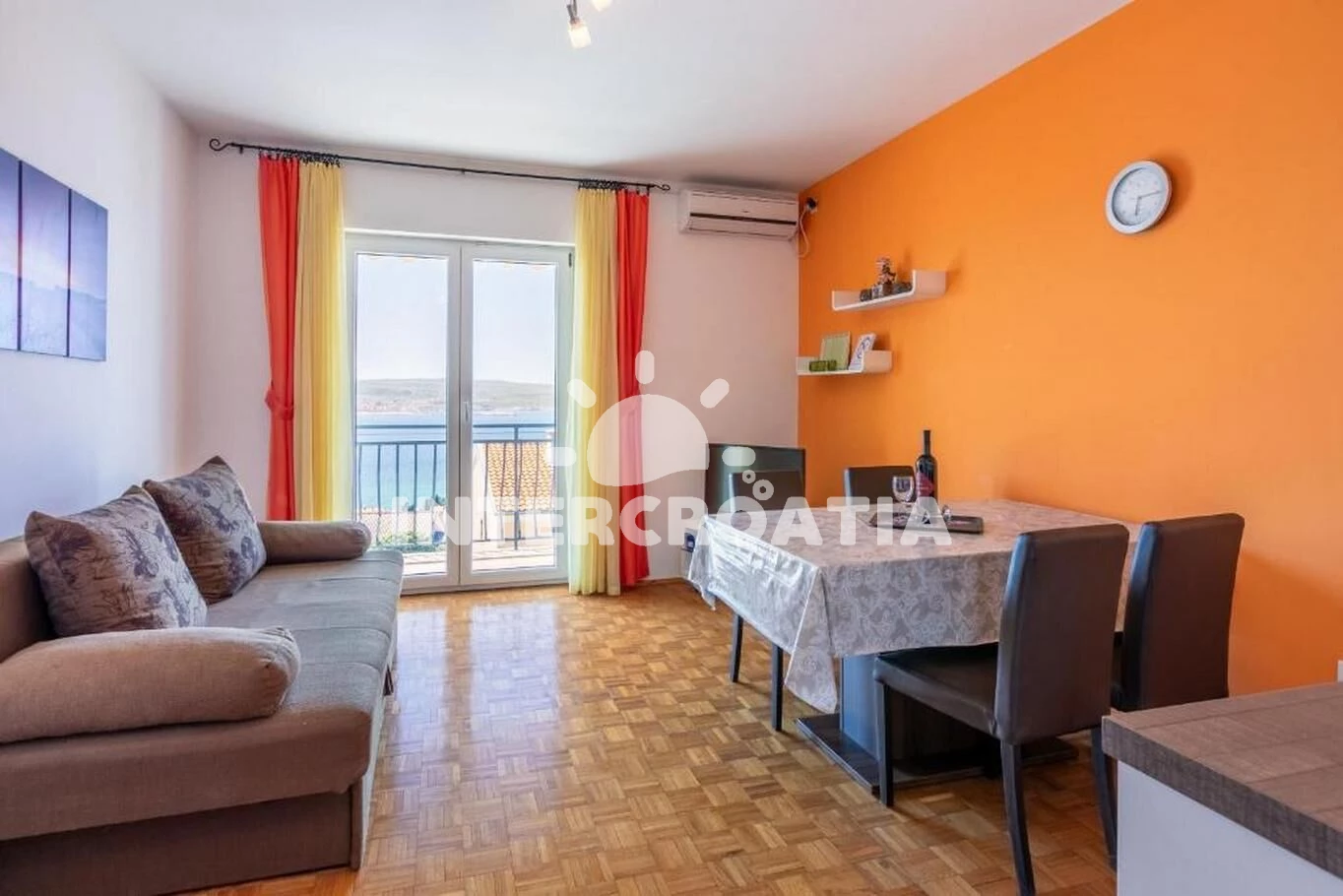 Apartmán (90 m2) s balkonem, a výhledem na moře. Nachází se ve 2. patře objektu. Apartmán má 2 ložnice a je vhodný pro až 6 osob. Kuchyňská linka je vybavena varnou deskou, kávovarem, myčkou na nádobí, rychlovarnou konvicí, nádobím, lednicí, mrazákem. V obývací místnosti je rozložitelná pohovka (extra lůžko pro 2 osoby). K dispozici televize, žehlička. První ložnice s dvoulůžkem. Druhá ložnice s dvoulůžkem. Koupelna s vanou, umyvadlem, fénem a WC. Hostům je k dispozici parkování u objektu zdarma.