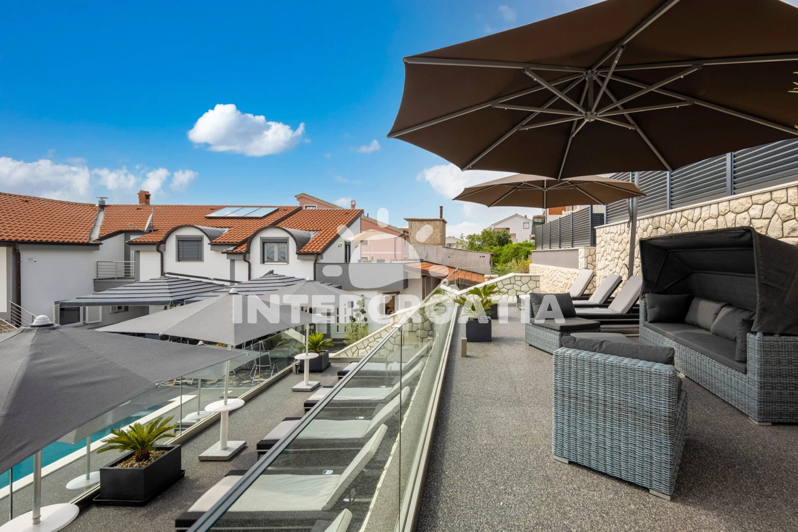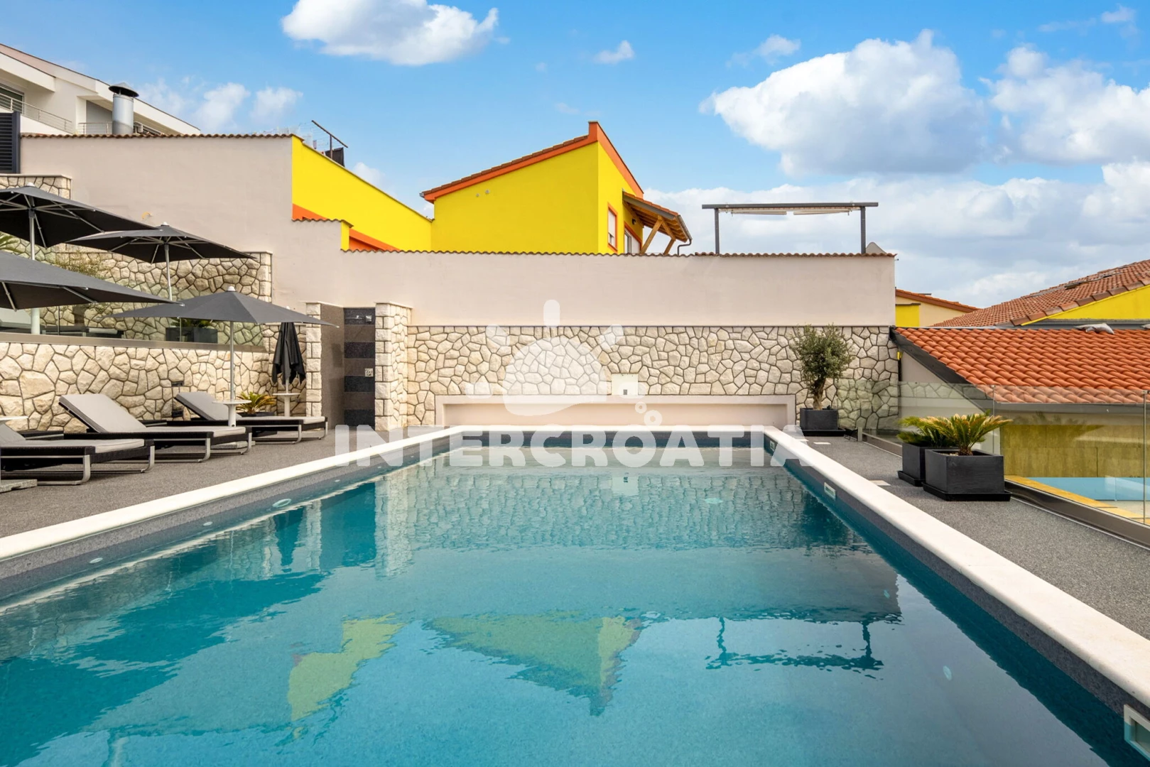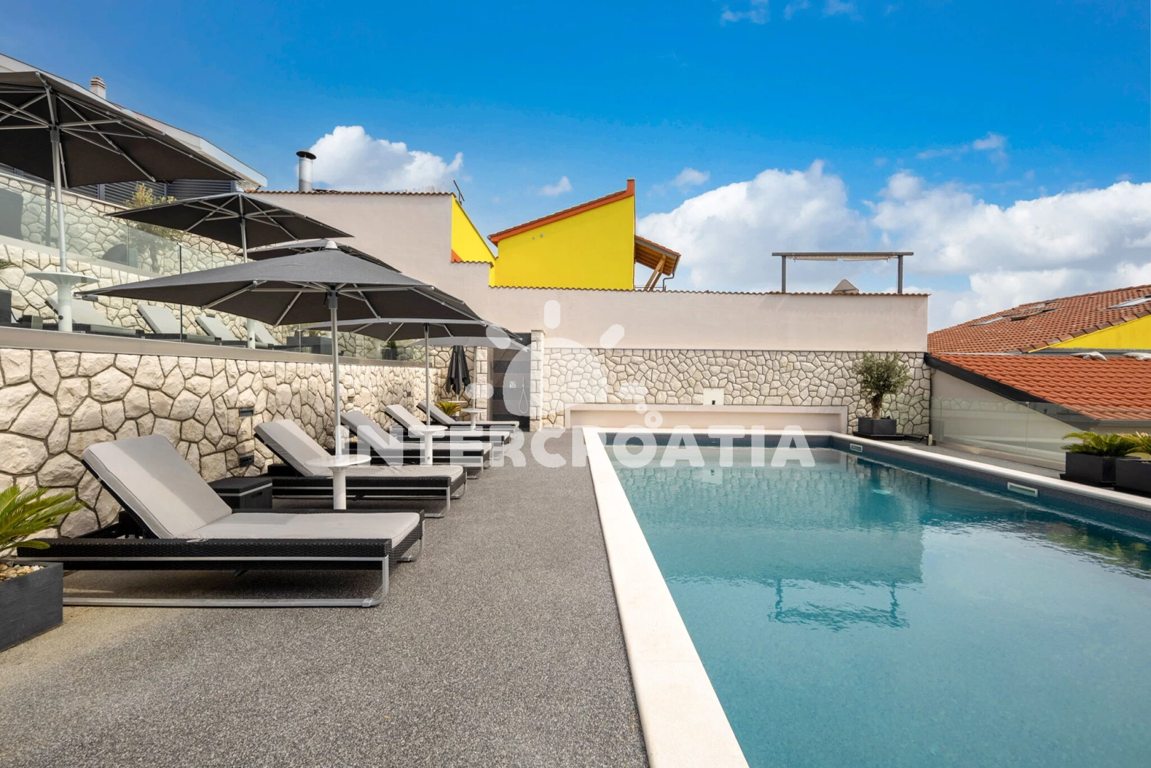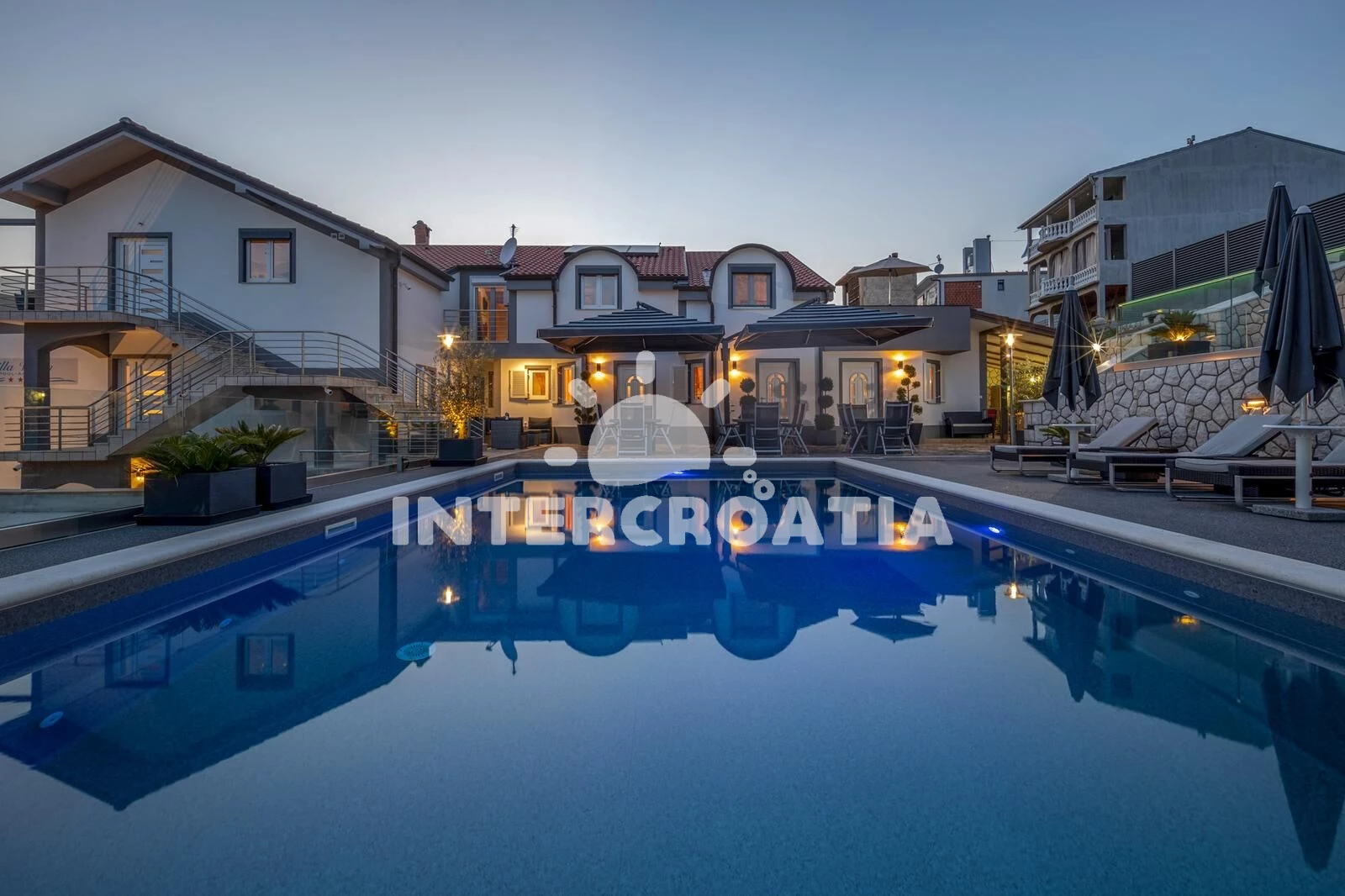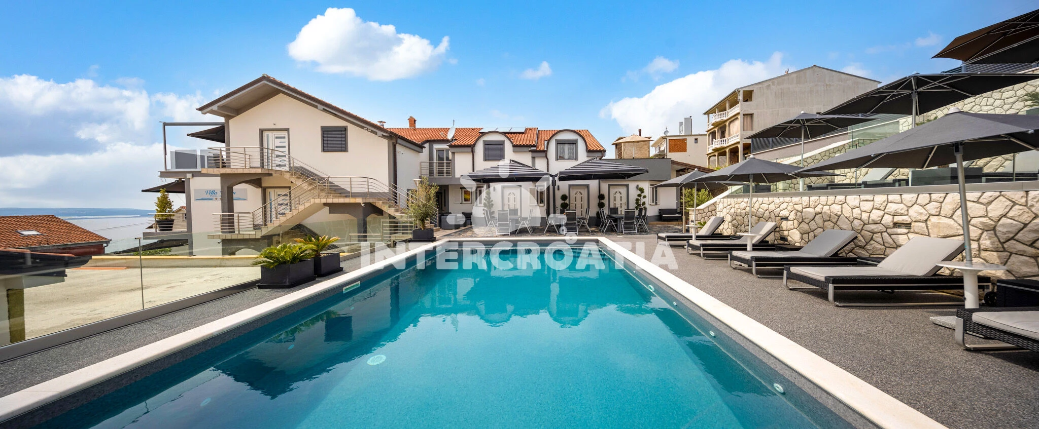 Apartmán se nachází 1200 m od moře a pláže. Pláž je skalnatá, oblázková a betonové desky. Apartmán disponuje bazénem s lehátky pro ubytované hosty. U objektu je k dispozici společná zahrada s posezením a grilem. Parkování je před domem.