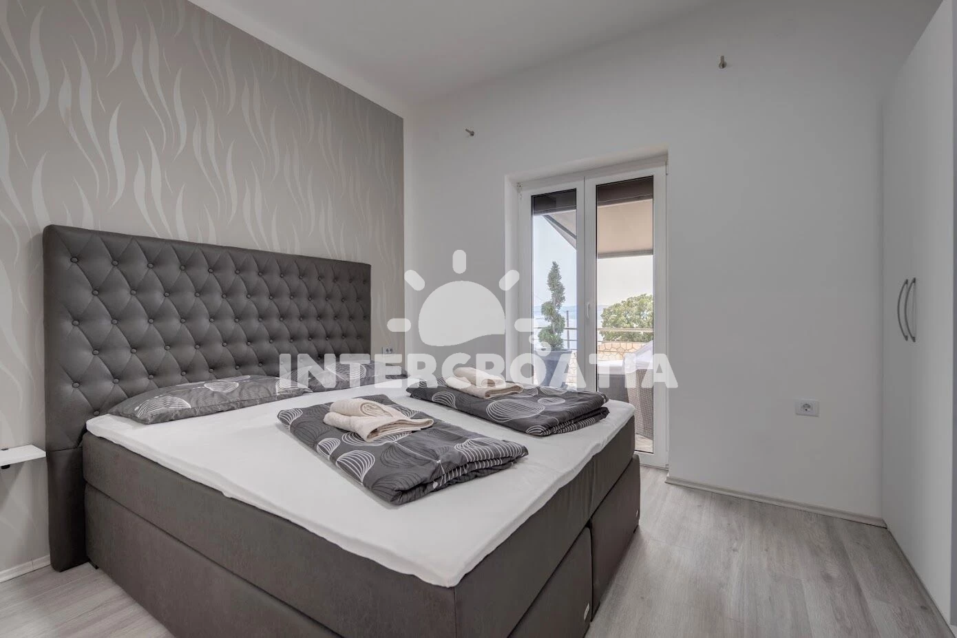 Apartmán (70 m2) s balkonem, s terasou, a výhledem na moře. Nachází se v přízemí objektu. Apartmán má 3 ložnice a je vhodný pro až 8 osob. Kuchyňská linka je vybavena varnou deskou, kávovarem, toustovačem, troubou, myčkou na nádobí, mikrovlnnou troubou, rychlovarnou konvicí, nádobím, lednicí, mrazákem. K dispozici televize se satelitním programem. První ložnice s jednolůžkem, dvoulůžkem. Druhá ložnice s dvoulůžkem, jednolůžkem. Třetí ložnice s dvoulůžkem. Koupelna se sprchovým koutem, umyvadlem, fénem a WC.