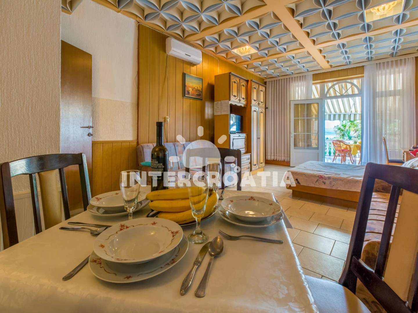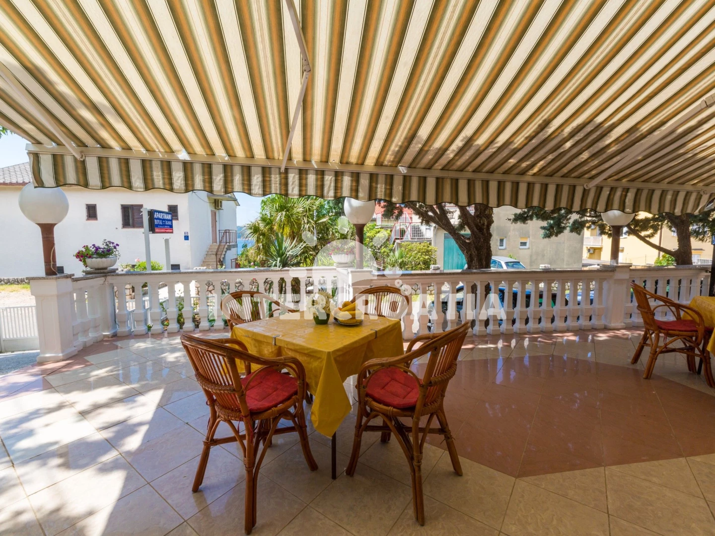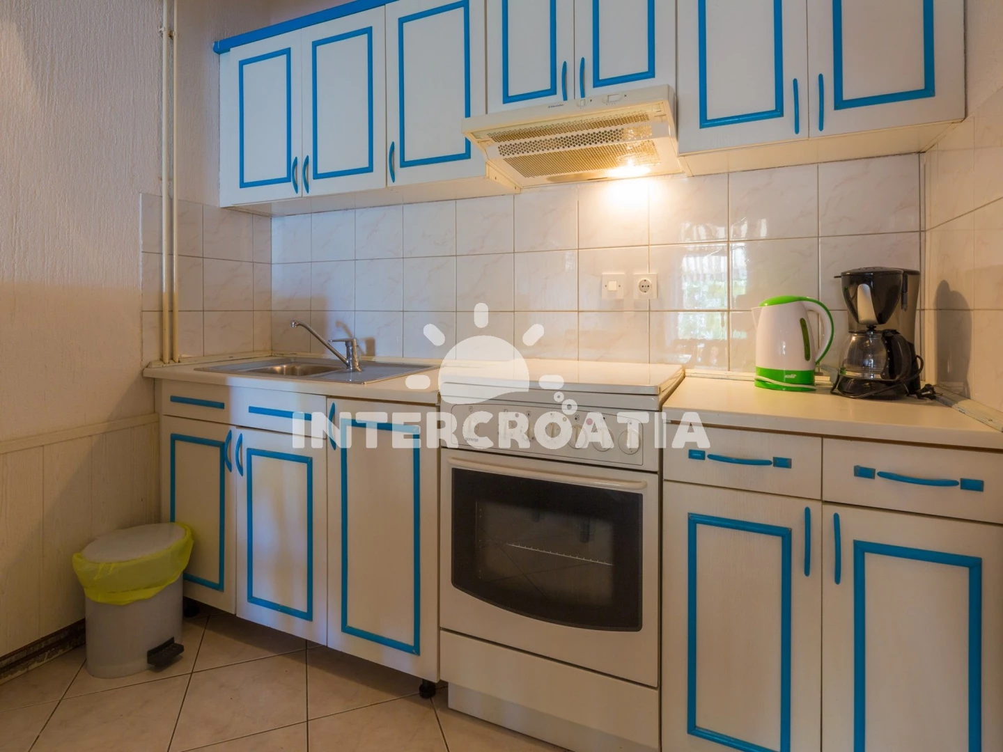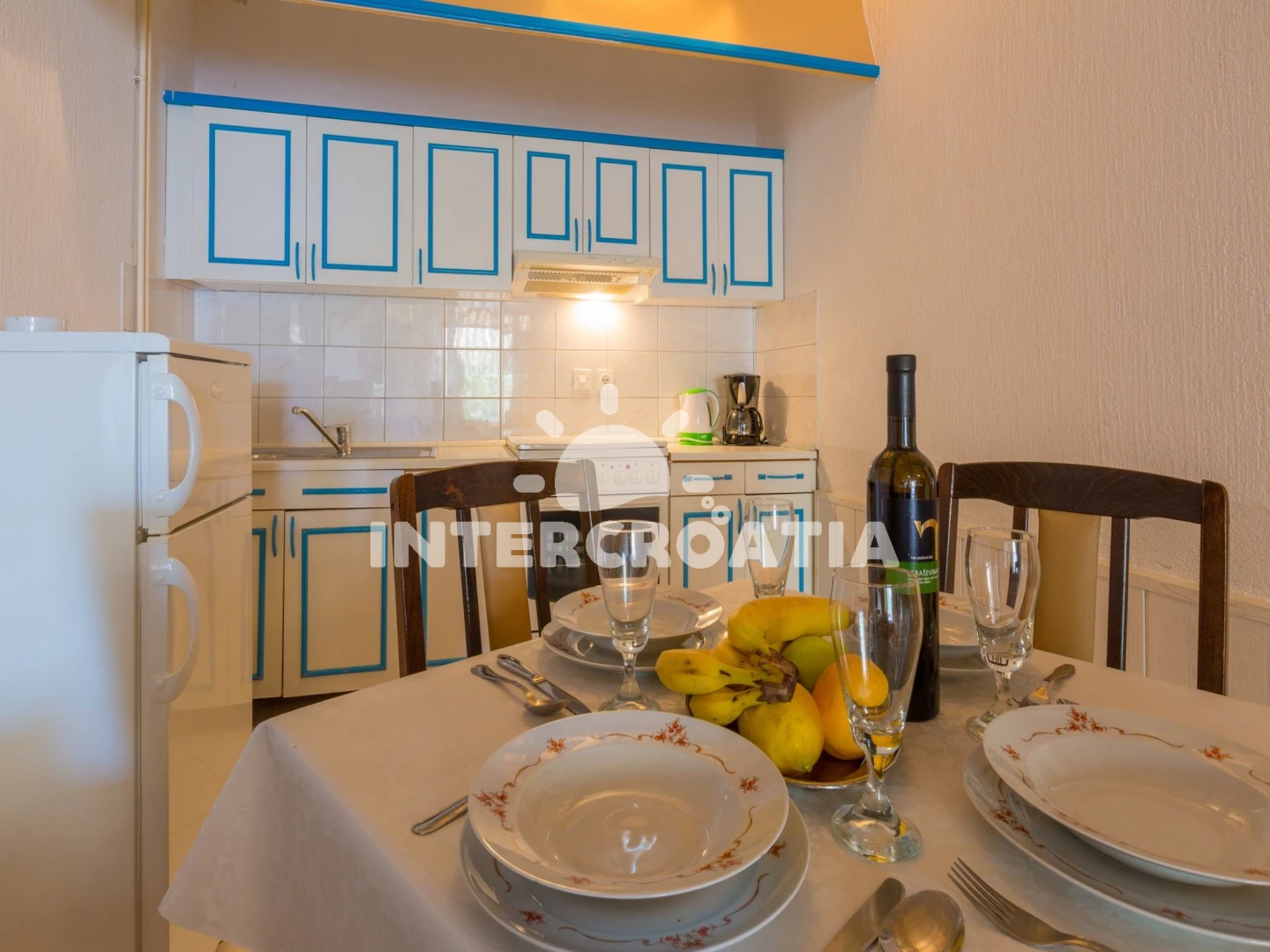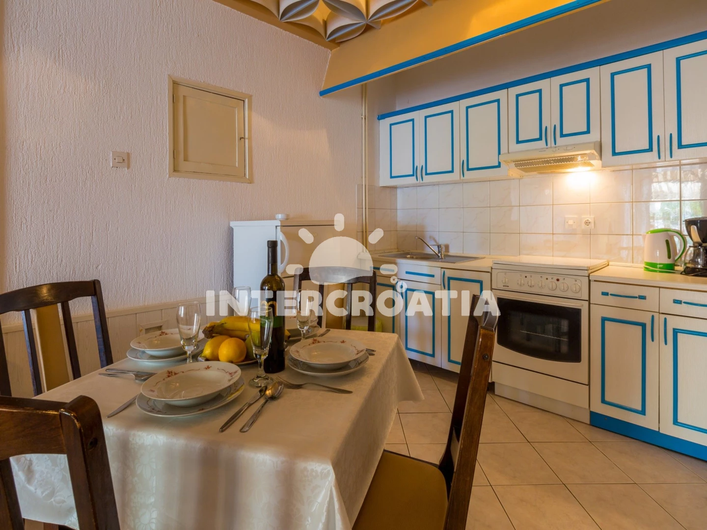 Apartmán se nachází 580 m od moře a pláže. Pláž je skalnatá, oblázková, větší kamení a betonové desky. U objektu je k dispozici společná zahrada s posezením a grilem. Parkování je před domem.