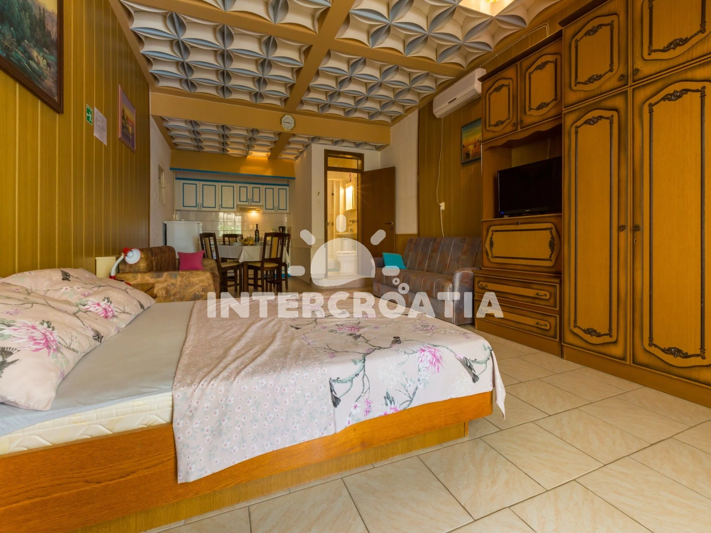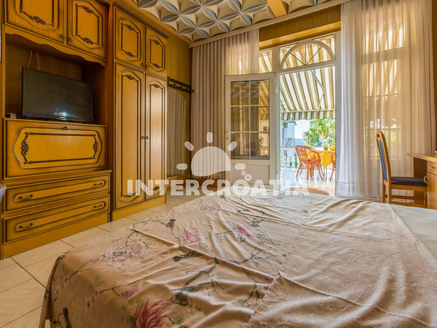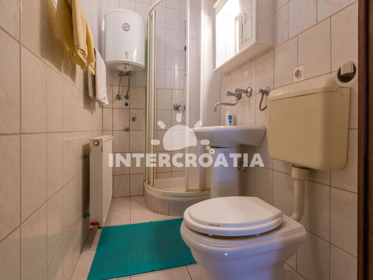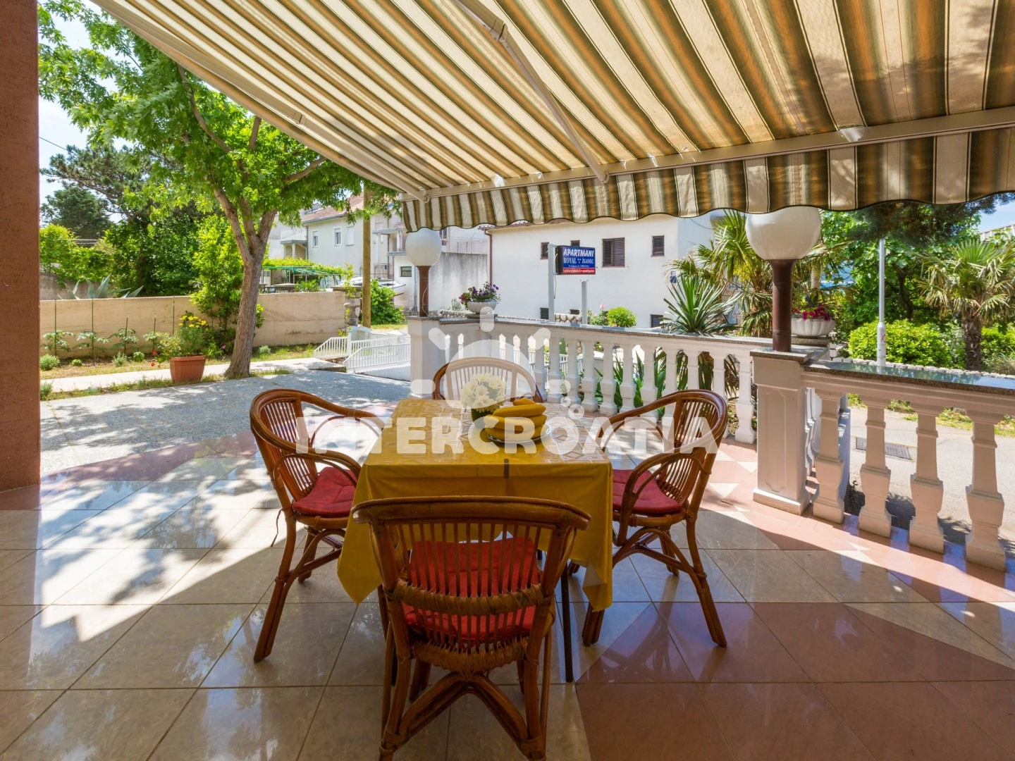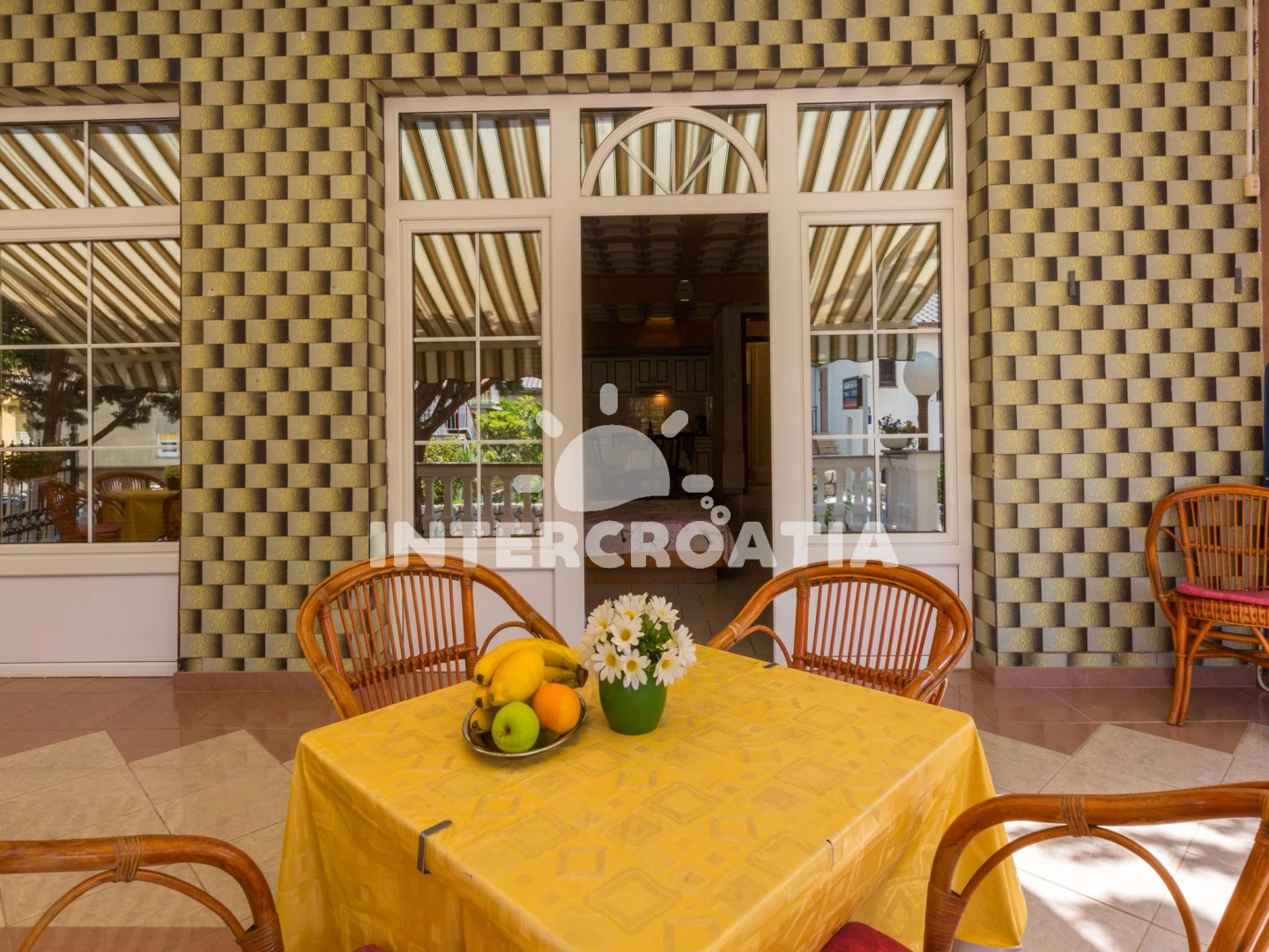 Apartmán se nachází 580 m od moře a pláže. Pláž je skalnatá, oblázková, větší kamení a betonové desky. U objektu je k dispozici společná zahrada s posezením a grilem. Parkování je před domem.