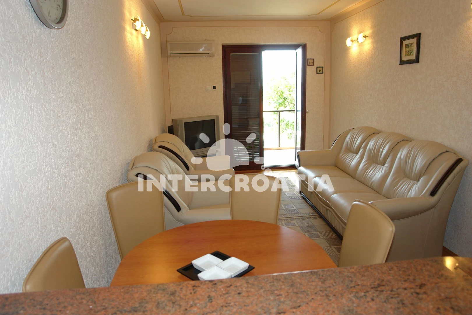 Apartmán (42 m2) s balkonem, a výhledem na moře. Nachází se v 1. patře objektu. Apartmán má 1 ložnici a je vhodný pro až 5 osob. Kuchyňská linka je vybavena varnou deskou, troubou, mikrovlnnou troubou, rychlovarnou konvicí, nádobím, lednicí, mrazákem. V obývací místnosti je rozložitelná pohovka (extra lůžko pro 1 osobu). K dispozici televize se satelitním programem, žehlička. Koupelna s vanou, umyvadlem, fénem a WC.