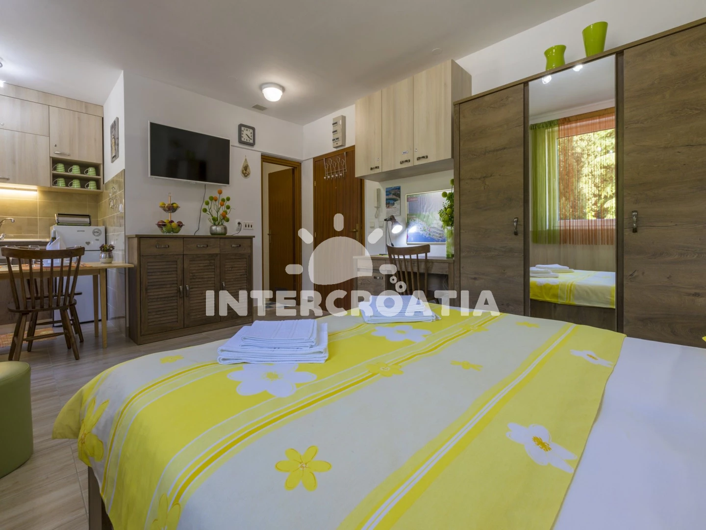 Apartmán typu studio (27 m2). Nachází se v 1. patře objektu. Kuchyňská linka je vybavena varnou deskou, toustovačem, kávovarem, rychlovarnou konvicí, nádobím, lednicí, mrazákem. K dispozici dvoulůžko…