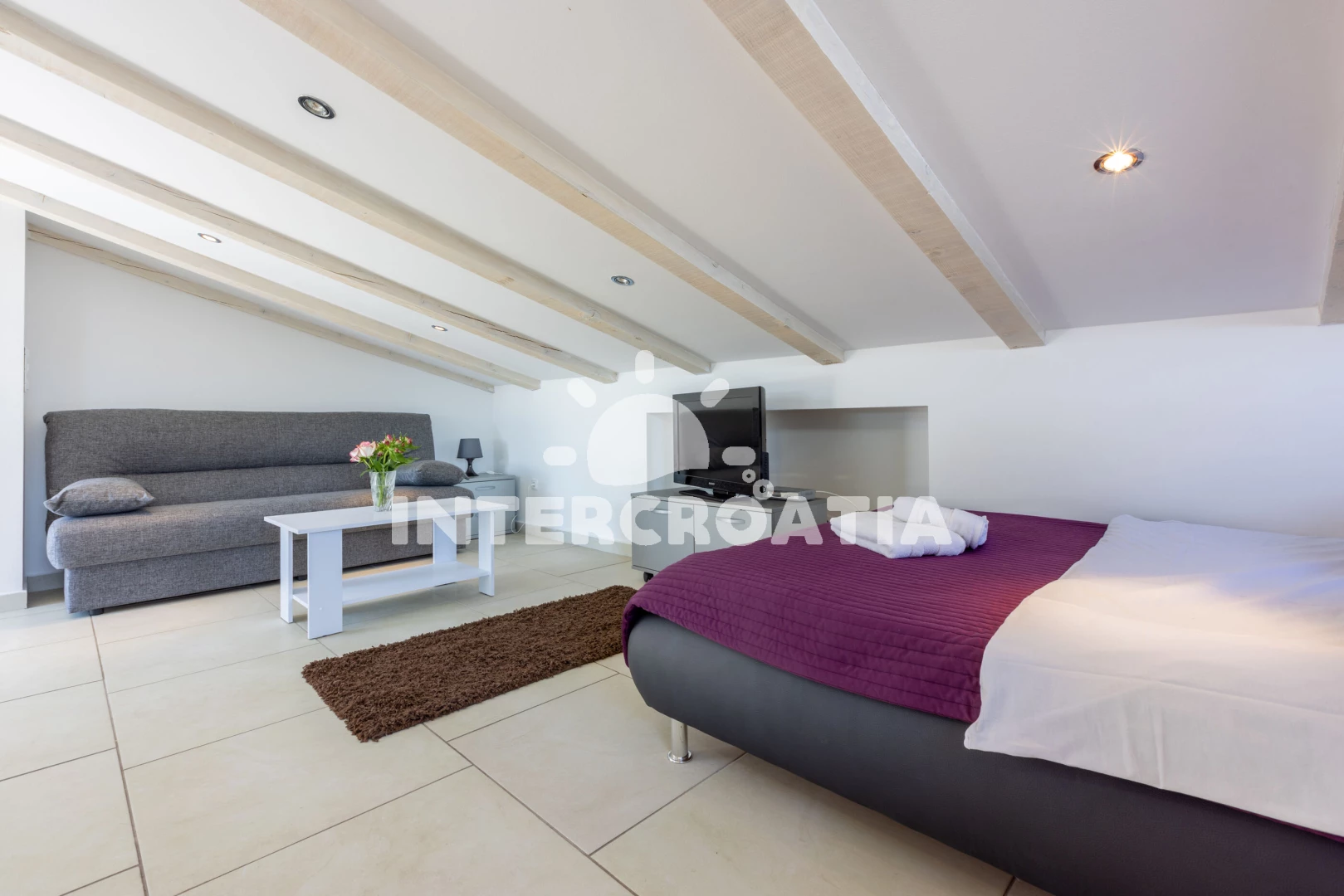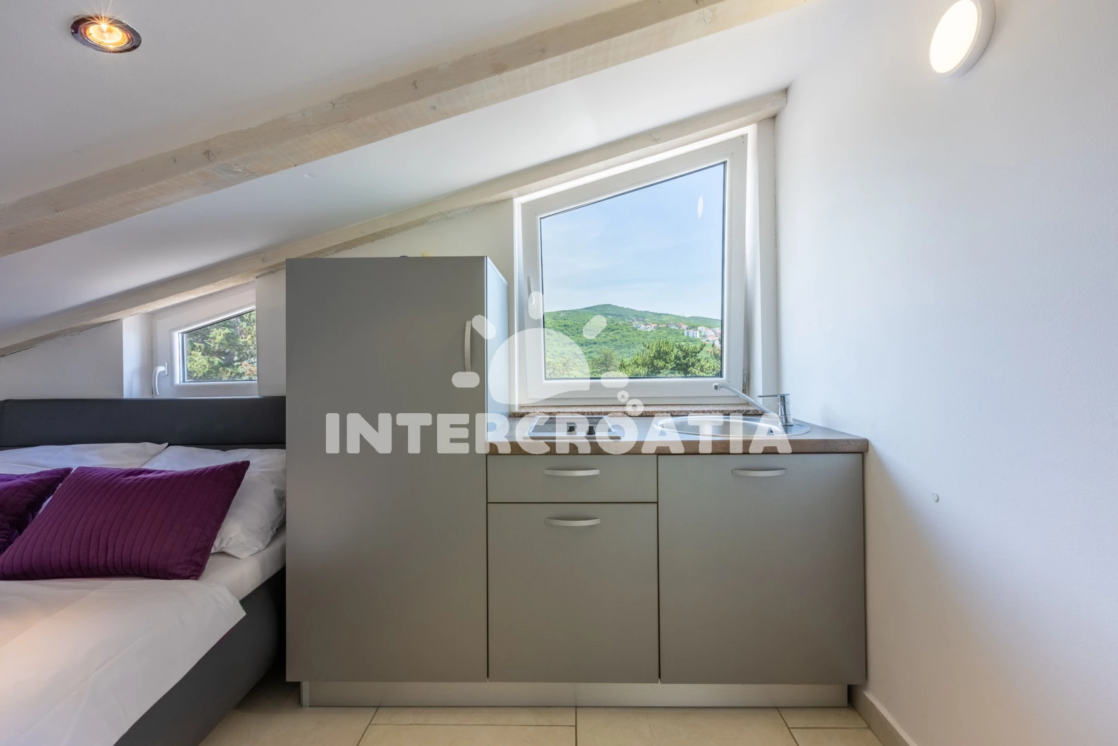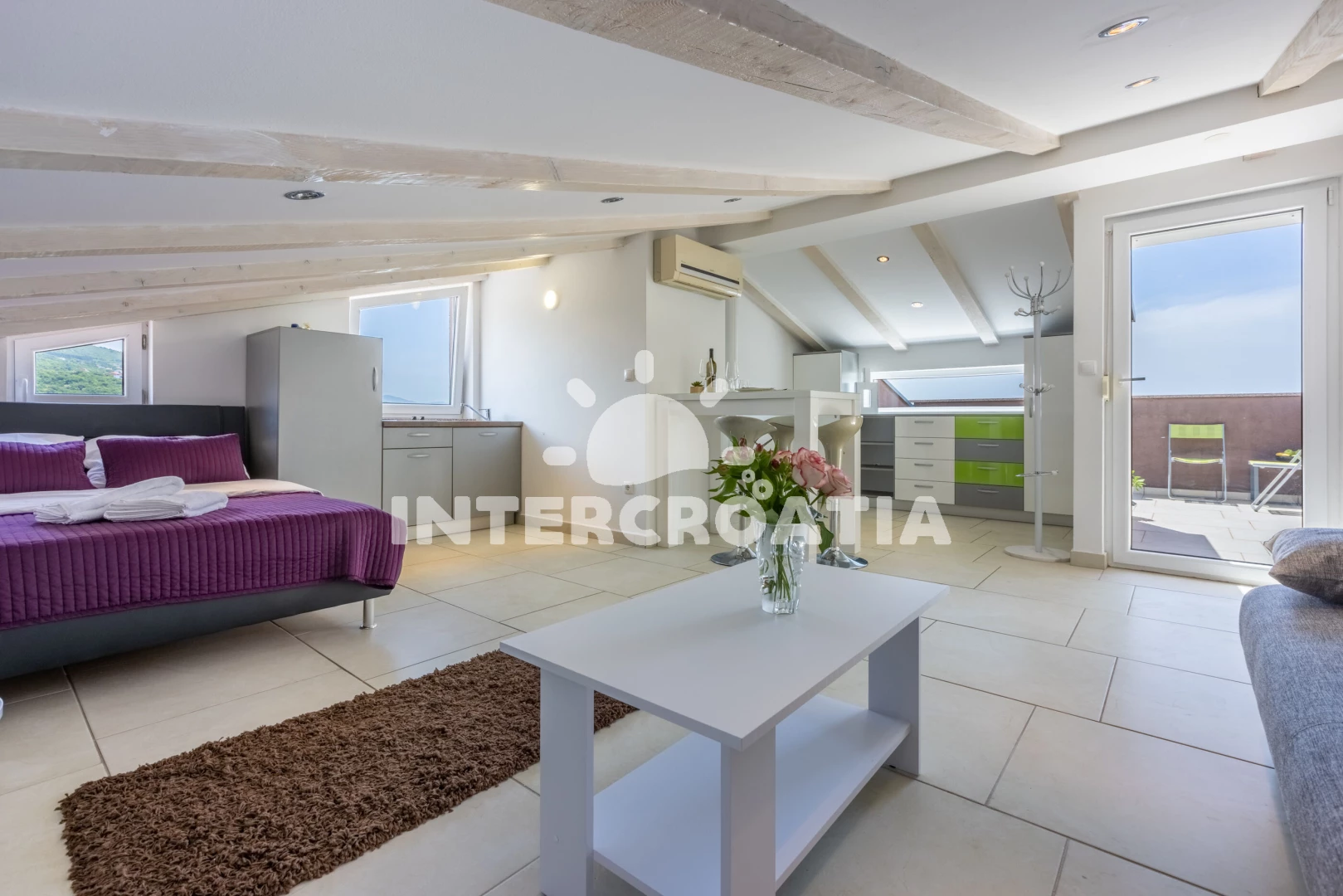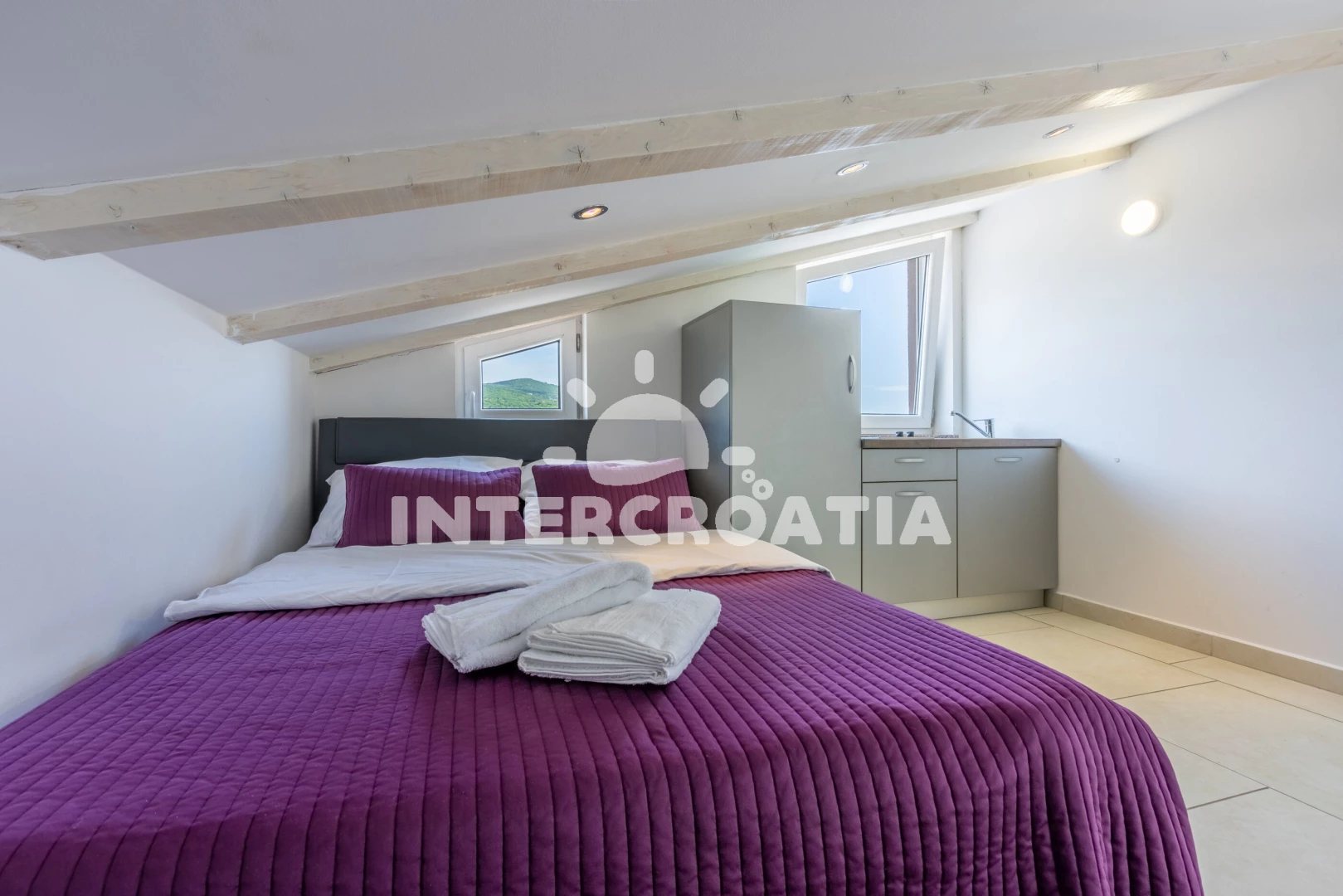 Apartmán typu studio (21 m2) s balkonem, a výhledem na moře. Nachází se v podkroví objektu. Kuchyňská linka je vybavena varnou deskou, toustovačem, rychlovarnou konvicí, nádobím, lednicí, mrazákem. K…