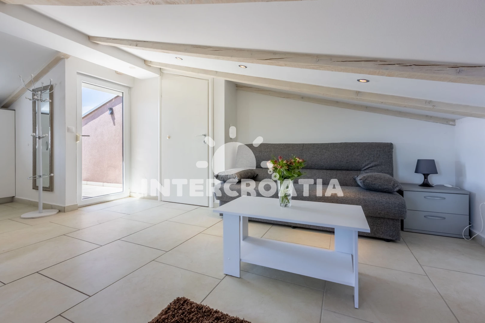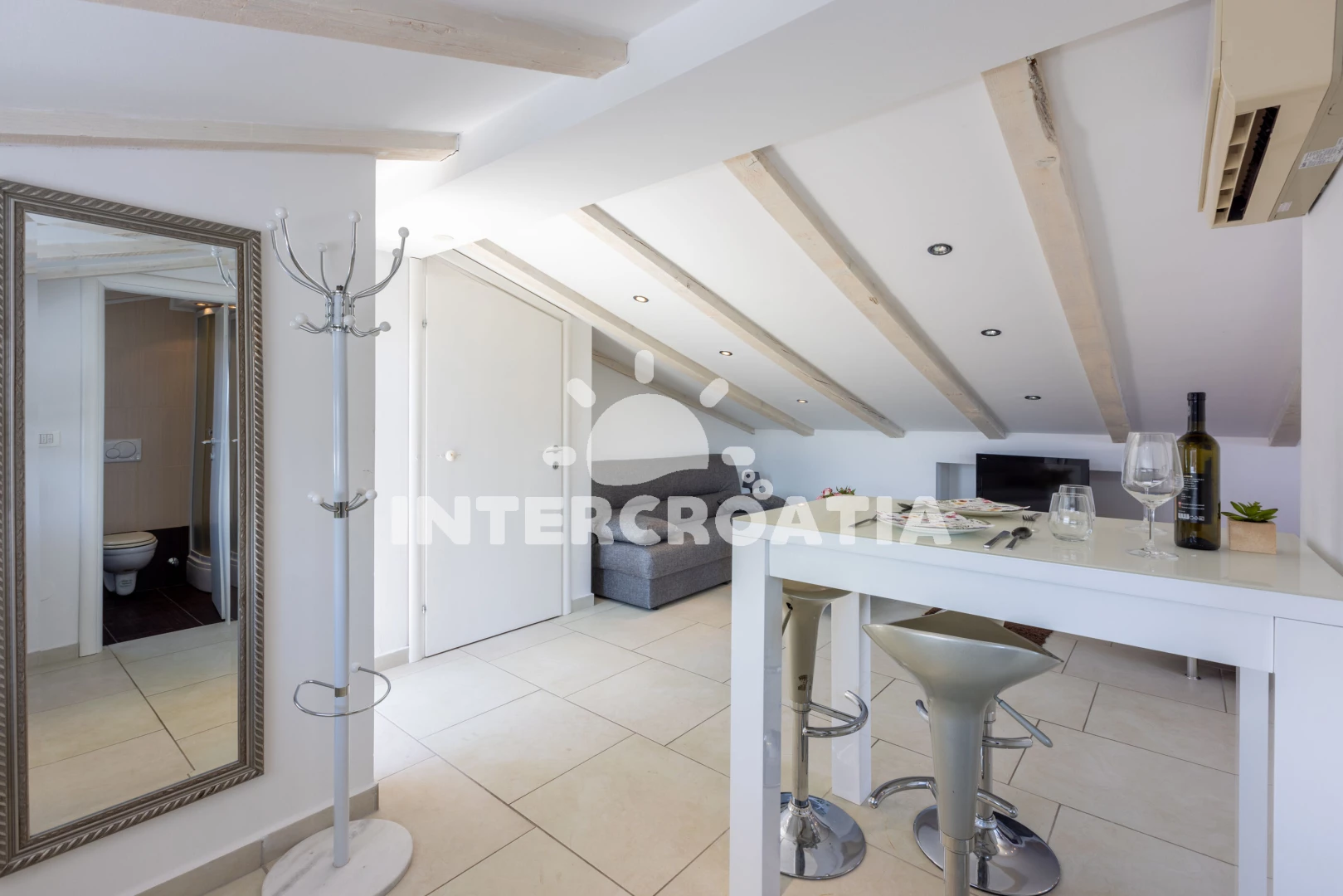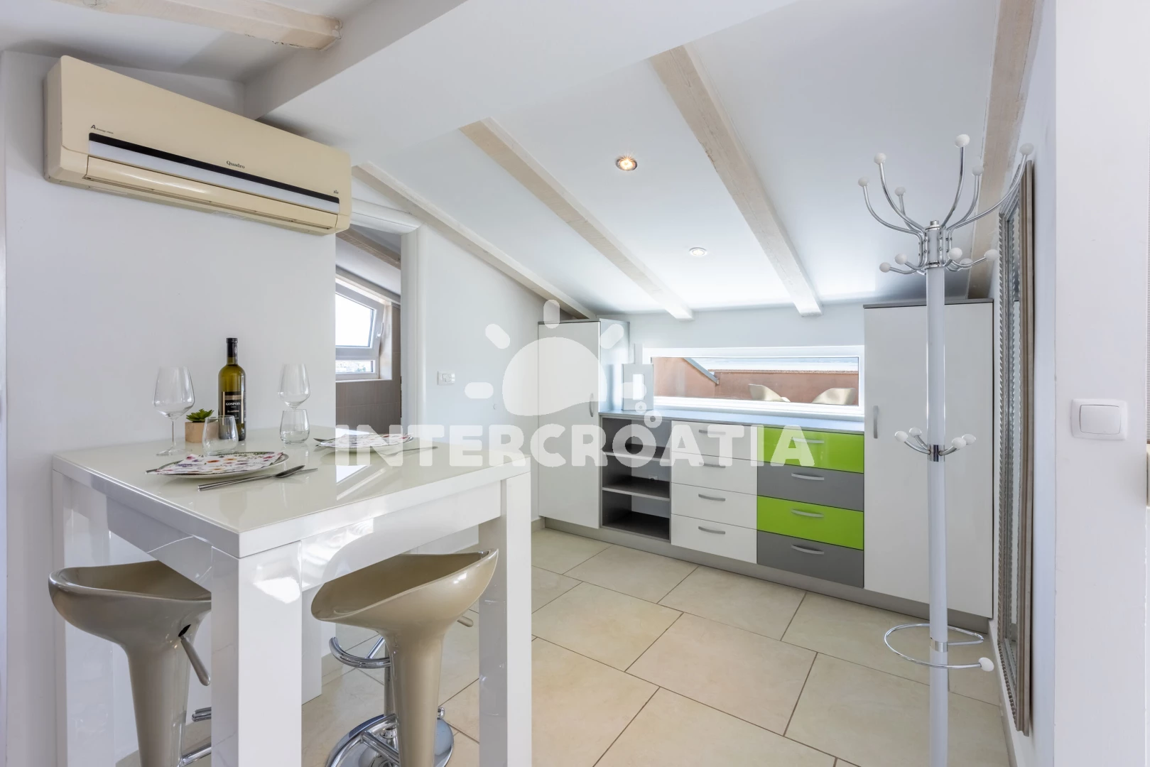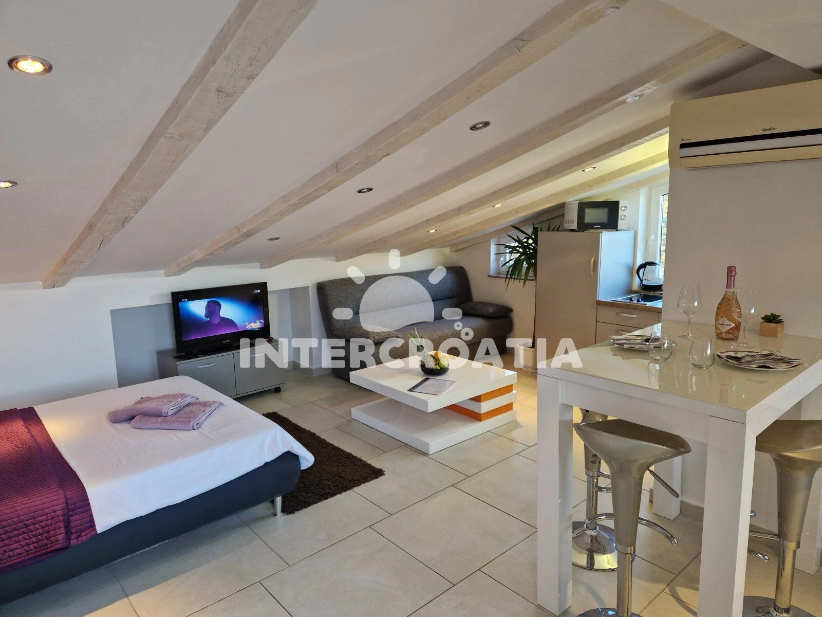 Apartmán typu studio (21 m2) s balkonem, a výhledem na moře. Nachází se v podkroví objektu. Kuchyňská linka je vybavena varnou deskou, toustovačem, rychlovarnou konvicí, nádobím, lednicí, mrazákem. K…