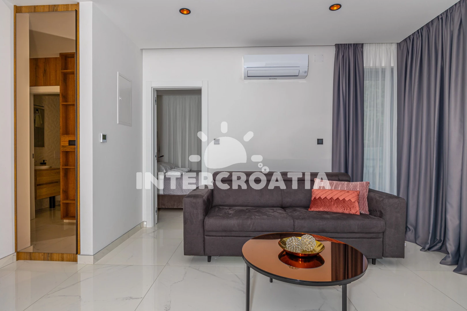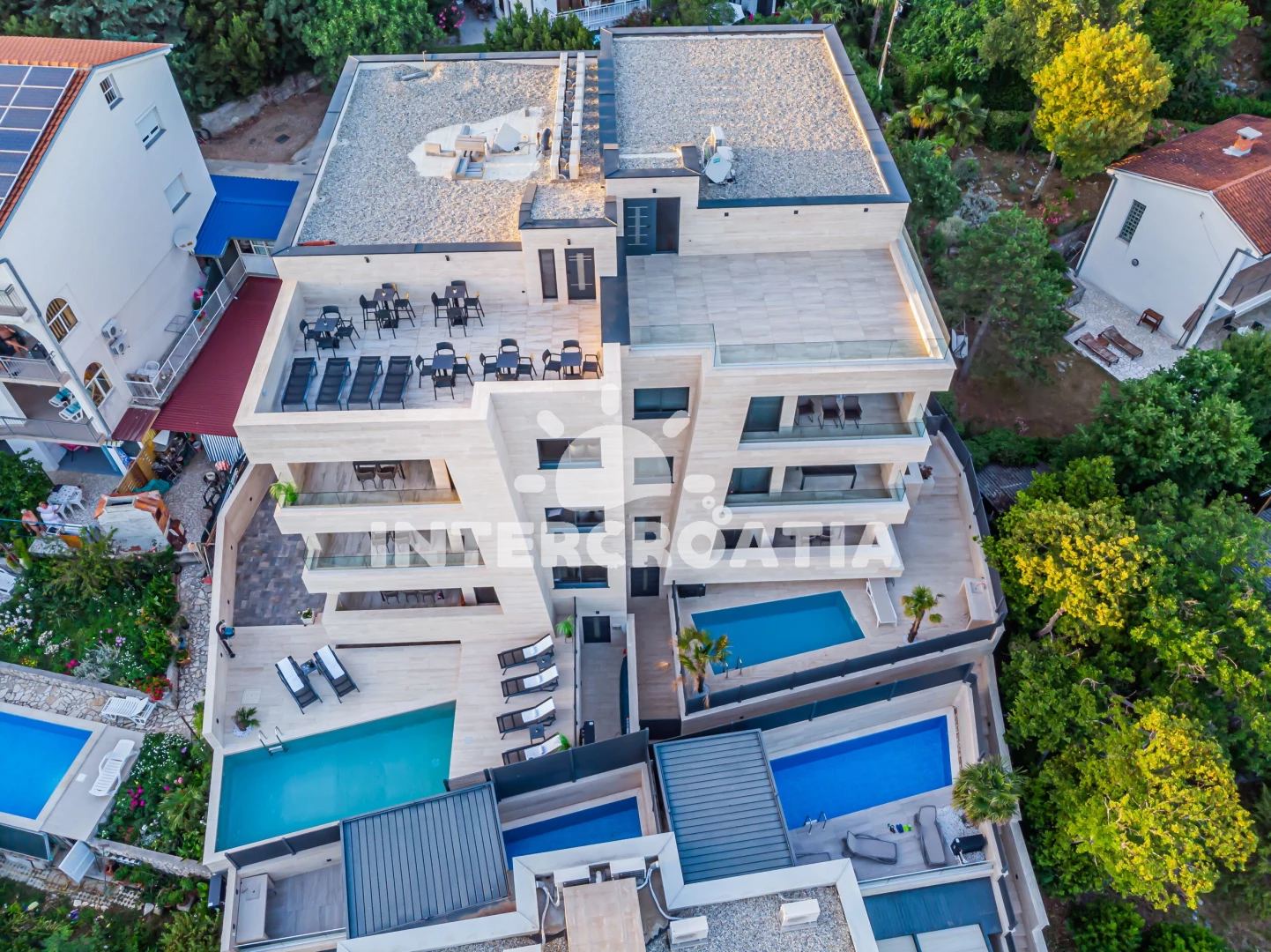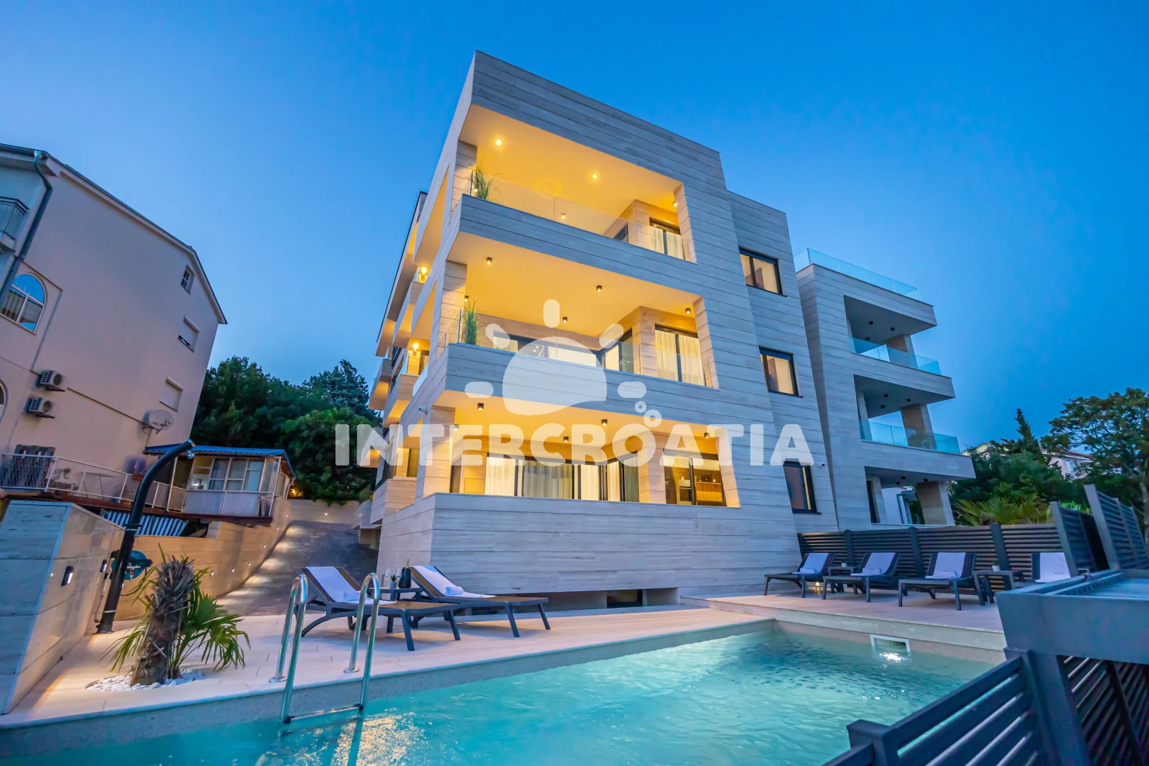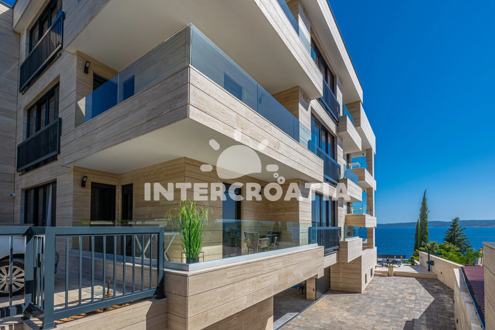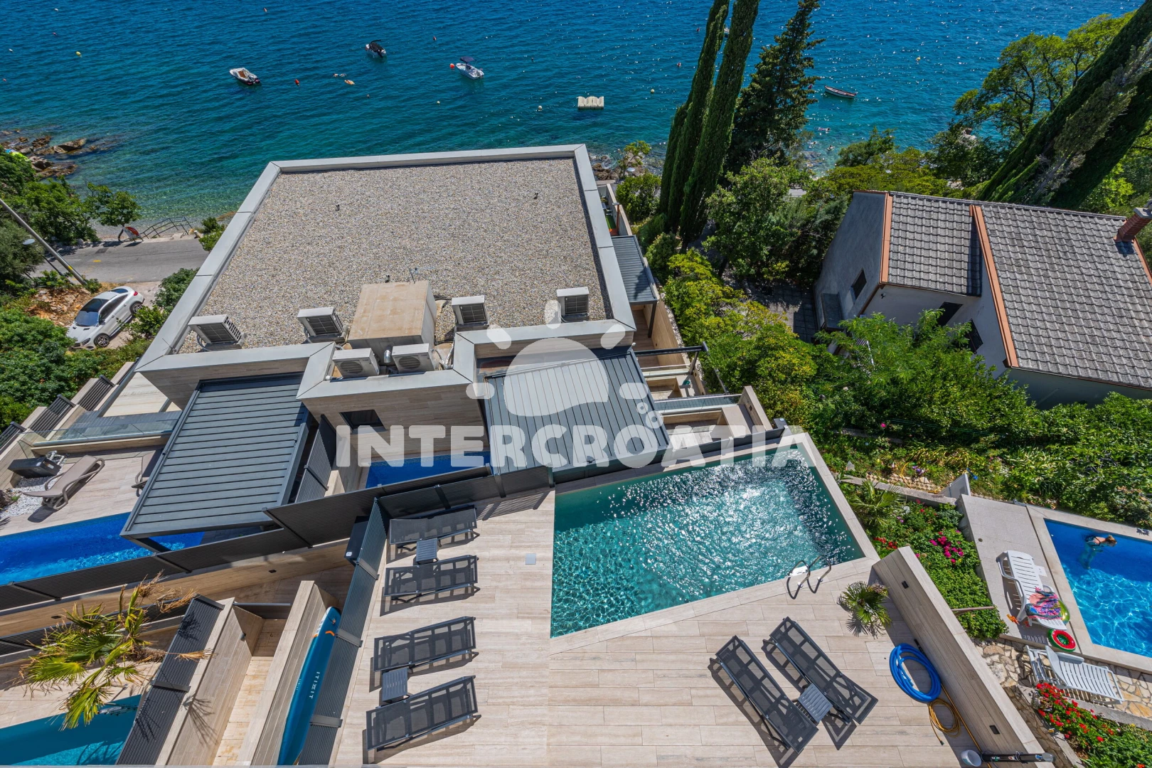 Apartmán se nachází 20 m od moře a pláže. Pláž je skalnatá a oblázková. Apartmán disponuje bazénem s lehátky pro ubytované hosty.