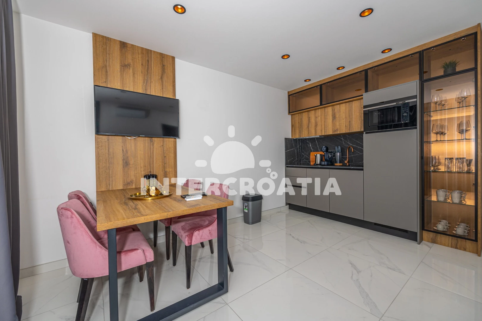 Apartmán (2) s balkonem. Nachází se v objektu. Kuchyňská linka je vybavena varnou deskou, kávovarem, myčkou na nádobí, mikrovlnnou troubou, rychlovarnou konvicí, nádobím, lednicí, mrazákem. V obývací…