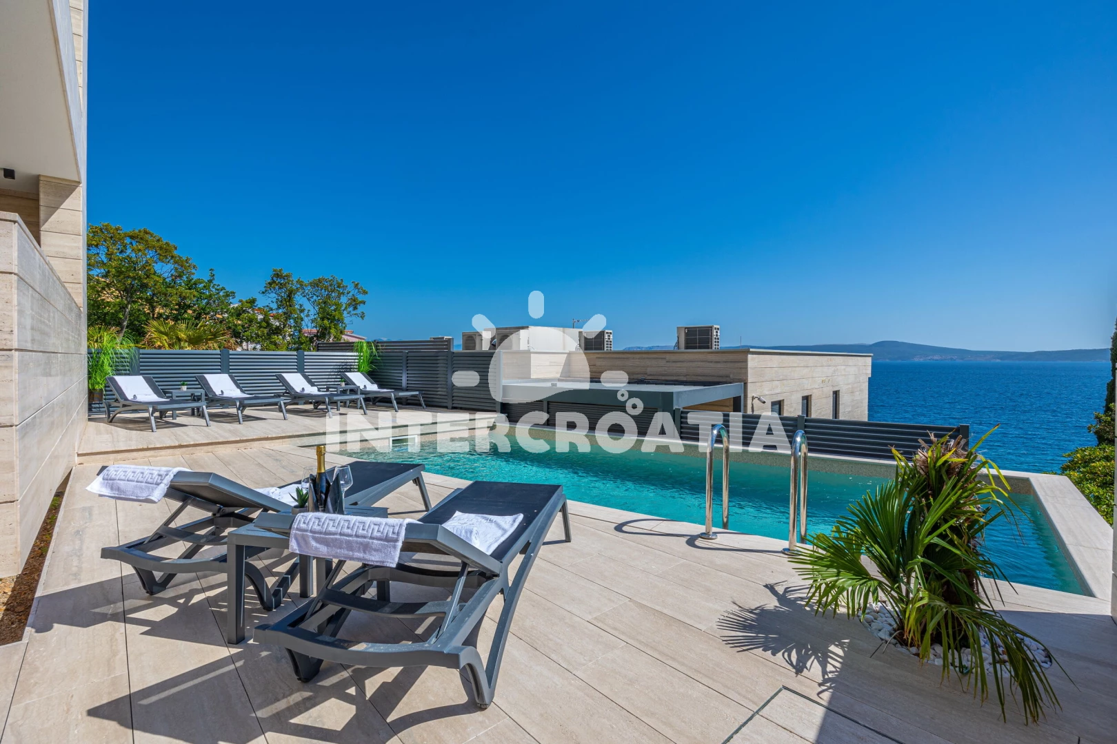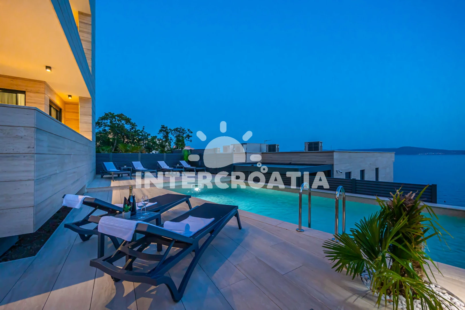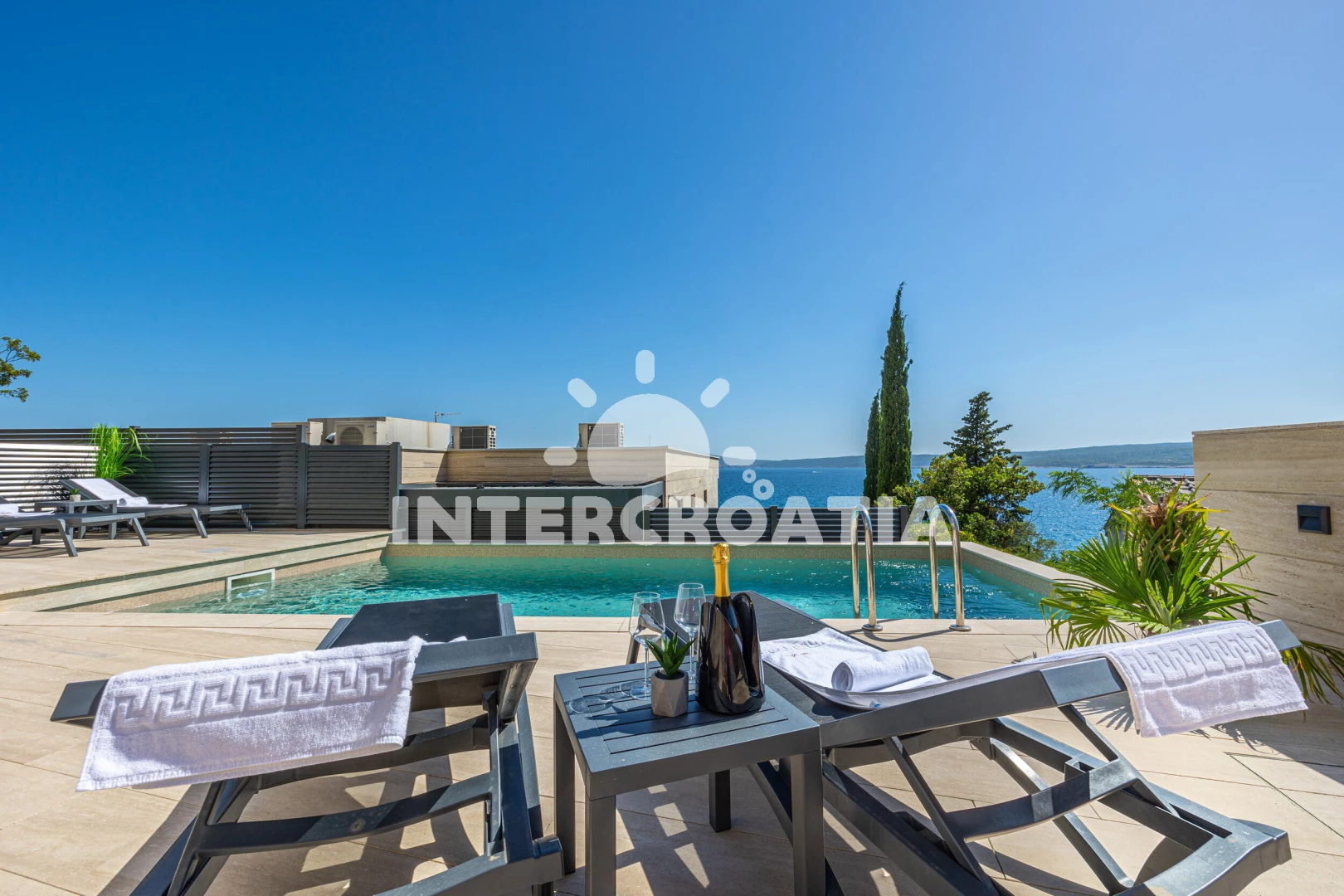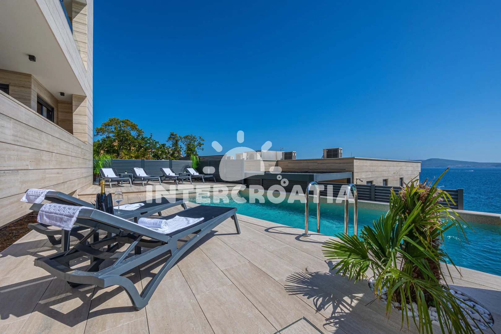 Apartmán se nachází 20 m od moře a pláže. Pláž je skalnatá a oblázková. Apartmán disponuje bazénem s lehátky pro ubytované hosty.