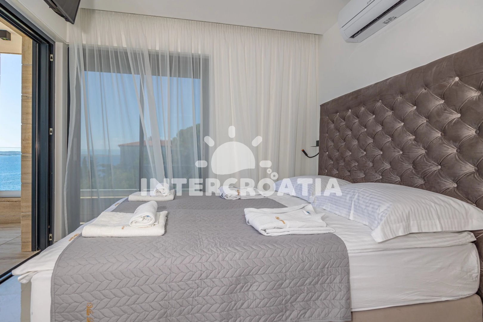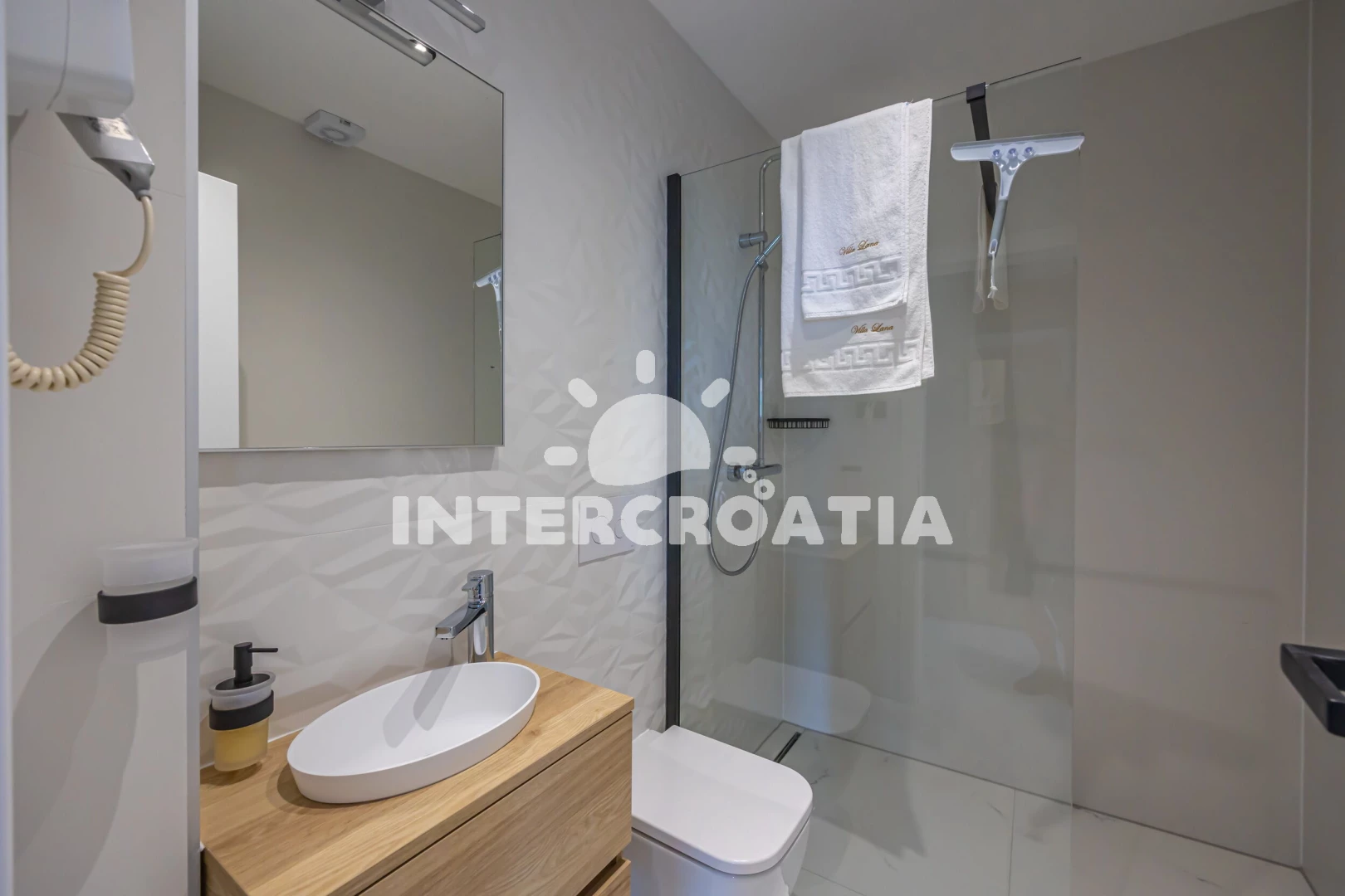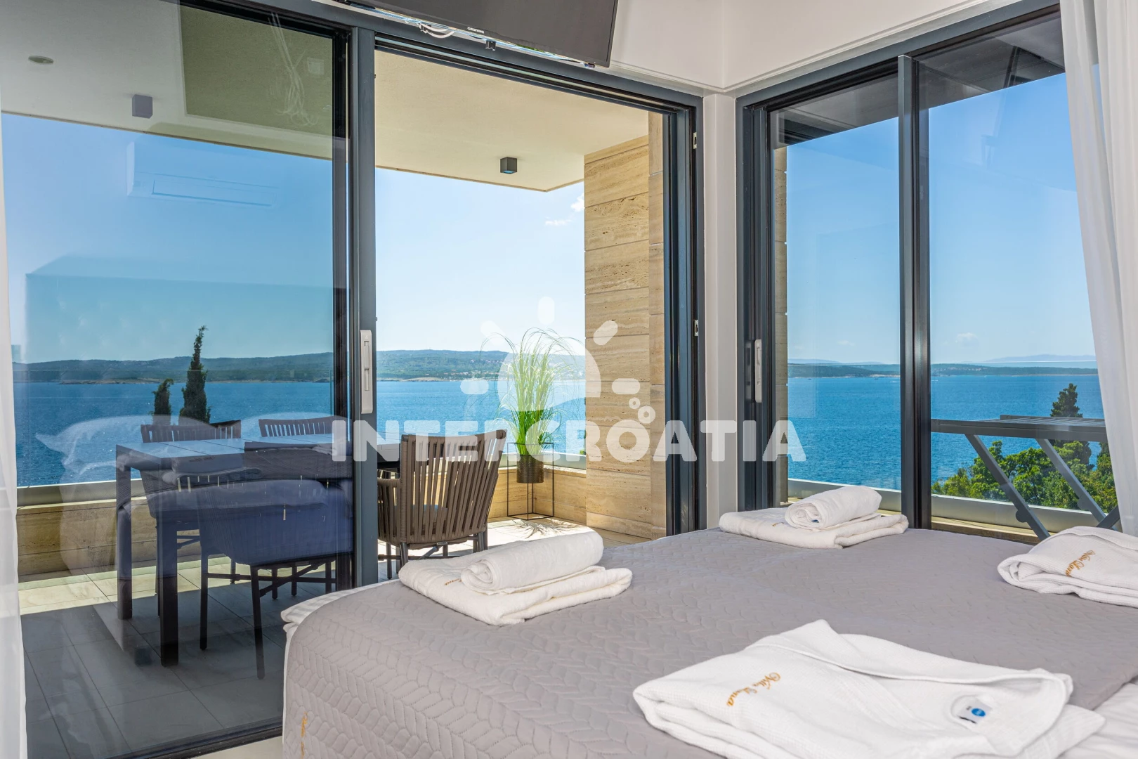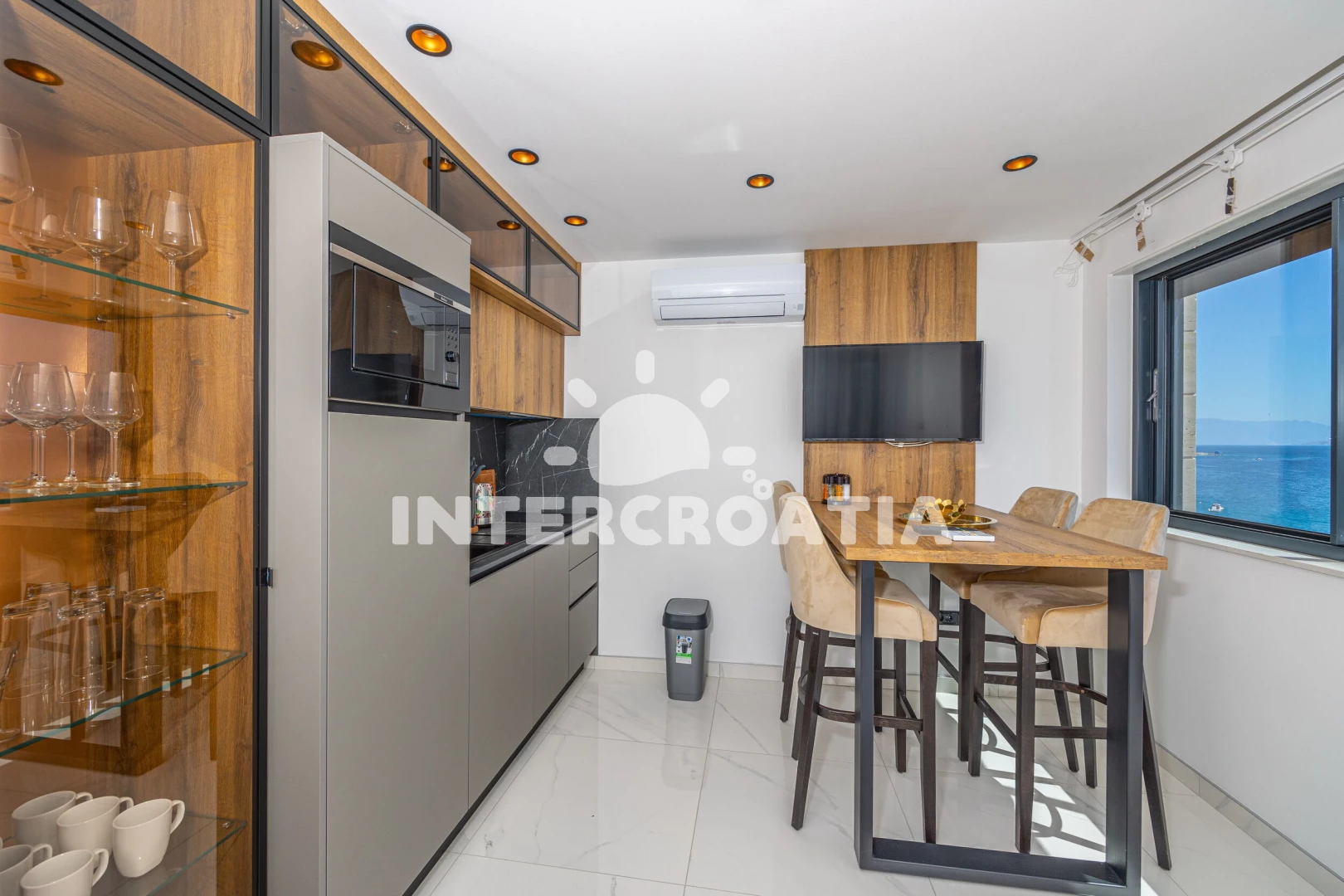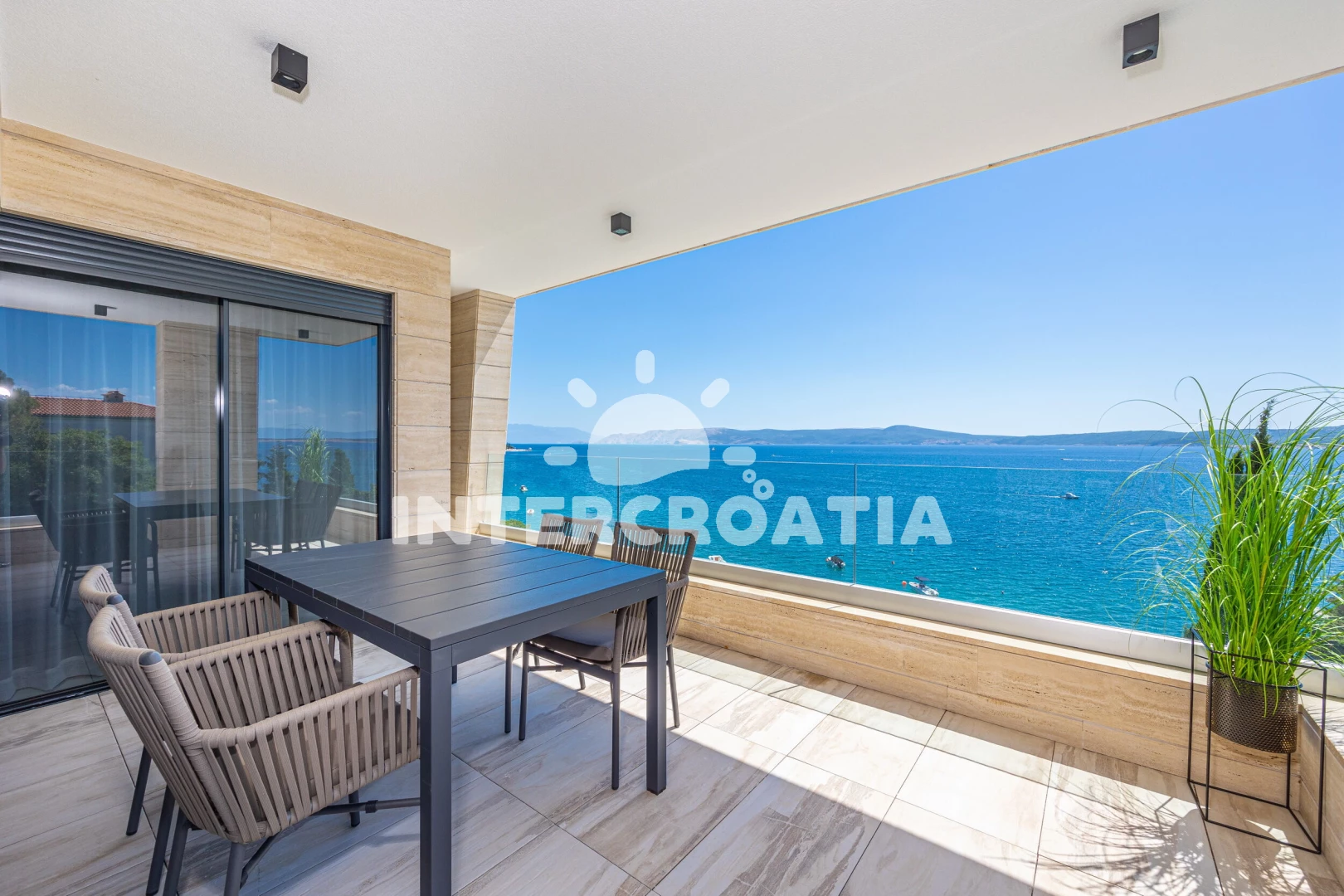 Apartmán se nachází 20 m od moře a pláže. Pláž je skalnatá a oblázková. Apartmán disponuje bazénem s lehátky pro ubytované hosty.
