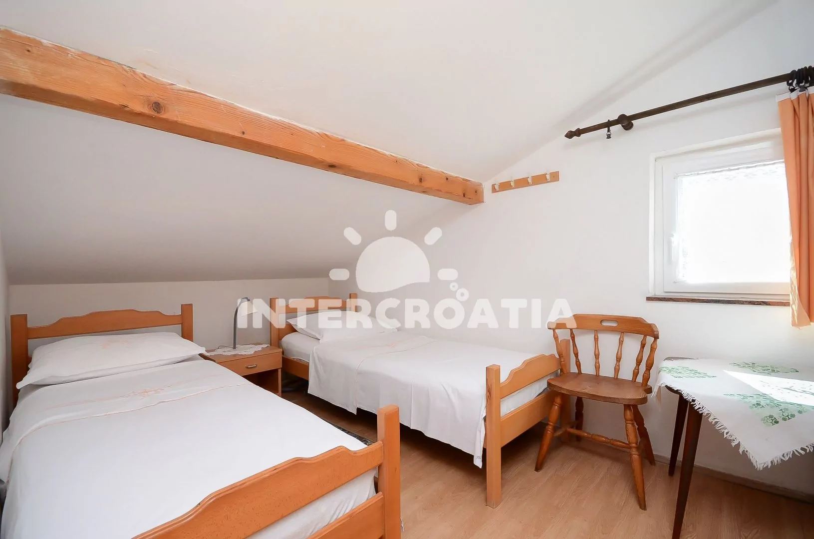 Čtyřpokojový apartmán se dvěma koupelnami a terasou, nacházející se v podkroví. Vstup, obývací místnost spojená s kuchyňským koutem. Kuchyňská linka se sporákem, troubou, lednicí s mrazákem, kávovarem a nádobím. Obývací pokoj s pohovkou a televizí. První a druhá ložnice s dvoulůžkem, třetí ložnice s dvěma jednolůžky. Dvě koupelny, každá se sprchovým koutem, umyvadlem a wc. Hosté mají k dispozici terasu s posezením a výhledem na záliv. Parkování u objektu.