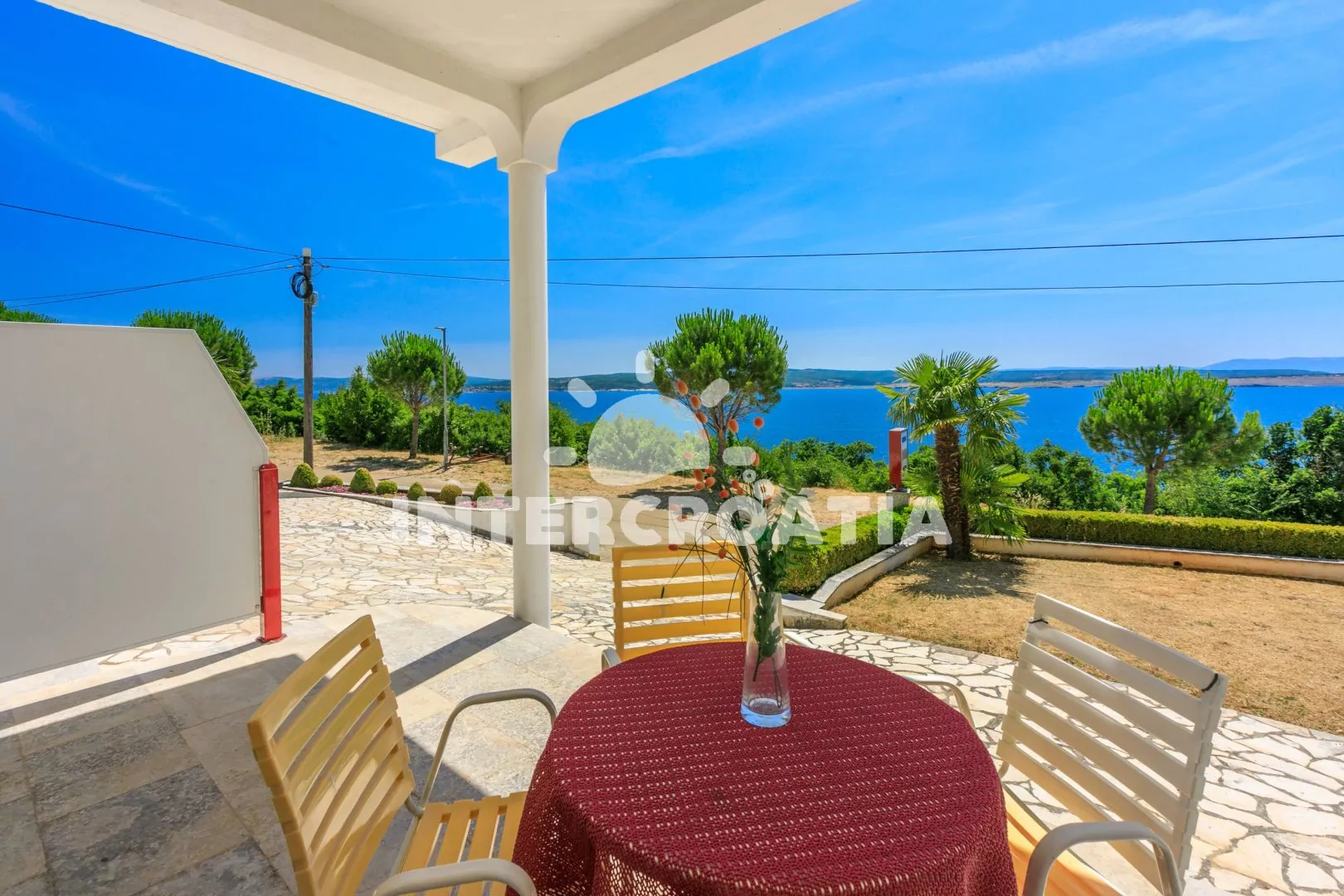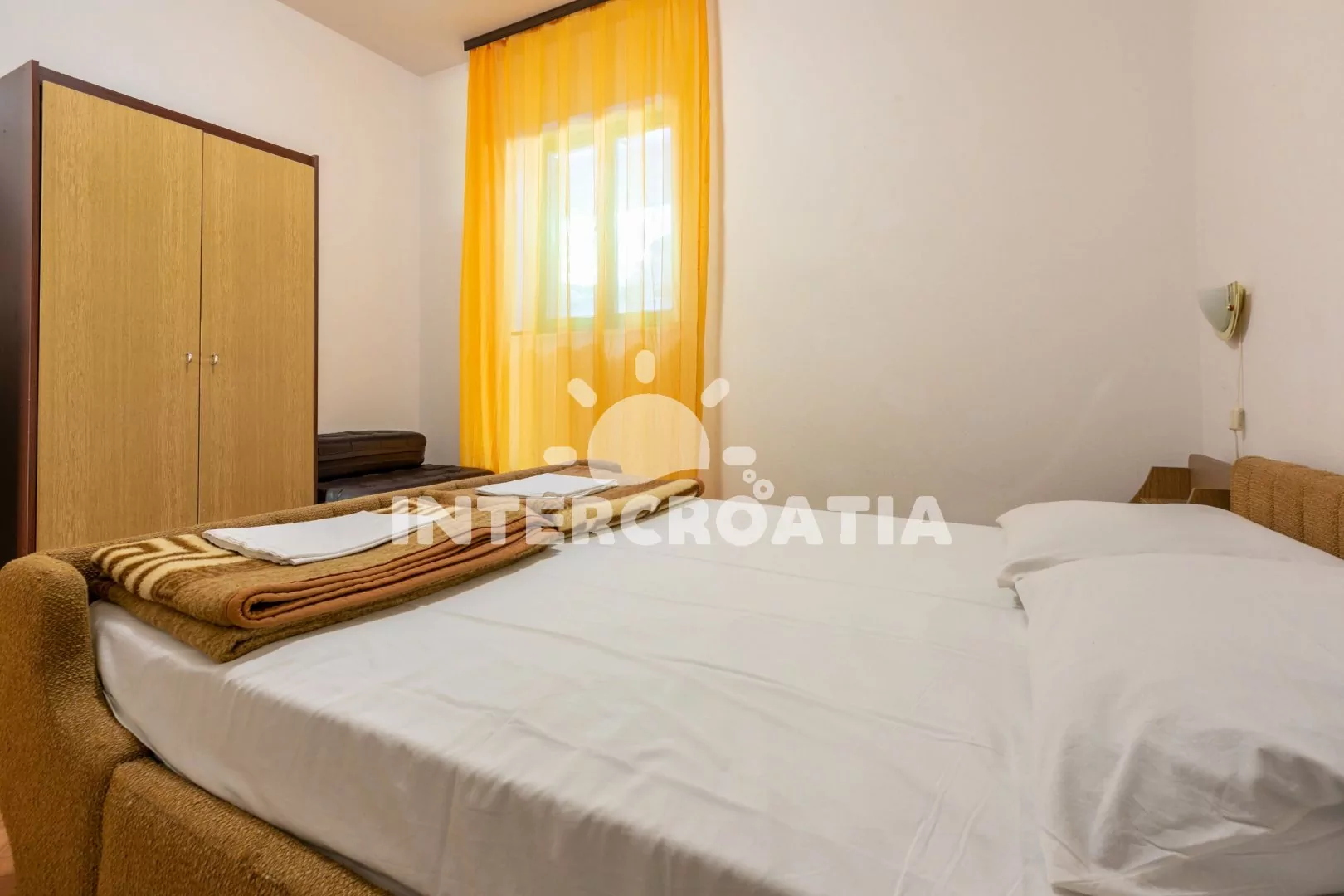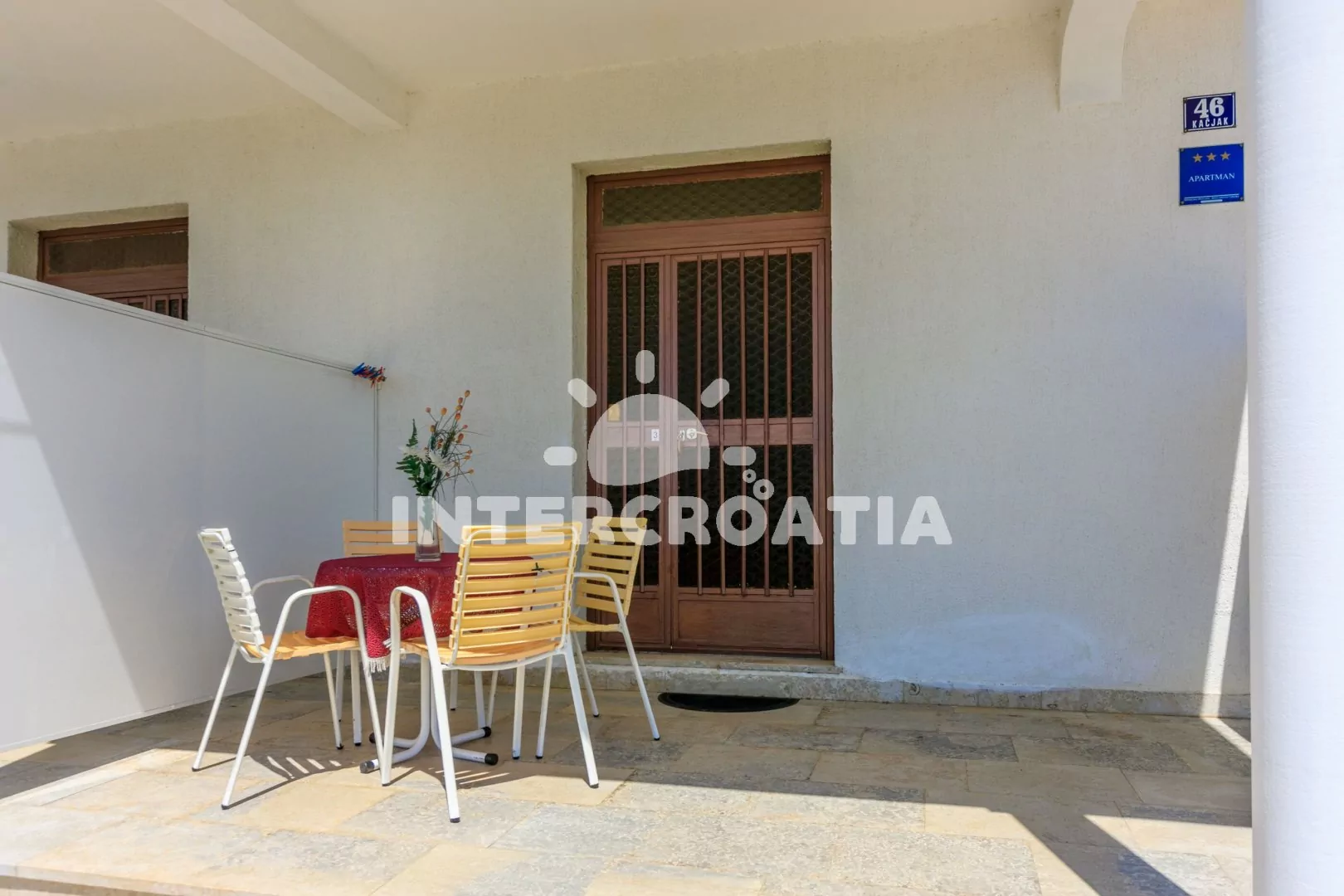 Apartmán (36 m2) s výhledem na moře a terasou s posezením se nachází v přízemí domu a je vhodný pro 2 až 4 osoby. Obývací pokoj je spojený s kuchyní. Kuchyňská linka je vybavena dvouplotýnkovým vařičem, kávovarem, nádobím a lednicí s mrazákem. Obývací pokoj s jídelním stolem, pohovkou (rozložitelná na extra lůžko pro 2 osoby), televizí se satelitním programem, klimatizací a vstupem na terasu. Ložnice s jedním dvoulůžkem. Koupelna se sprchovým koutem, umyvadlem a wc. Hostům je k dispozici parkování u objektu zdarma.