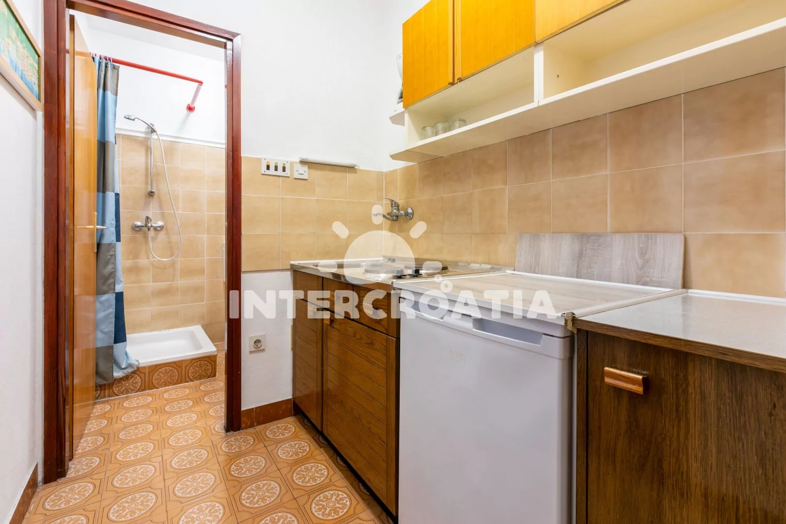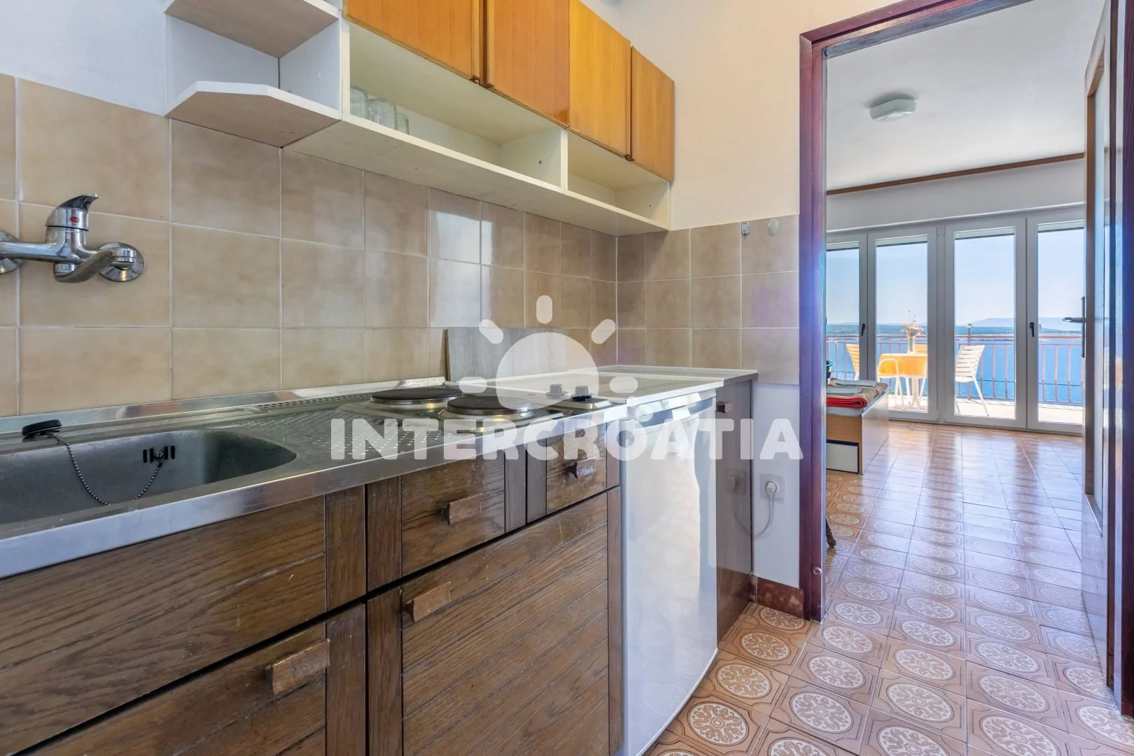 Apartmán typu studio (26 m2) s výhledem na moře a terasou s posezením se nachází v 1. patře domu a je vhodný pro 2 až 3 osoby. Kuchyňská linka je vybavena dvouplotýnkovým vařičem, kávovarem, nádobím…
