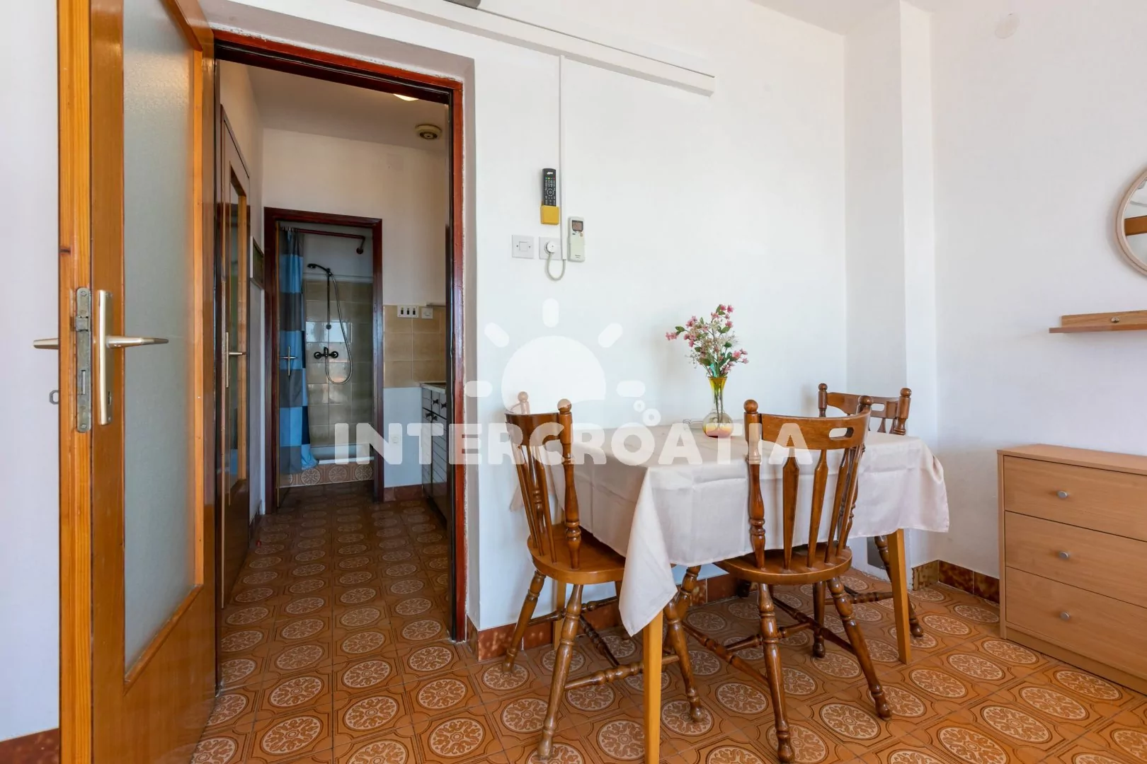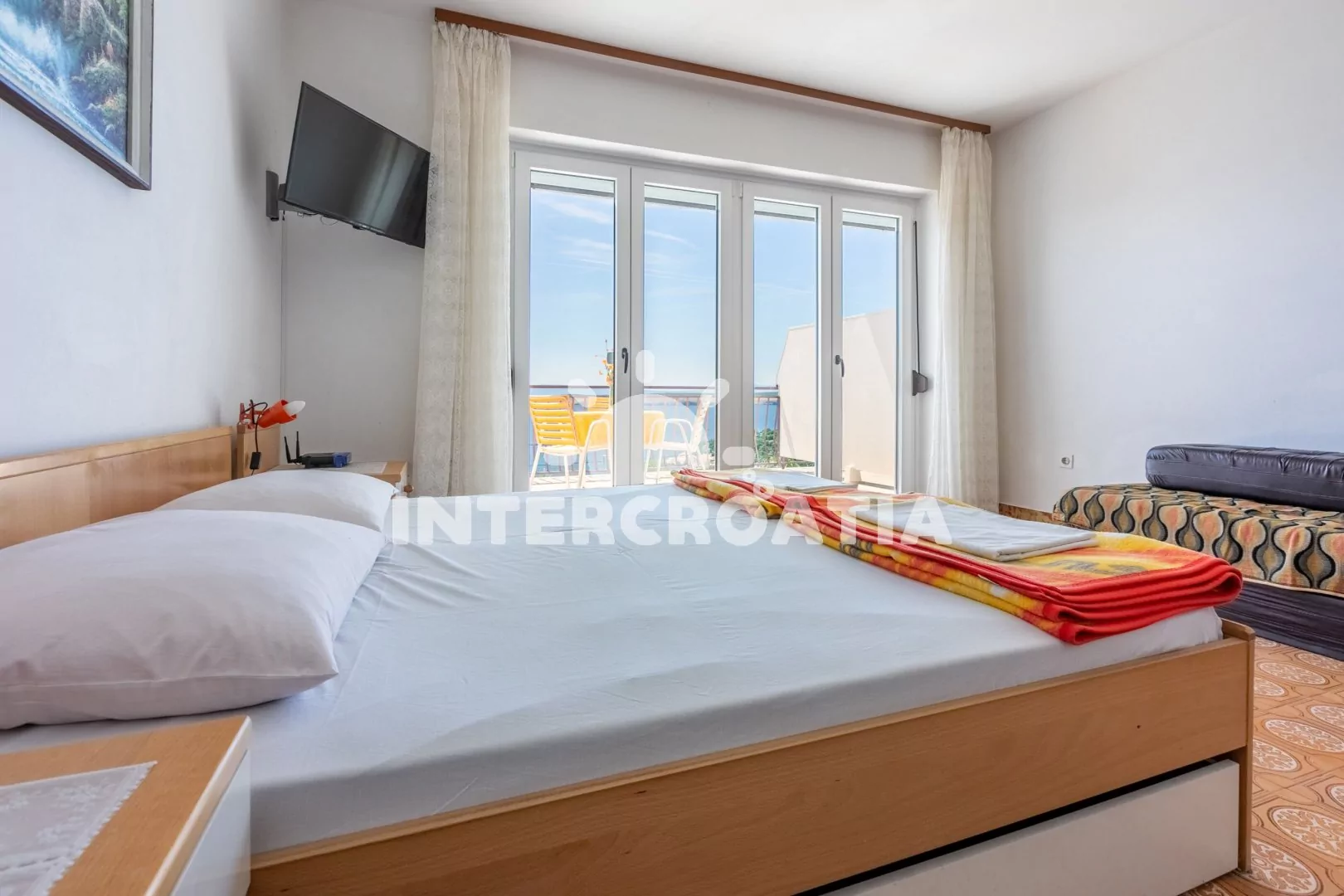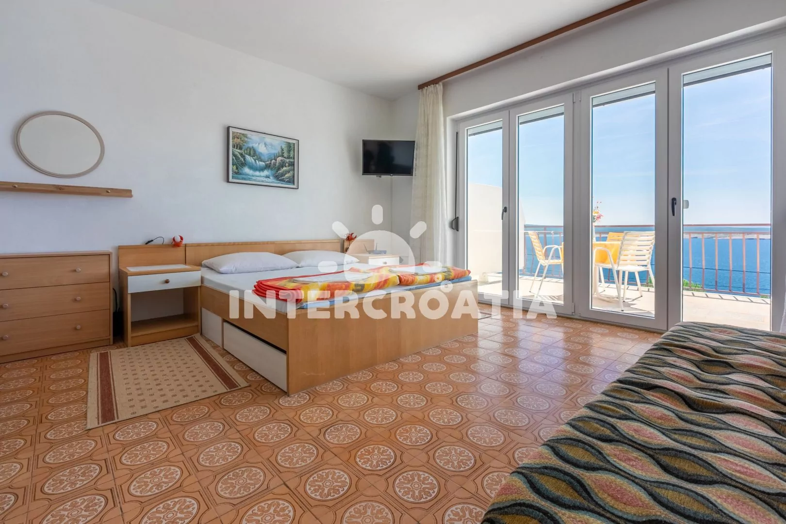 Apartmán typu studio (26 m2) s výhledem na moře a terasou s posezením se nachází v 1. patře domu a je vhodný pro 2 až 3 osoby. Kuchyňská linka je vybavena dvouplotýnkovým vařičem, kávovarem, nádobím a lednicí s mrazákem. Obývací místnost s jídelním stolem, pohovkou (rozložitelná na extra lůžko pro 1 osobu), televizí se satelitním programem, klimatizací, jedním dvoulůžkem a vstupem na terasu. Koupelna se sprchovým koutem, umyvadlem a wc. Hostům je k dispozici parkování u objektu zdarma.