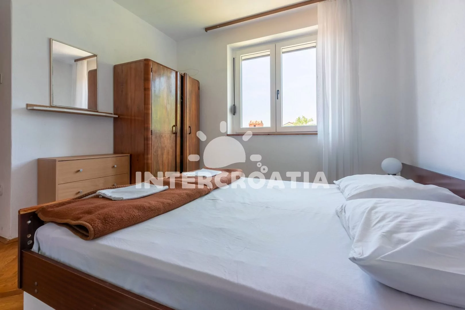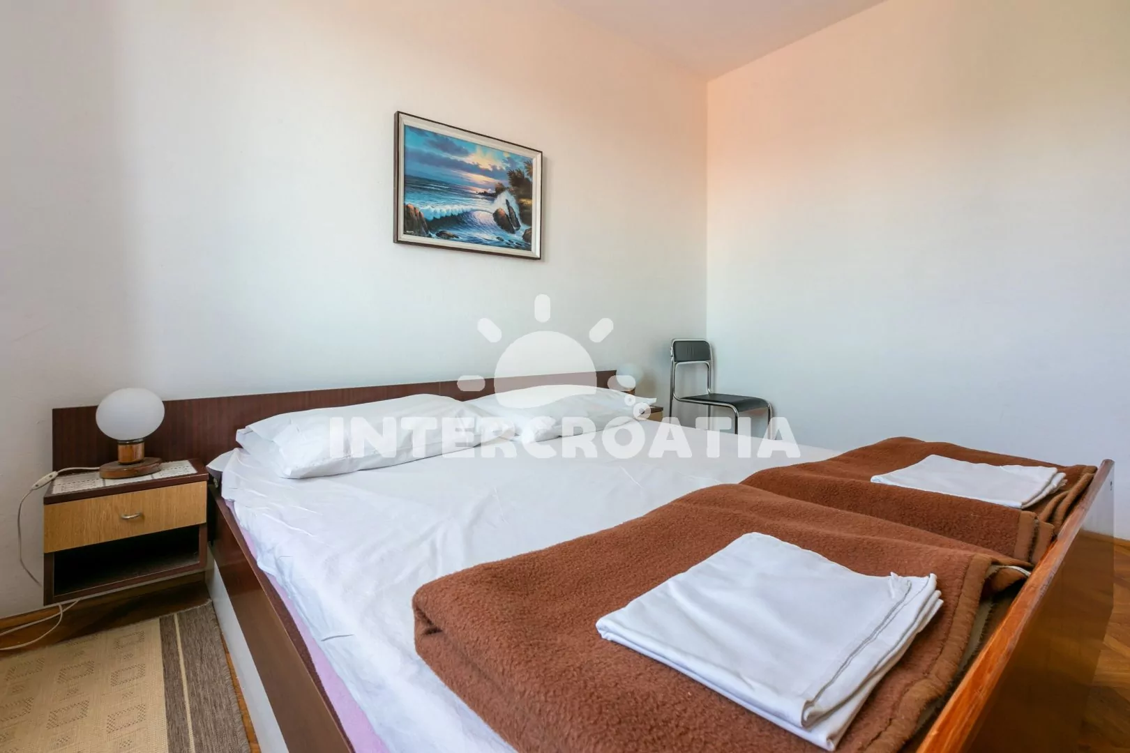 Apartmán s výhledem na moře a terasou s posezením se nachází v druhém patře a je vhodný pro 2 až 4 osoby. Obývací pokoj je spojený s kuchyní. Kuchyňská linka je vybavena dvouplotýnkovým sporákem, kávovarem, nádobím a lednicí s mrazákem. Obývací pokoj s jídelním stolem pro 4 osoby, pohovkou (rozložitelná na extra lůžko pro 2 osoby), televizí se satelitním programem, klimatizací a vstupem na terasu. Ložnice je vybavena jedním dvoulůžkem. Koupelna se sprchovým koutem, umyvadlem a wc. Hostům je k dispozici parkování u objektu zdarma.