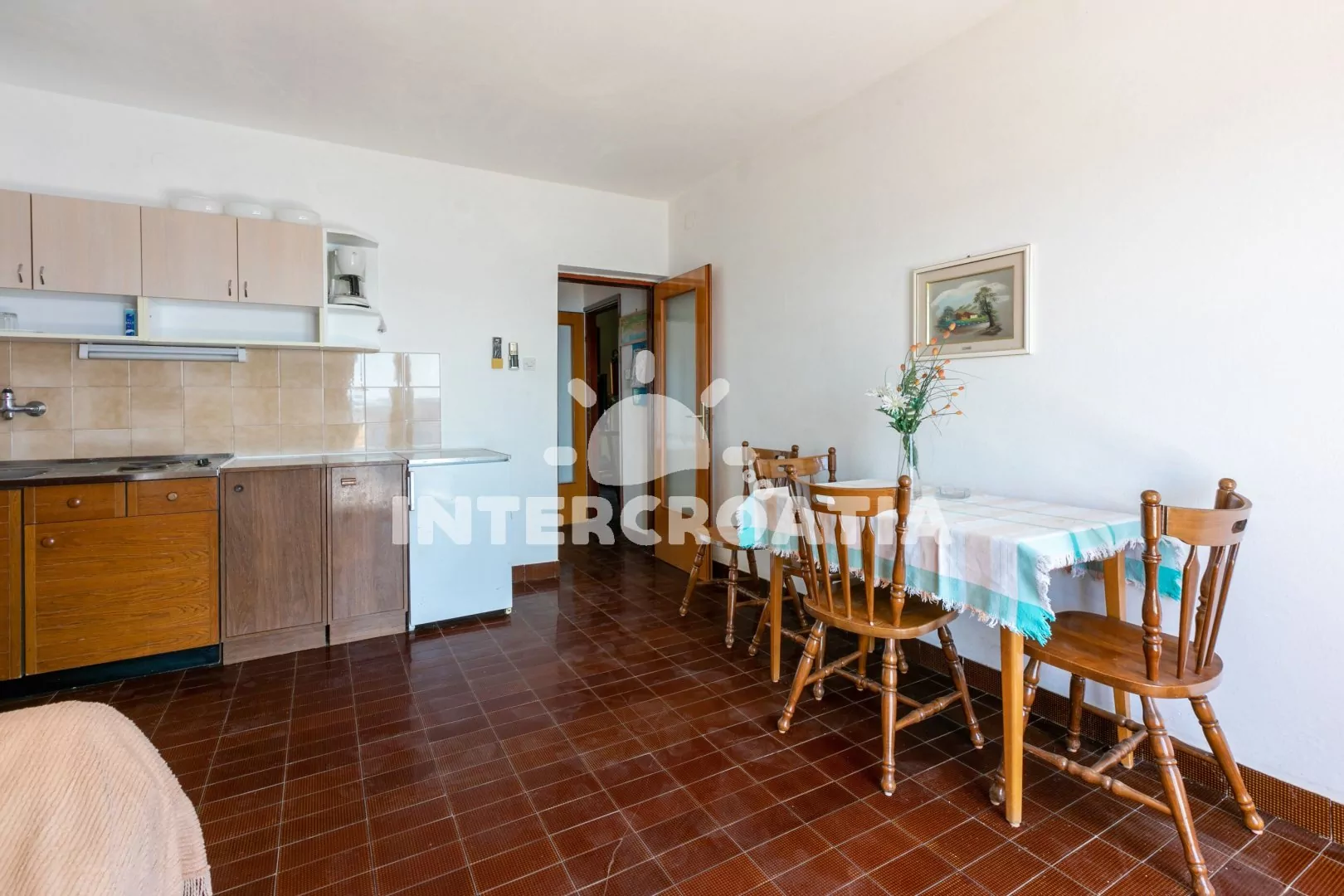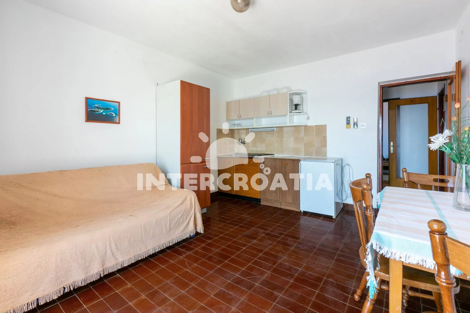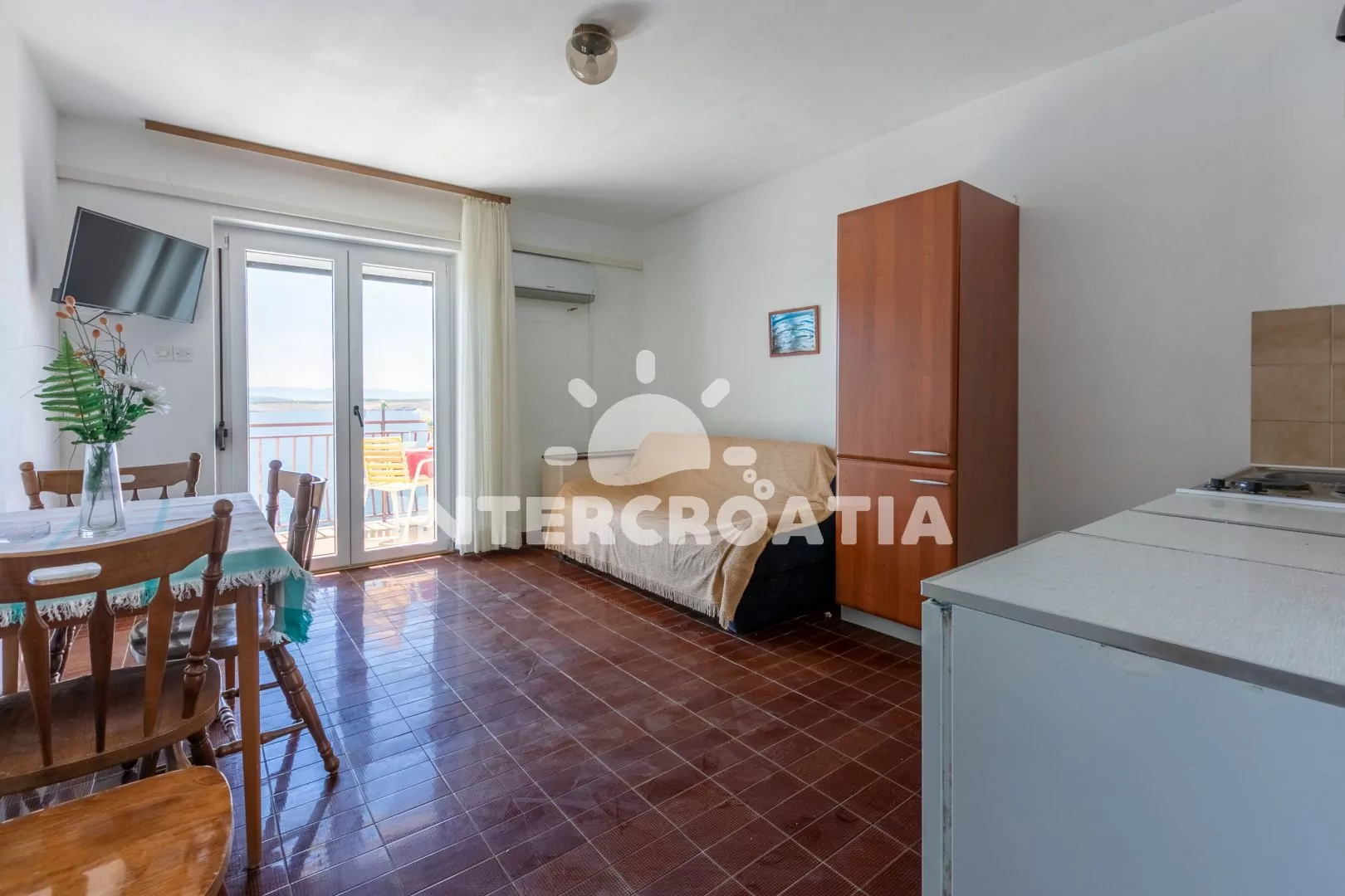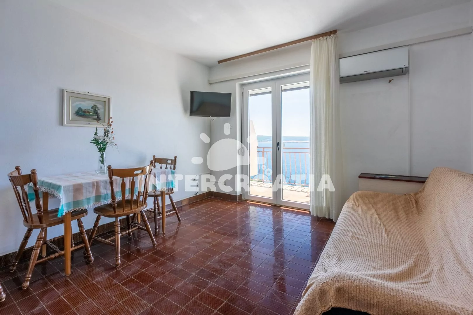Apartmán s výhledem na moře a terasou s posezením se nachází v druhém patře a je vhodný pro 2 až 4 osoby. Obývací pokoj je spojený s kuchyní. Kuchyňská linka je vybavena dvouplotýnkovým sporákem,…