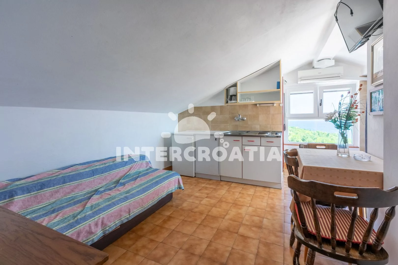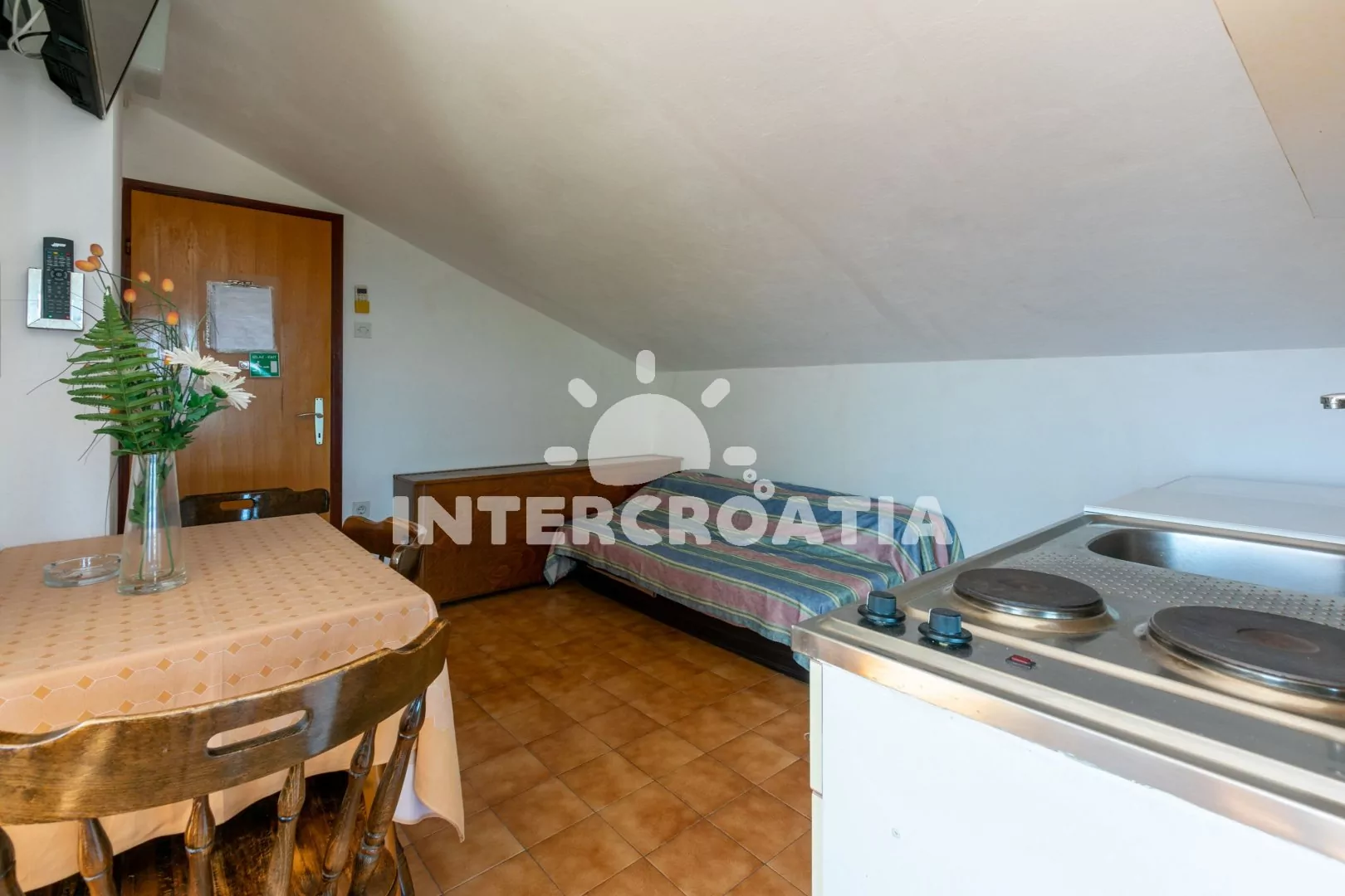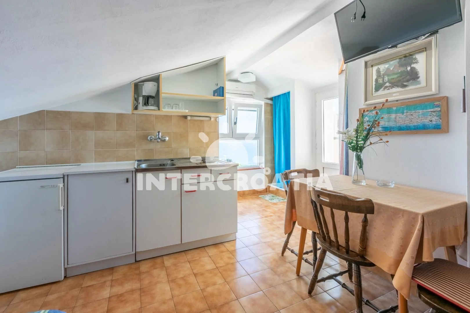 Podkrovní apartmán typu studio s výhledem na moře a terasou je vhodný pro 2 až 3 osoby. Obývací pokoj je spojený s kuchyní. Kuchyňská linka je vybavena dvouplotýnkovým sporákem, kávovarem, nádobím a lednicí s mrazákem. Obývací pokoj s jídelním stolem pro 3 osoby, pohovkou (rozložitelná na extra lůžko pro 1 osobu), televizí, klimatizací a vstupem na terasu. Částečně oddělena ložnice od obývacího pokoje je vybavena jedním dvoulůžkem. Koupelna s umyvadlem a wc, sprchový kout umístěný vedle koupelny (viz. foto). Hostům je k dispozici parkování u objektu zdarma.