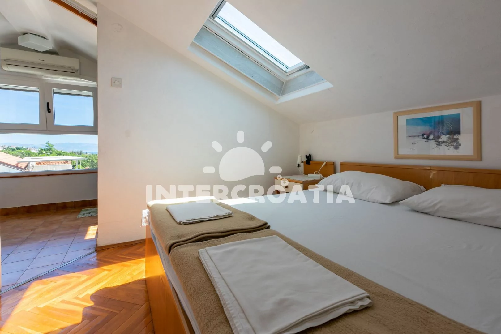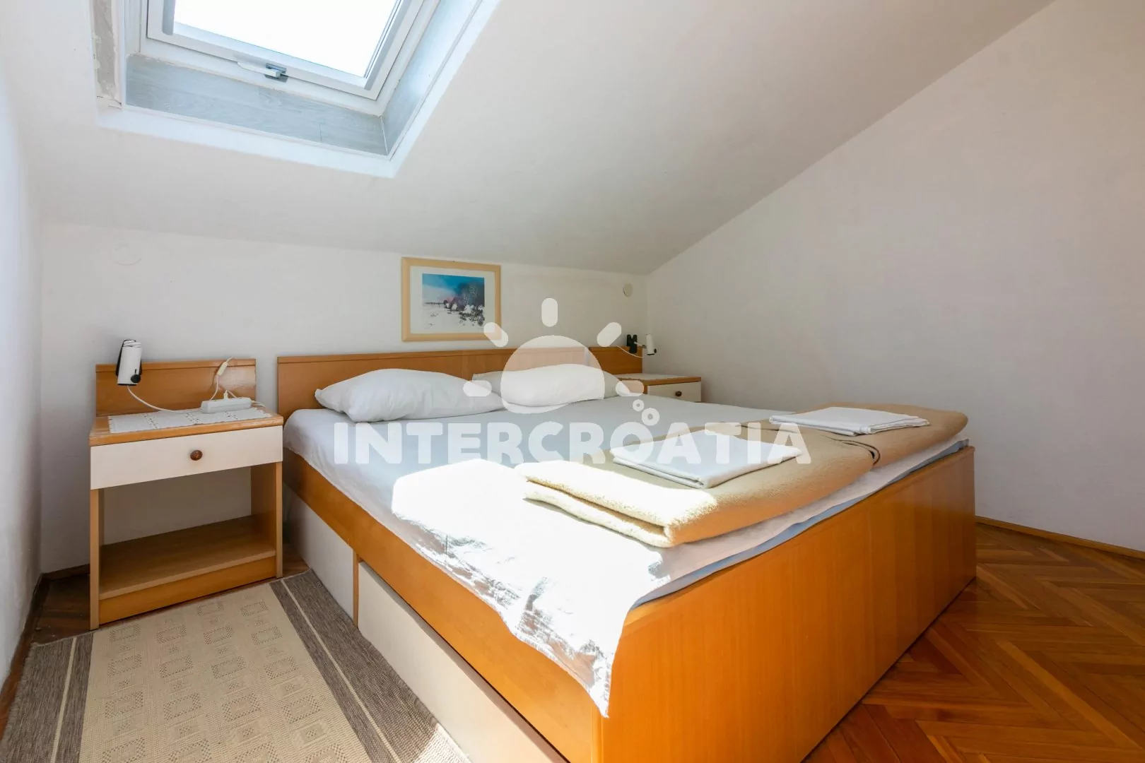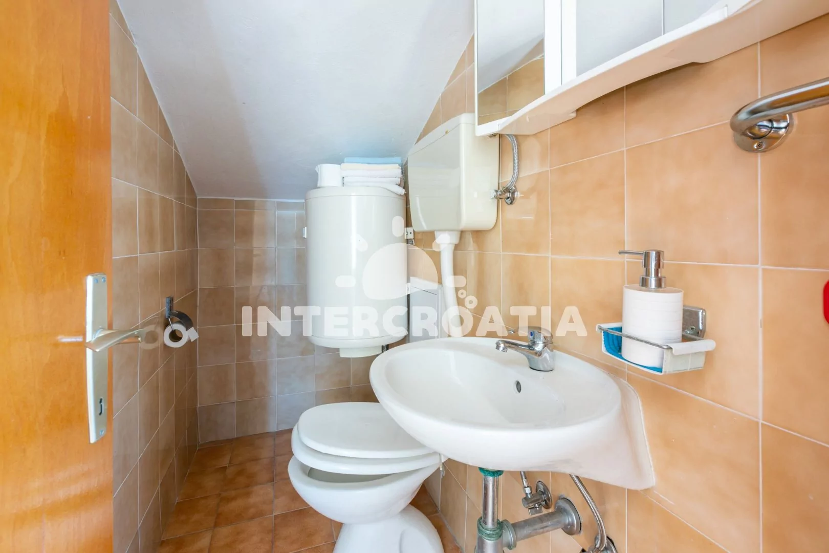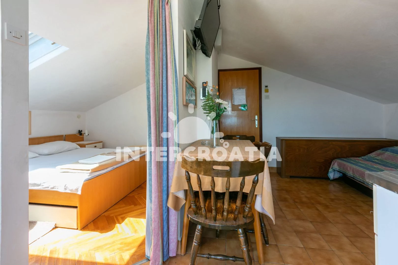 Podkrovní apartmán typu studio s výhledem na moře a terasou je vhodný pro 2 až 3 osoby. Obývací pokoj je spojený s kuchyní. Kuchyňská linka je vybavena dvouplotýnkovým sporákem, kávovarem, nádobím a lednicí s mrazákem. Obývací pokoj s jídelním stolem pro 3 osoby, pohovkou (rozložitelná na extra lůžko pro 1 osobu), televizí, klimatizací a vstupem na terasu. Částečně oddělena ložnice od obývacího pokoje je vybavena jedním dvoulůžkem. Koupelna s umyvadlem a wc, sprchový kout umístěný vedle koupelny (viz. foto). Hostům je k dispozici parkování u objektu zdarma.