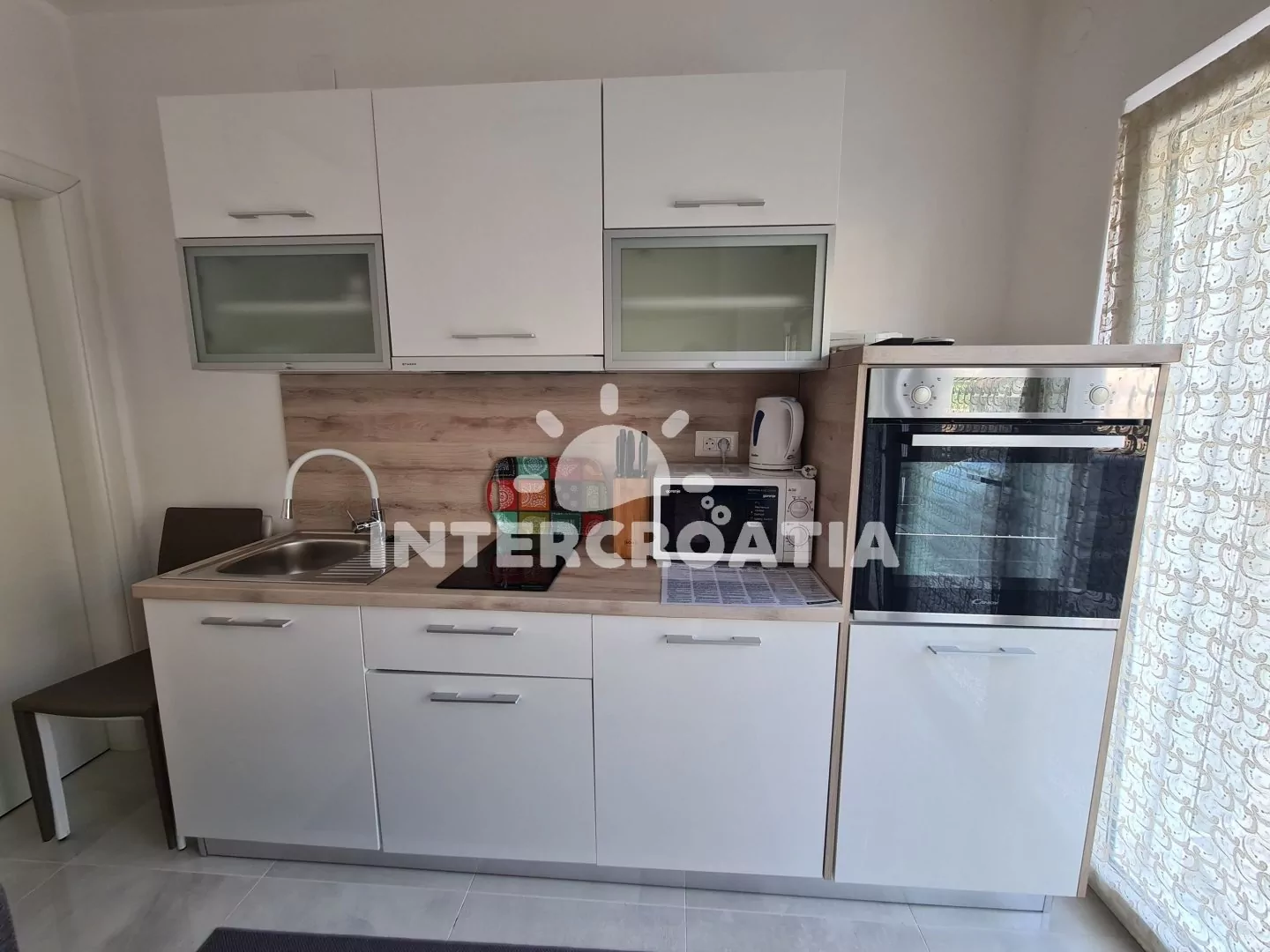 Apartmán typu studio v přízemí domu je vhodný pro 2 osoby. Obývací místnost je spojena s kuchyní. Kuchyňská linka je vybavena sporákem, digestoří, rychlovarnou konvicí, kávovarem, toustovačem,…