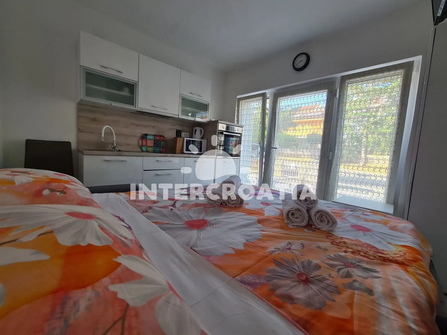 Apartmán typu studio v přízemí domu je vhodný pro 2 osoby. Obývací místnost je spojena s kuchyní. Kuchyňská linka je vybavena sporákem, digestoří, rychlovarnou konvicí, kávovarem, toustovačem, nádobím a lednicí s mrazákem. Obývací místnost s pohovkou (rozložitelná na lůžko pro 2 osoby), televizí se satelitním programem a klimatizací. Koupelna se sprchovým koutem, umyvadlem a wc. Hostům je k dispozici parkování u objektu zdarma.