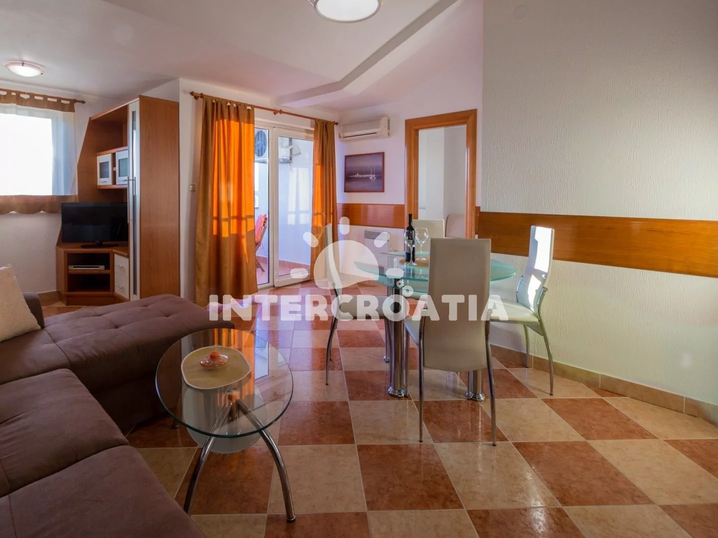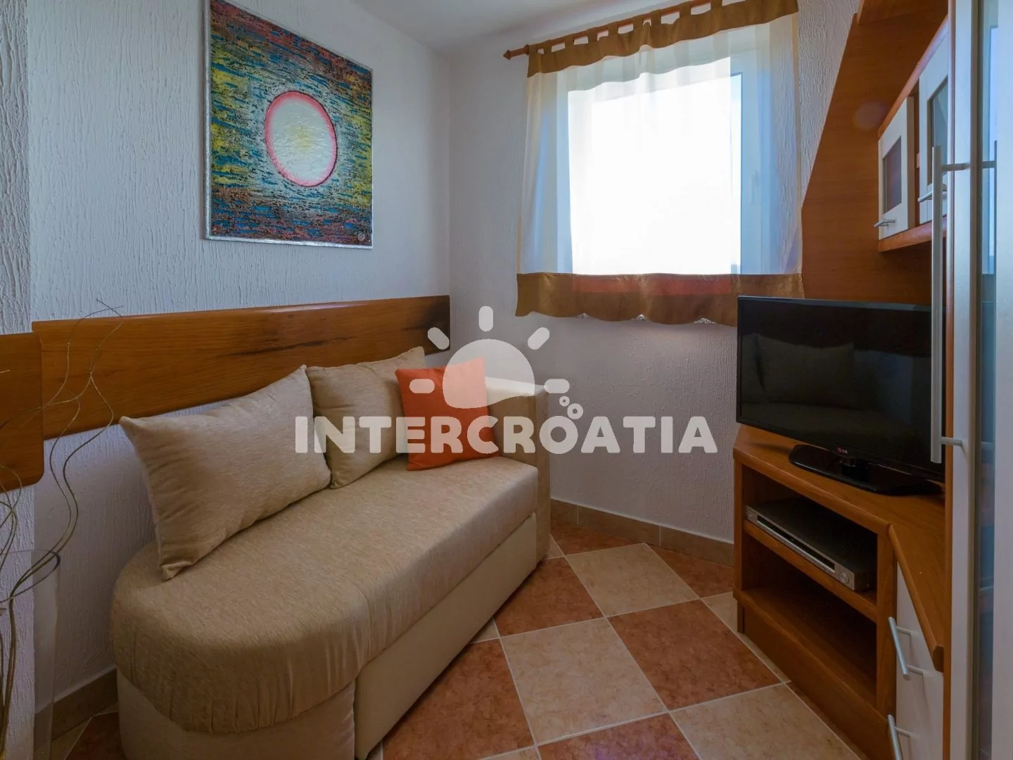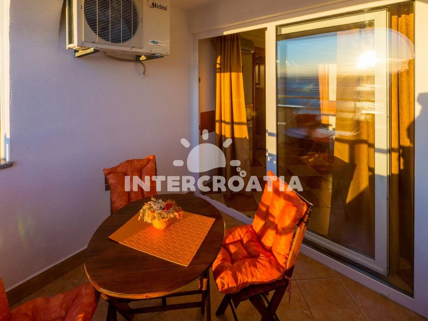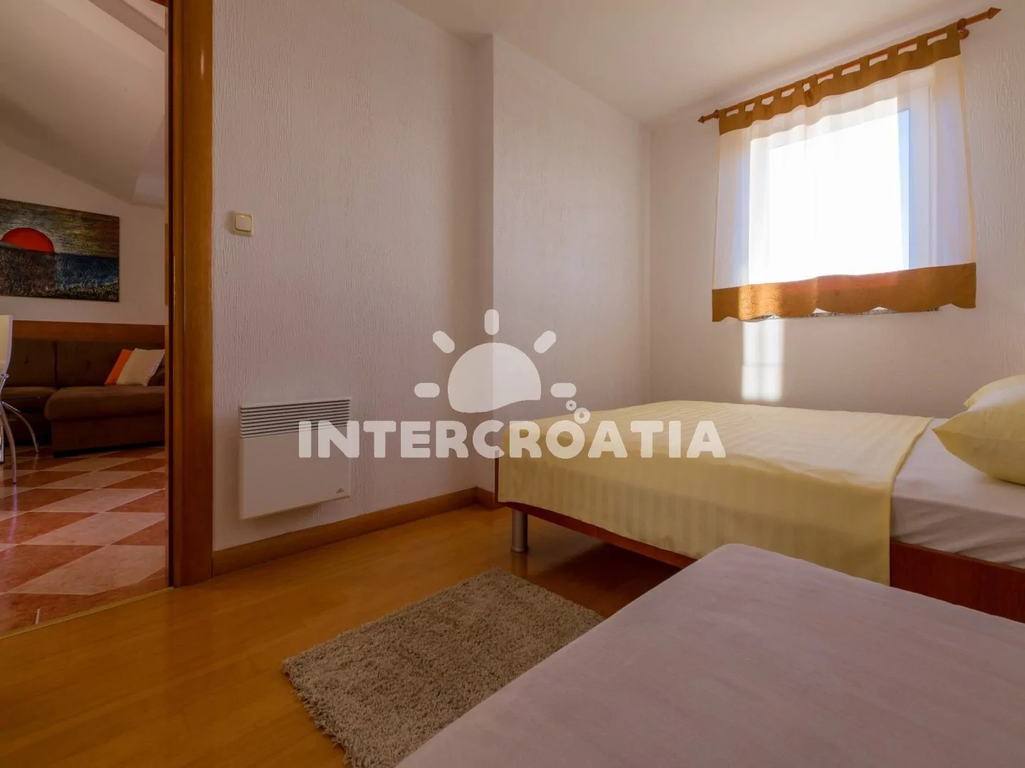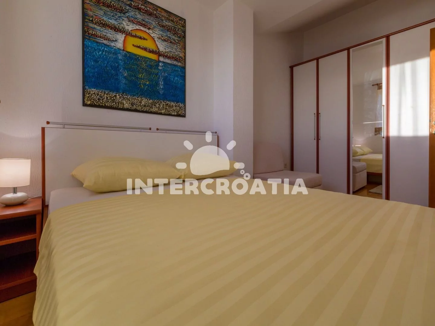 Apartmán (45 m2) s balkonem a výhledem na moře, se nachází v třetím patře a je vhodný pro až 4 osoby. Obývací pokoj je spojený s kuchyní. Kuchyňská linka je vybavena sklokeramickou varnou deskou, digestoří, troubou, myčkou na nádobí, mikrovlnnou troubou, kávovarem, rychlovarnou konvicí, nádobím a lednicí s mrazákem. Obývací pokoj s jídelním stolem pro 4 osoby, sedací soupravou, pohovkou (rozložitelná na extra lůžko pro 2 osoby), televizí se satelitním programem, klimatizací a vstupem na balkon. Ložnice s jedním dvoulůžkem. Koupelna se sprchovým koutem, umyvadlem, pračkou, bidetem a wc. Hostům je k dispozici parkování u objektu zdarma.