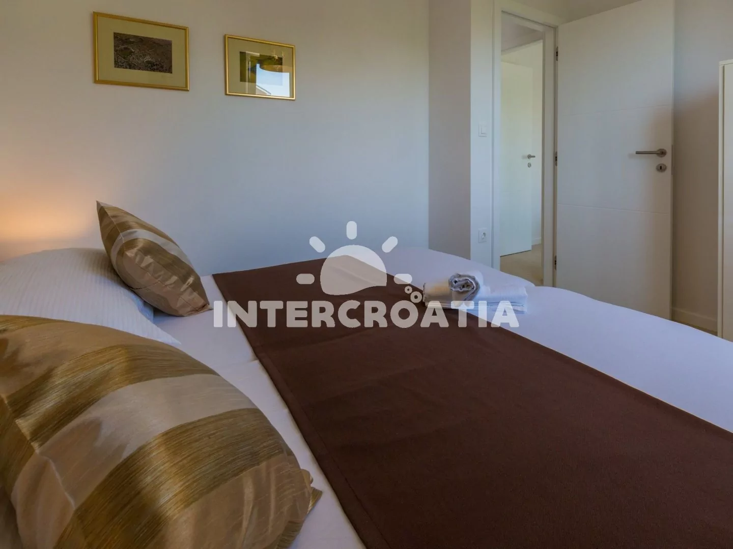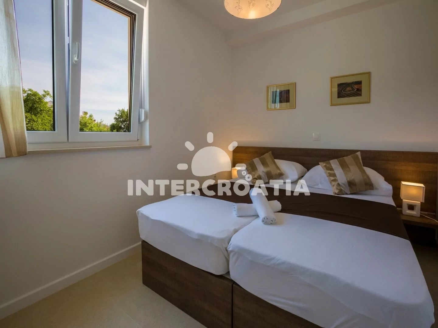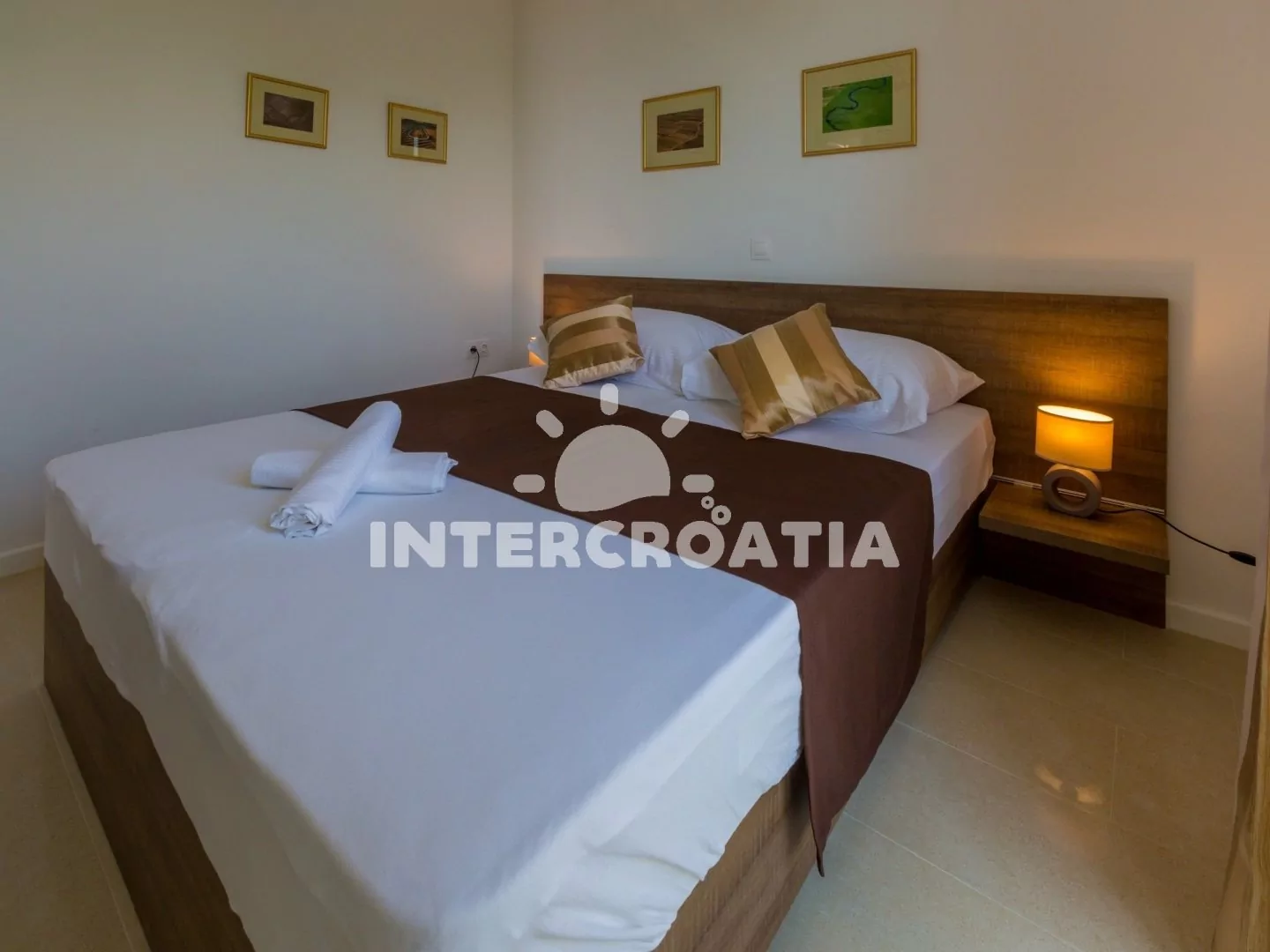 Luxusní apartmán (73 m2) s vlastní terasou a výhledem na moře se nachází v přízemí vily a je vhodný pro 4 až 6 osob. Obývací pokoj je spojený s kuchyní. Kuchyňská linka je vybavena sklokeramickou varnou deskou, digestoří, vestavěnou troubou, myčkou na nádobí, mikrovlnnou troubou, kávovarem, rychlovarnou konvicí, toustovačem, nádobím a lednicí s mrazákem. Obývací pokoj s jídelním stolem pro 6 osob, rohovou pohovkou (rozložitelná na extra lůžko pro 2 osoby), televizí se satelitním programem, radiem, sejfem a klimatizací. První i druhá ložnice je vybavena vždy s jedním dvoulůžkem. Dvě koupelny se sprchovým koutem, umyvadlem a wc. Dále k dispozici fén, pračka, žehlička a dětská postýlka. Hostům je k dispozici parkování u objektu zdarma.