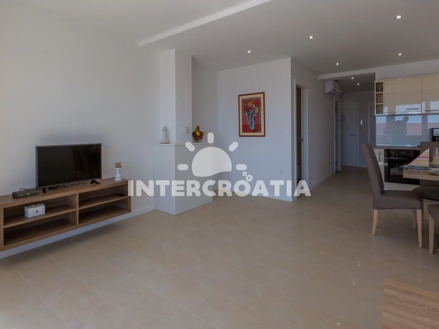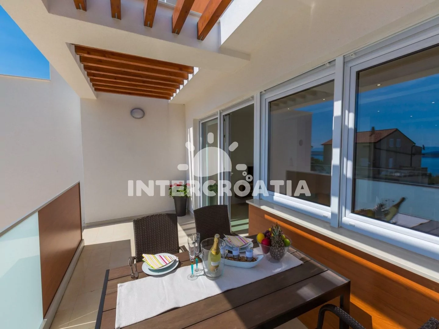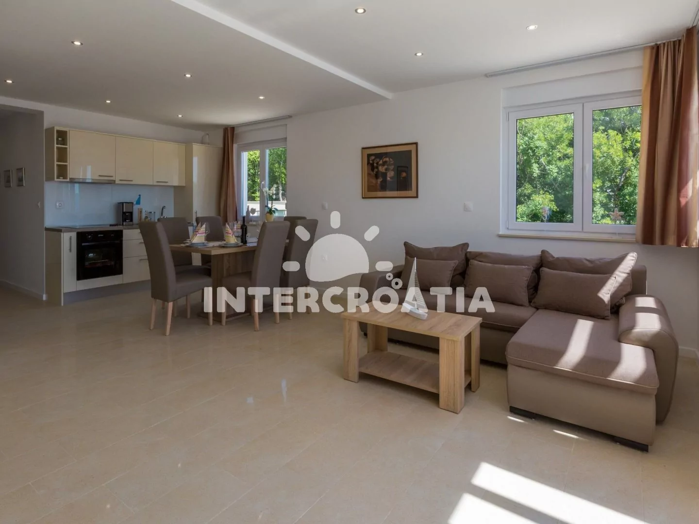 Luxusní apartmán (73 m2) s vlastní terasou a výhledem na moře se nachází v přízemí vily a je vhodný pro 4 až 6 osob. Obývací pokoj je spojený s kuchyní. Kuchyňská linka je vybavena sklokeramickou varnou deskou, digestoří, vestavěnou troubou, myčkou na nádobí, mikrovlnnou troubou, kávovarem, rychlovarnou konvicí, toustovačem, nádobím a lednicí s mrazákem. Obývací pokoj s jídelním stolem pro 6 osob, rohovou pohovkou (rozložitelná na extra lůžko pro 2 osoby), televizí se satelitním programem, radiem, sejfem a klimatizací. První i druhá ložnice je vybavena vždy s jedním dvoulůžkem. Dvě koupelny se sprchovým koutem, umyvadlem a wc. Dále k dispozici fén, pračka, žehlička a dětská postýlka. Hostům je k dispozici parkování u objektu zdarma.