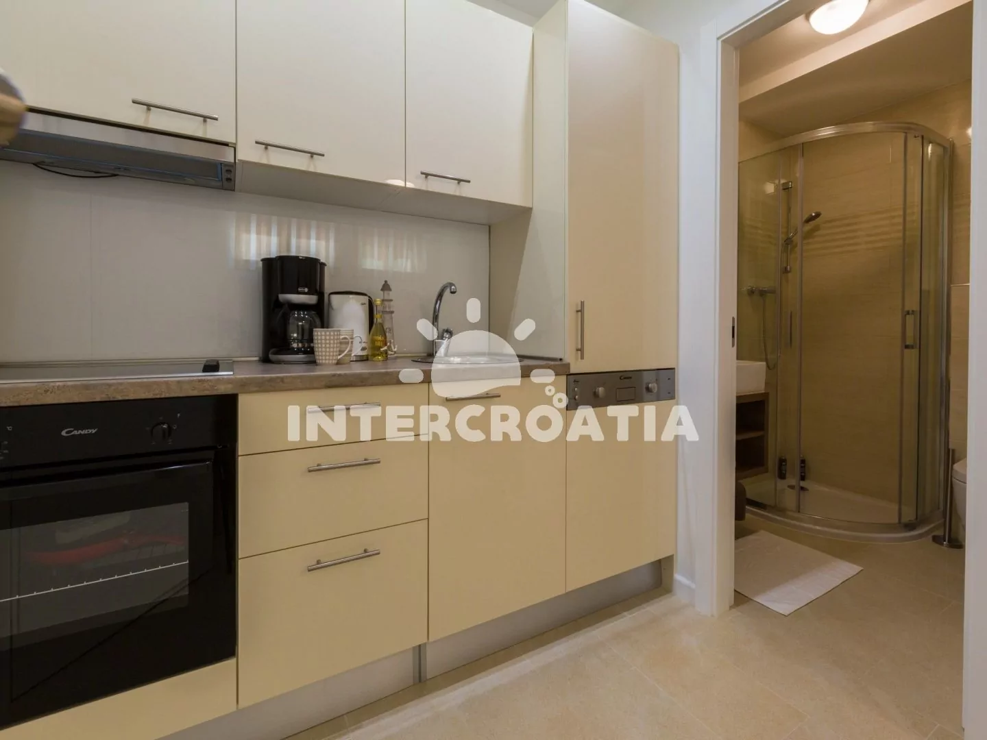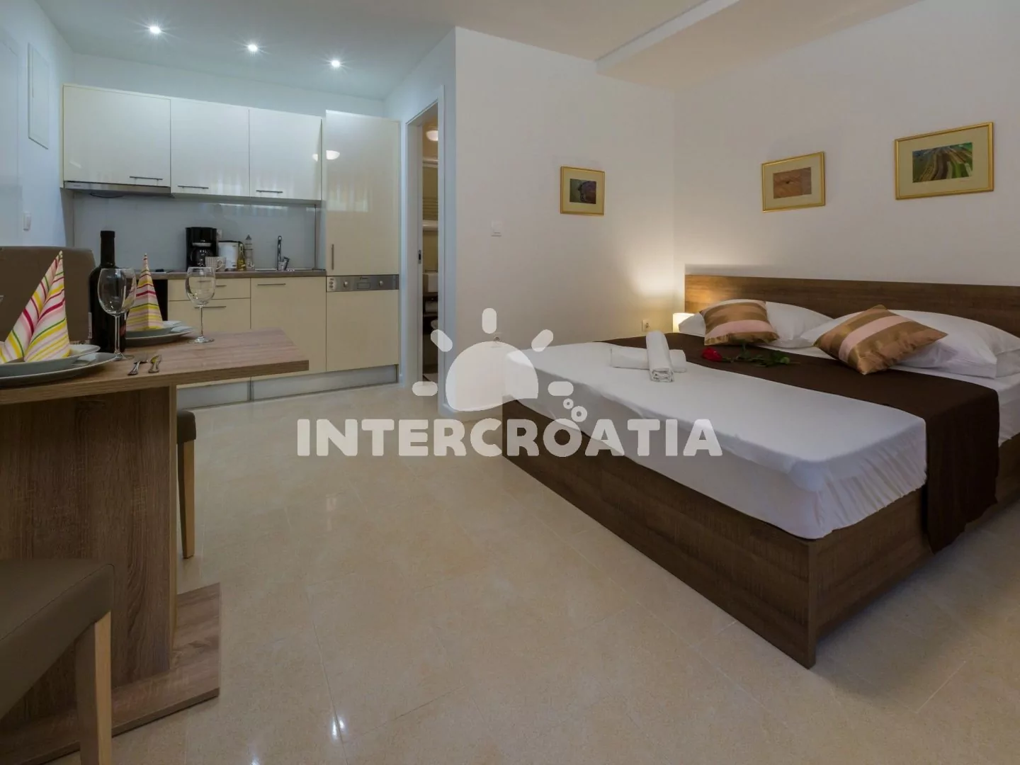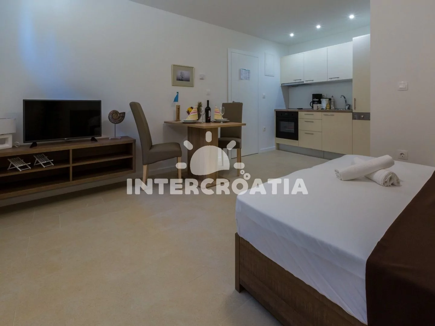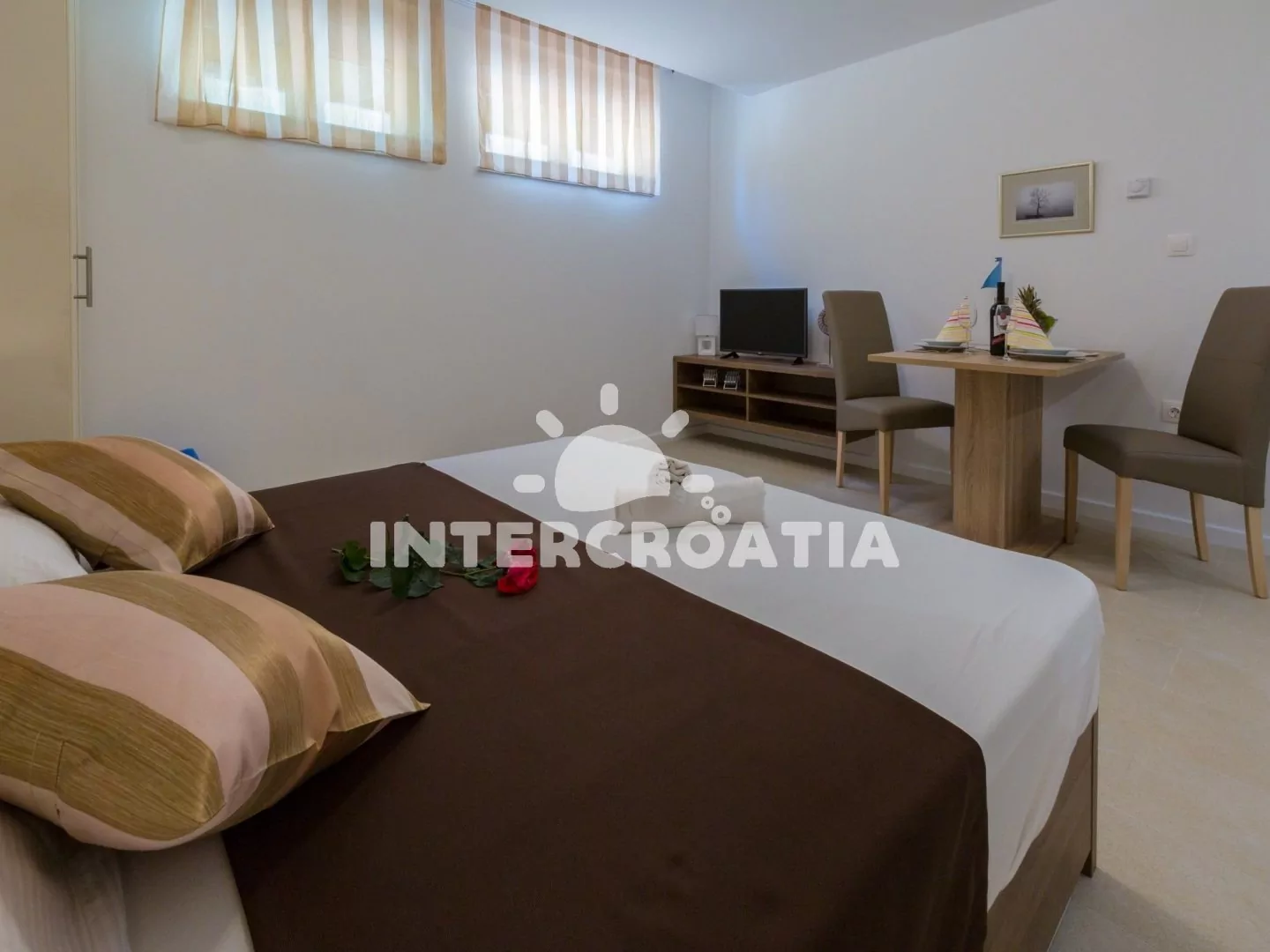Apartmán typu studio je vhodný pro 2 osoby a nachází se v suterénu vily. Obývací místnost je spojena s kuchyní. Kuchyňská linka je vybavena sklokeramickou varnou deskou, digestoří, vestavěnou troubou…