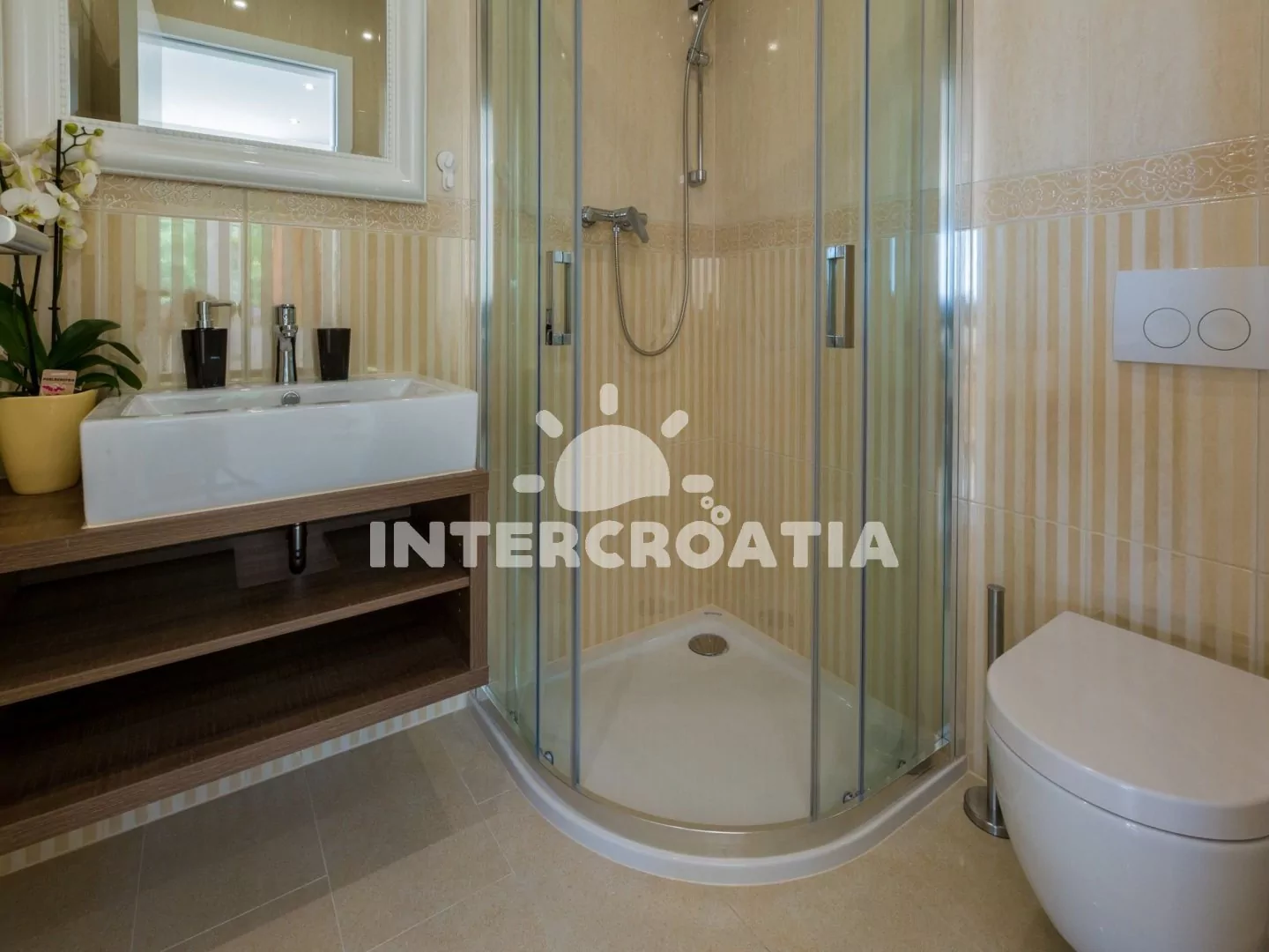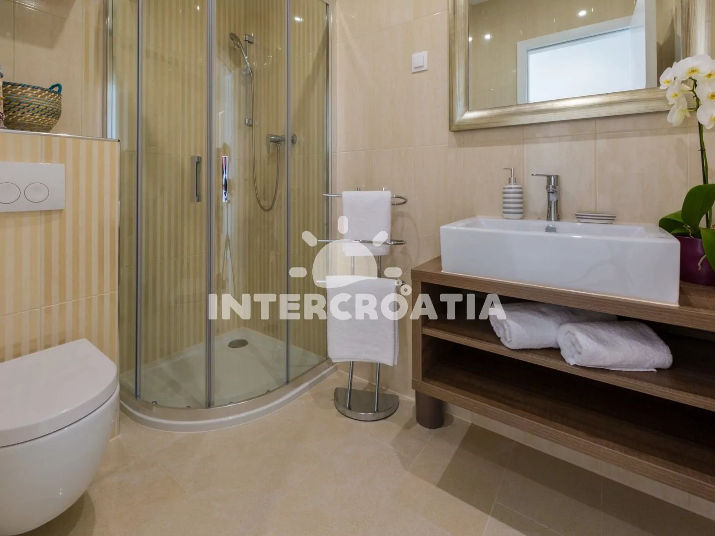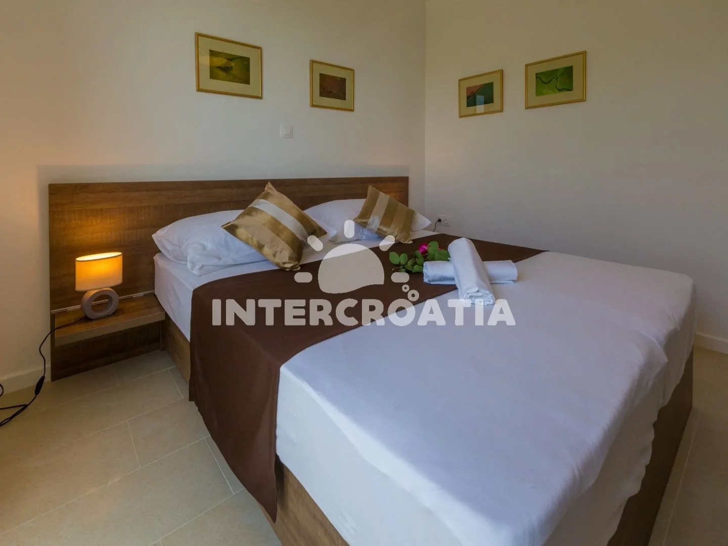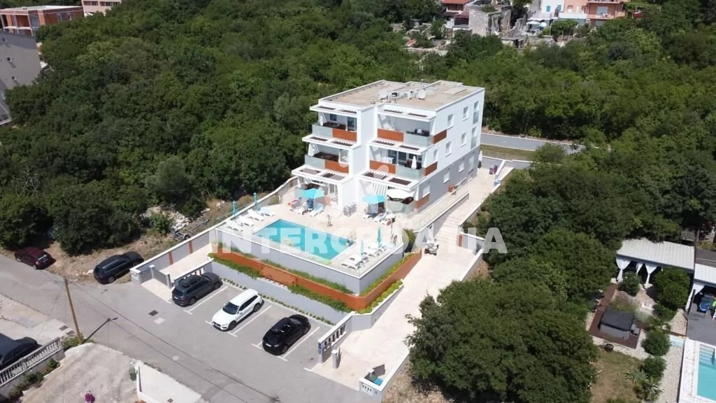 Skvěle zařízený apartmán (73 m2) s vlastní terasou a výhledem na moře se nachází v přízemí vily a je vhodný pro 4 až 6 osob. Obývací pokoj je spojený s kuchyní. Kuchyňská linka je vybavena sklokeramickou varnou deskou, digestoří, vestavěnou troubou, myčkou na nádobí, mikrovlnnou troubou, kávovarem, rychlovarnou konvicí, toustovačem, nádobím a lednicí s mrazákem. Obývací pokoj s jídelním stolem pro 6 osob, rohovou pohovkou (rozložitelná na extra lůžko pro 2 osoby), televizí se satelitním programem, radiem, sejfem, klimatizací a vstupem na terasu. První i druhá ložnice je vybavena vždy s jedním dvoulůžkem. Dvě koupelny se sprchovým koutem, umyvadlem a wc. Dále k dispozici fén, pračka, žehlička a dětská postýlka. Hostům je k dispozici parkování u objektu zdarma.