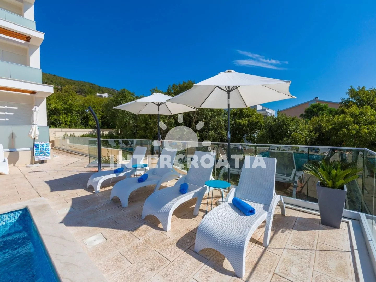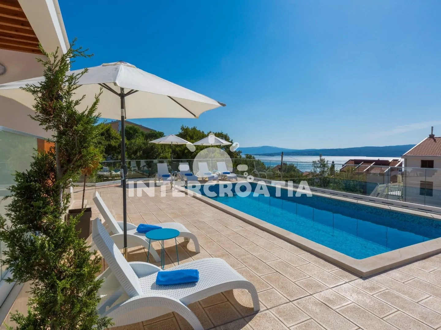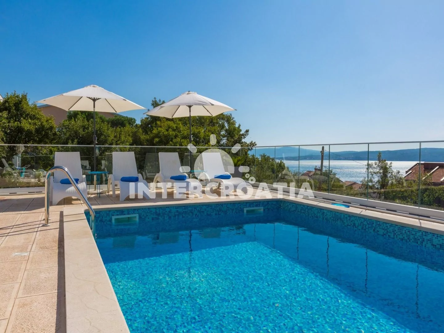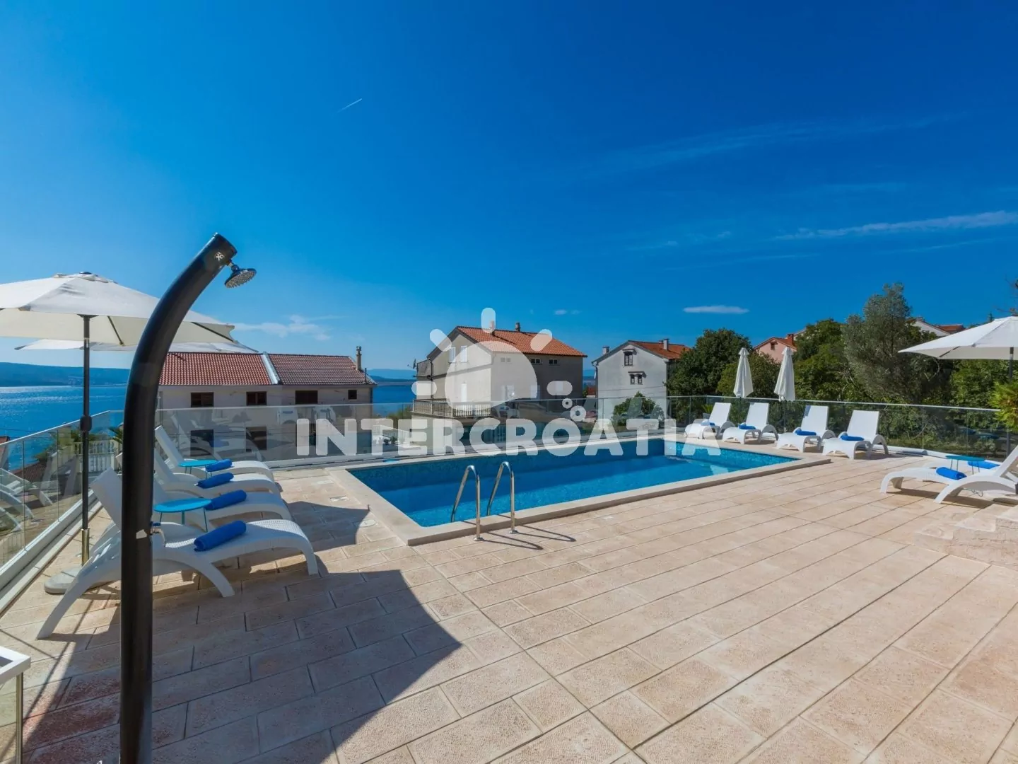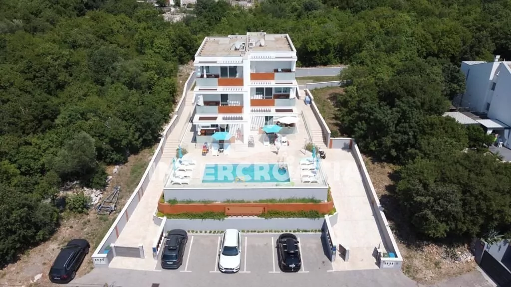 Luxusní a nádherná vila v klidném prostředí s výhledem na moře. Bazén se společnou terasou a lehátky, nabízí dokonalou relaxaci. Apartmány s lodžiemi a výhledem na moře. Parkovací místa pro automobily přímo u vily.