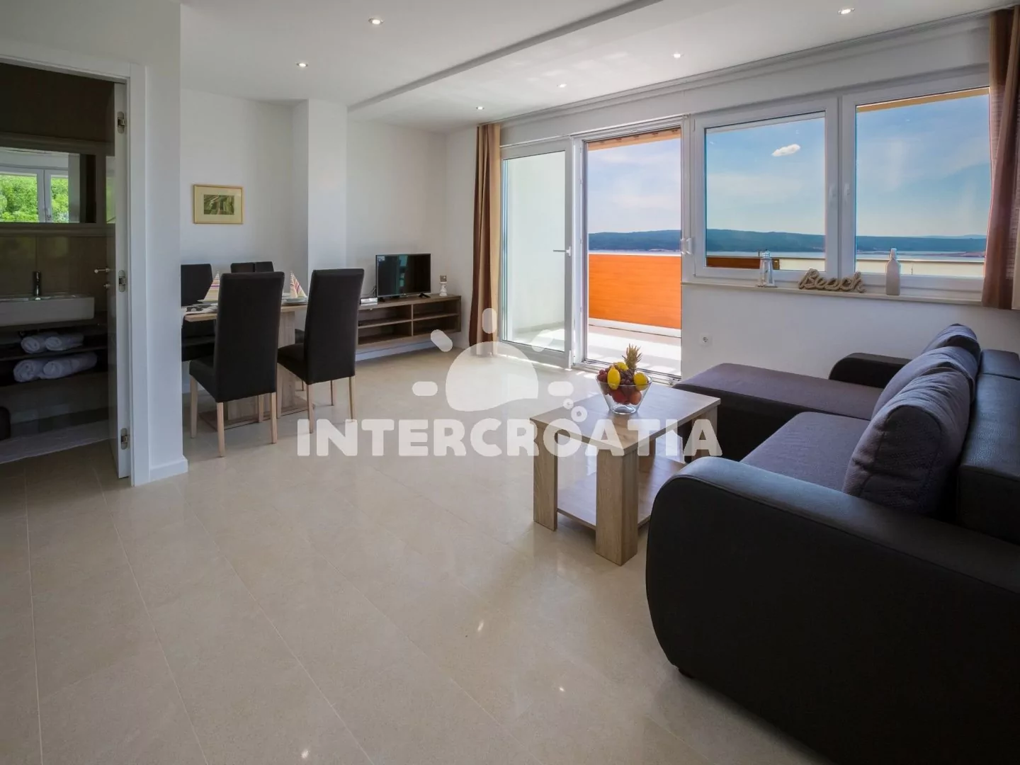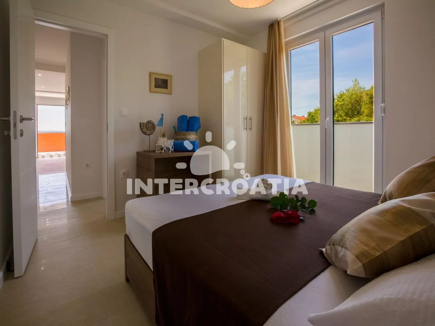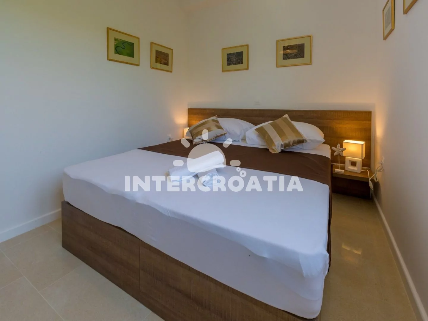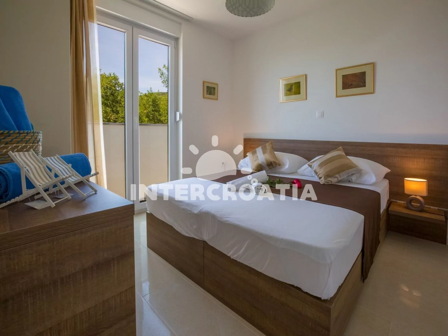Skvěle zařízený apartmán (63 m2) s vlastní terasou a výhledem na moře se nachází v první patře vily a je vhodný pro 4 až 6 osob. Obývací pokoj je spojený s kuchyní. Kuchyňská linka je vybavena sklokeramickou varnou deskou, digestoří, vestavěnou troubou, myčkou na nádobí, mikrovlnnou troubou, kávovarem, rychlovarnou konvicí, toustovačem, nádobím a lednicí s mrazákem. Obývací pokoj s jídelním stolem pro 4 osoby, rohovou pohovkou (rozložitelná na extra lůžko pro 2 osoby), televizí se satelitním programem, radiem, sejfem, klimatizací a vstupem na terasu. První i druhá ložnice je vybavena vždy s jedním dvoulůžkem. Dvě koupelny se sprchovým koutem, umyvadlem a wc. Dále k dispozici fén, pračka, žehlička a dětská postýlka. Hostům je k dispozici parkování u objektu zdarma.