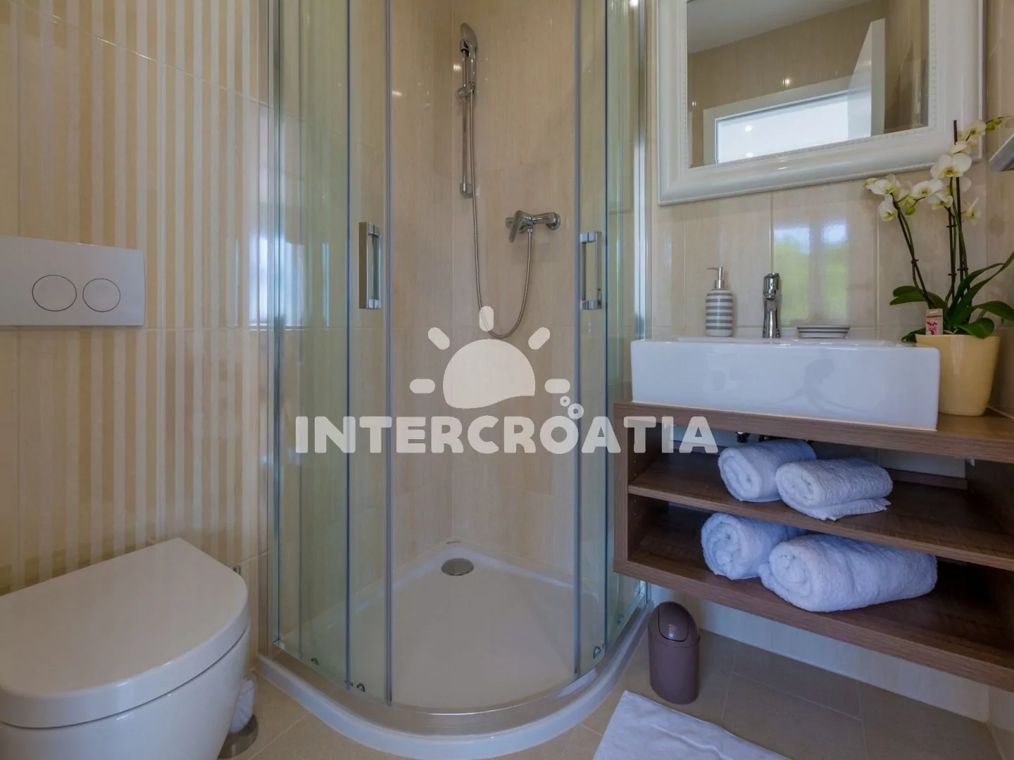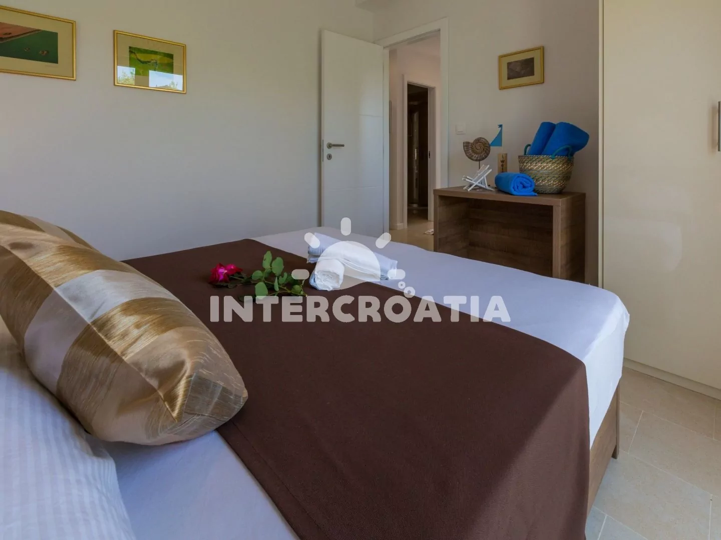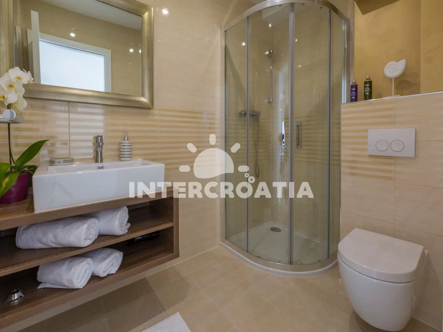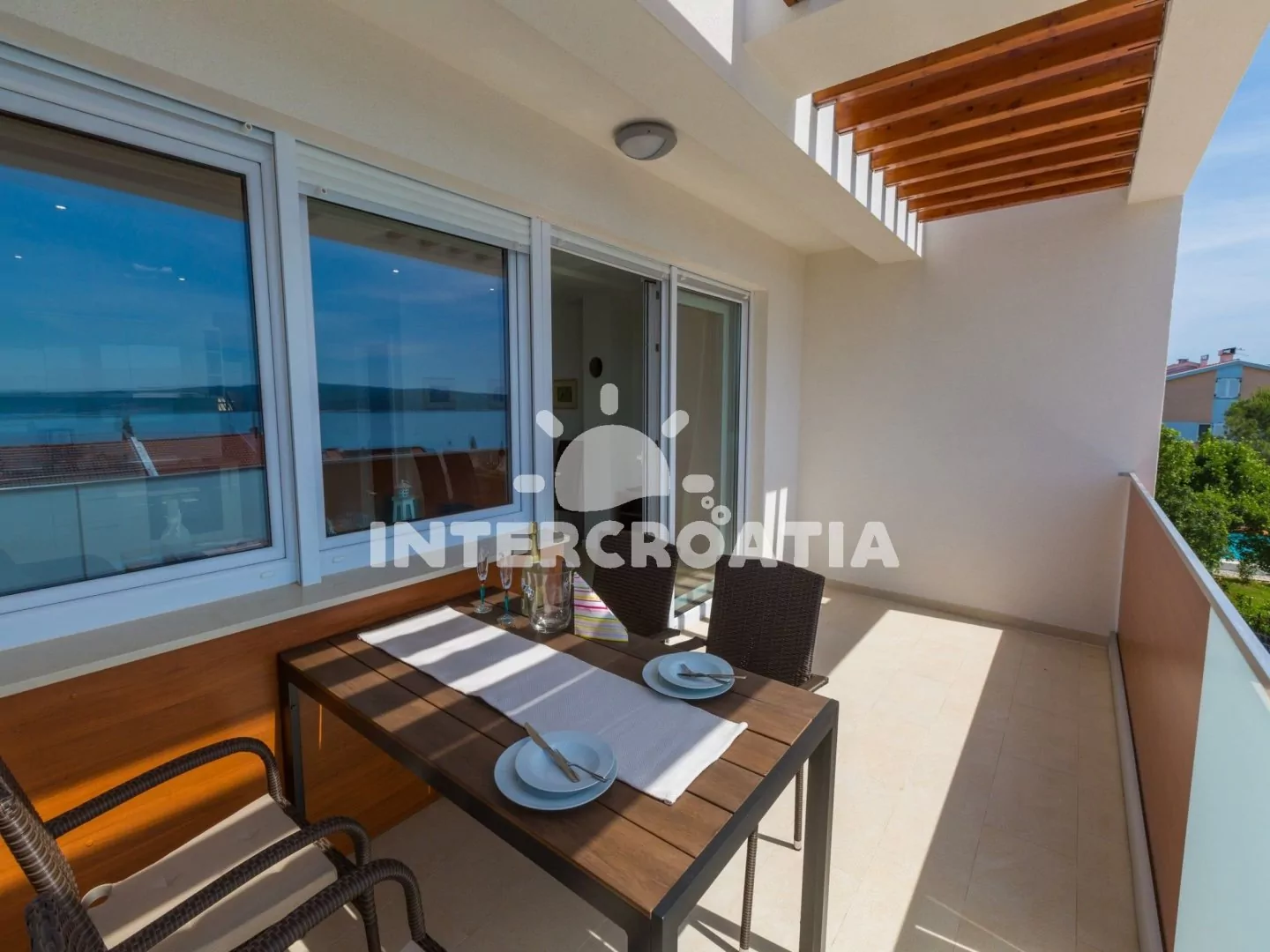 Skvěle zařízený apartmán (63 m2) s vlastní terasou a výhledem na moře se nachází v první patře vily a je vhodný pro 4 až 6 osob. Obývací pokoj je spojený s kuchyní. Kuchyňská linka je vybavena sklokeramickou varnou deskou, digestoří, vestavěnou troubou, myčkou na nádobí, mikrovlnnou troubou, kávovarem, rychlovarnou konvicí, toustovačem, nádobím a lednicí s mrazákem. Obývací pokoj s jídelním stolem pro 4 osoby, rohovou pohovkou (rozložitelná na extra lůžko pro 2 osoby), televizí se satelitním programem, radiem, sejfem, klimatizací a vstupem na terasu. První i druhá ložnice je vybavena vždy s jedním dvoulůžkem. Dvě koupelny se sprchovým koutem, umyvadlem a wc. Dále k dispozici fén, pračka, žehlička a dětská postýlka. Hostům je k dispozici parkování u objektu zdarma.