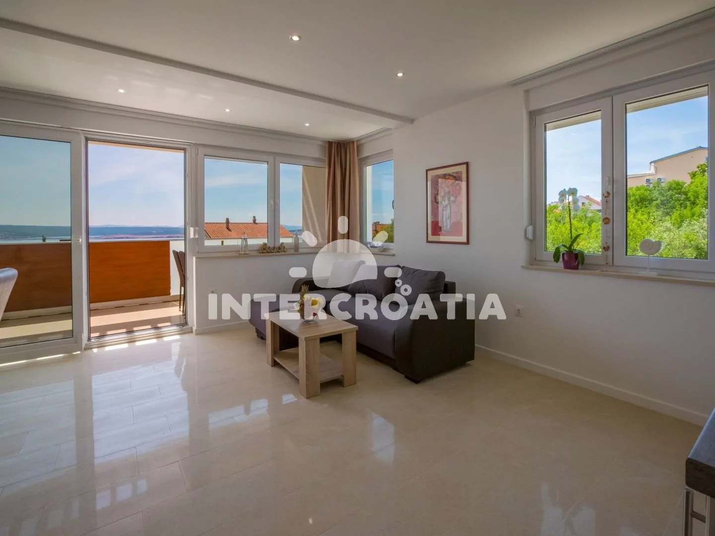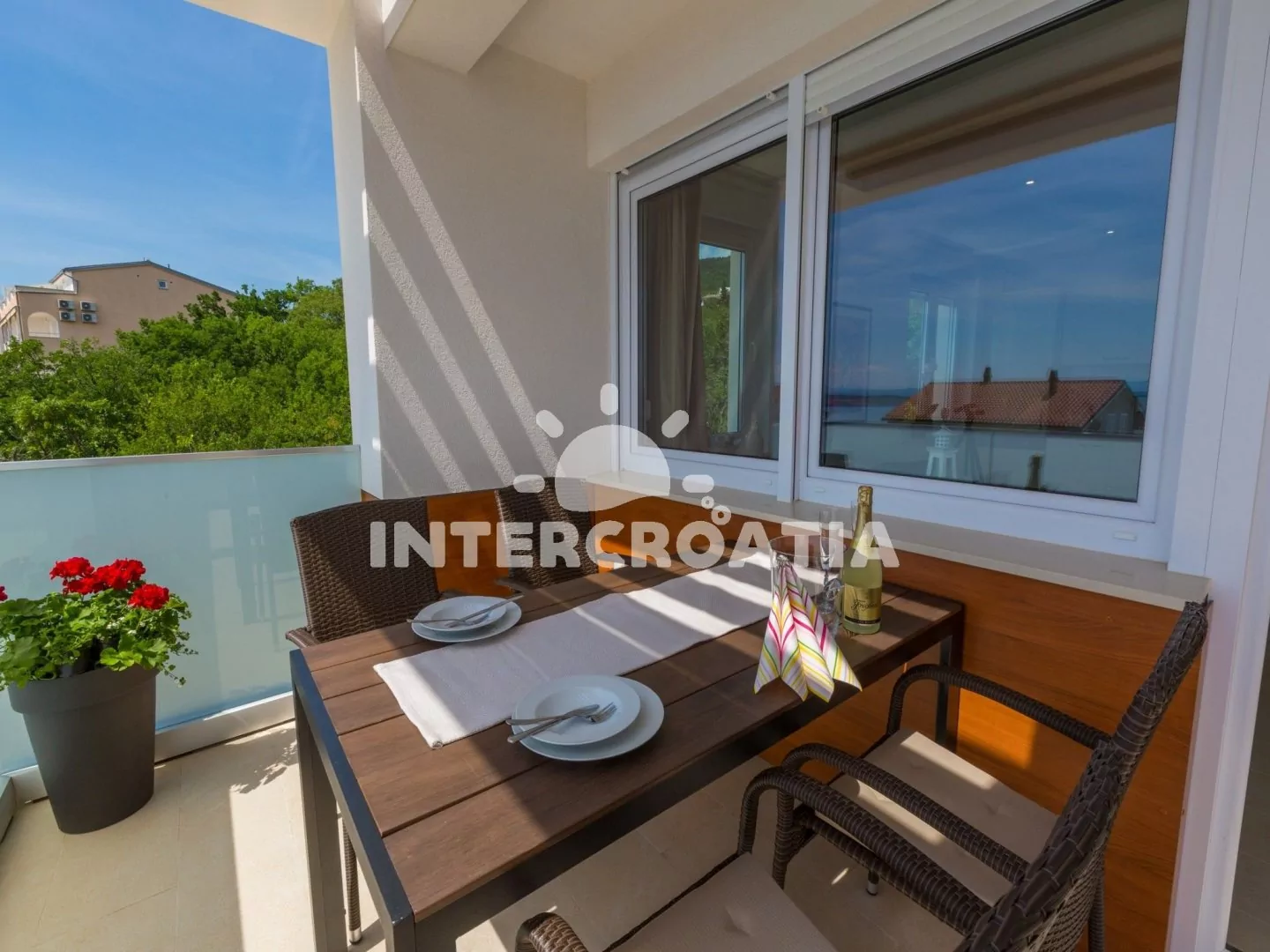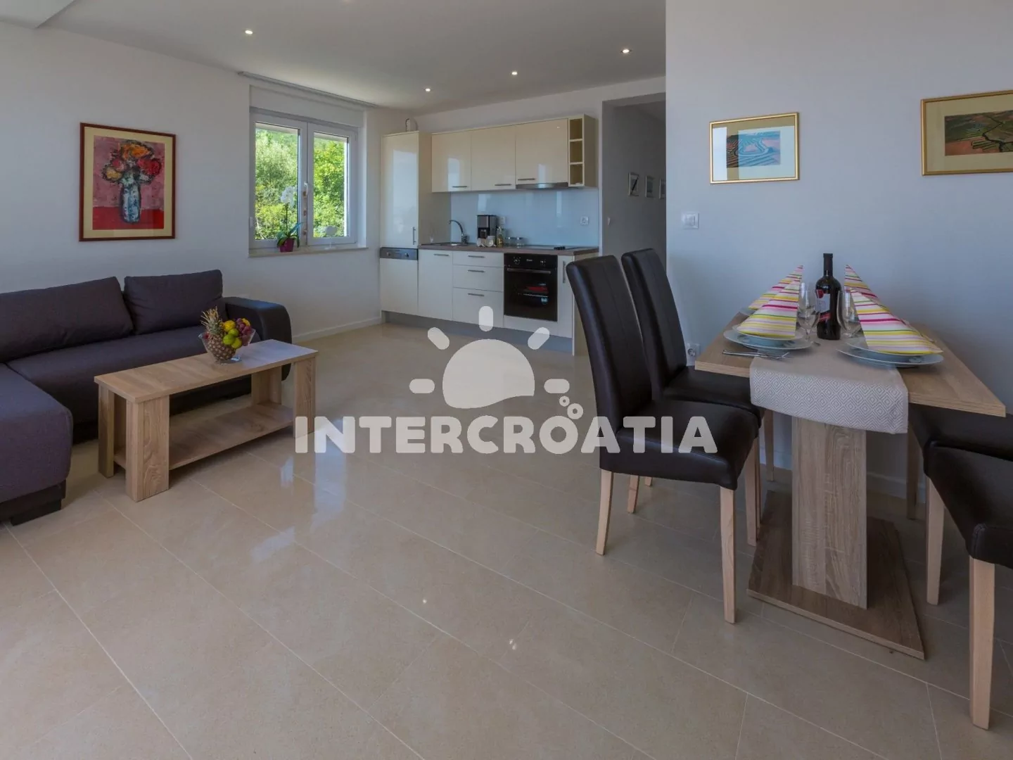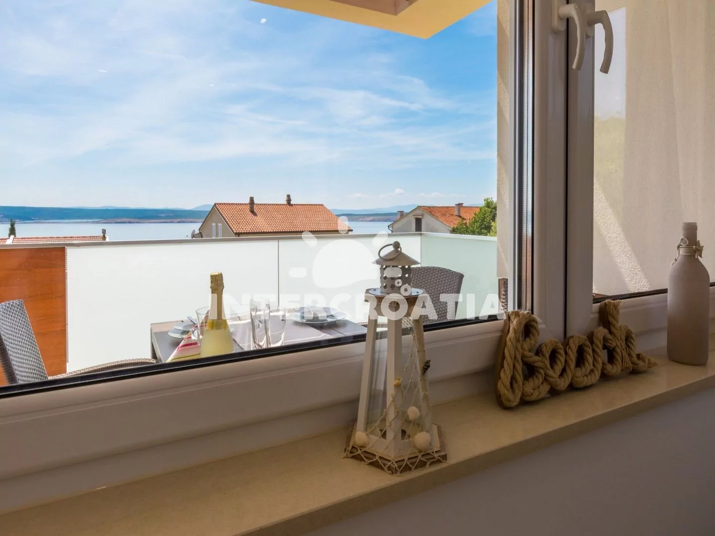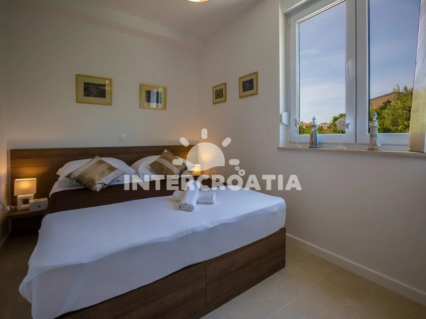 Skvěle zařízený apartmán (63 m2) s vlastní terasou a výhledem na moře se nachází v první patře vily a je vhodný pro 4 až 6 osob. Obývací pokoj je spojený s kuchyní. Kuchyňská linka je vybavena sklokeramickou varnou deskou, digestoří, vestavěnou troubou, myčkou na nádobí, mikrovlnnou troubou, kávovarem, rychlovarnou konvicí, toustovačem, nádobím a lednicí s mrazákem. Obývací pokoj s jídelním stolem pro 4 osoby, rohovou pohovkou (rozložitelná na extra lůžko pro 2 osoby), televizí se satelitním programem, radiem, sejfem, klimatizací a vstupem na terasu. První i druhá ložnice je vybavena vždy s jedním dvoulůžkem. Dvě koupelny se sprchovým koutem, umyvadlem a wc. Dále k dispozici fén, pračka, žehlička a dětská postýlka. Hostům je k dispozici parkování u objektu zdarma.