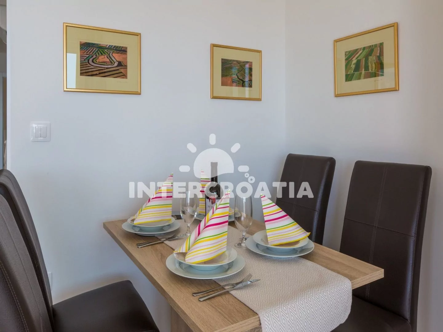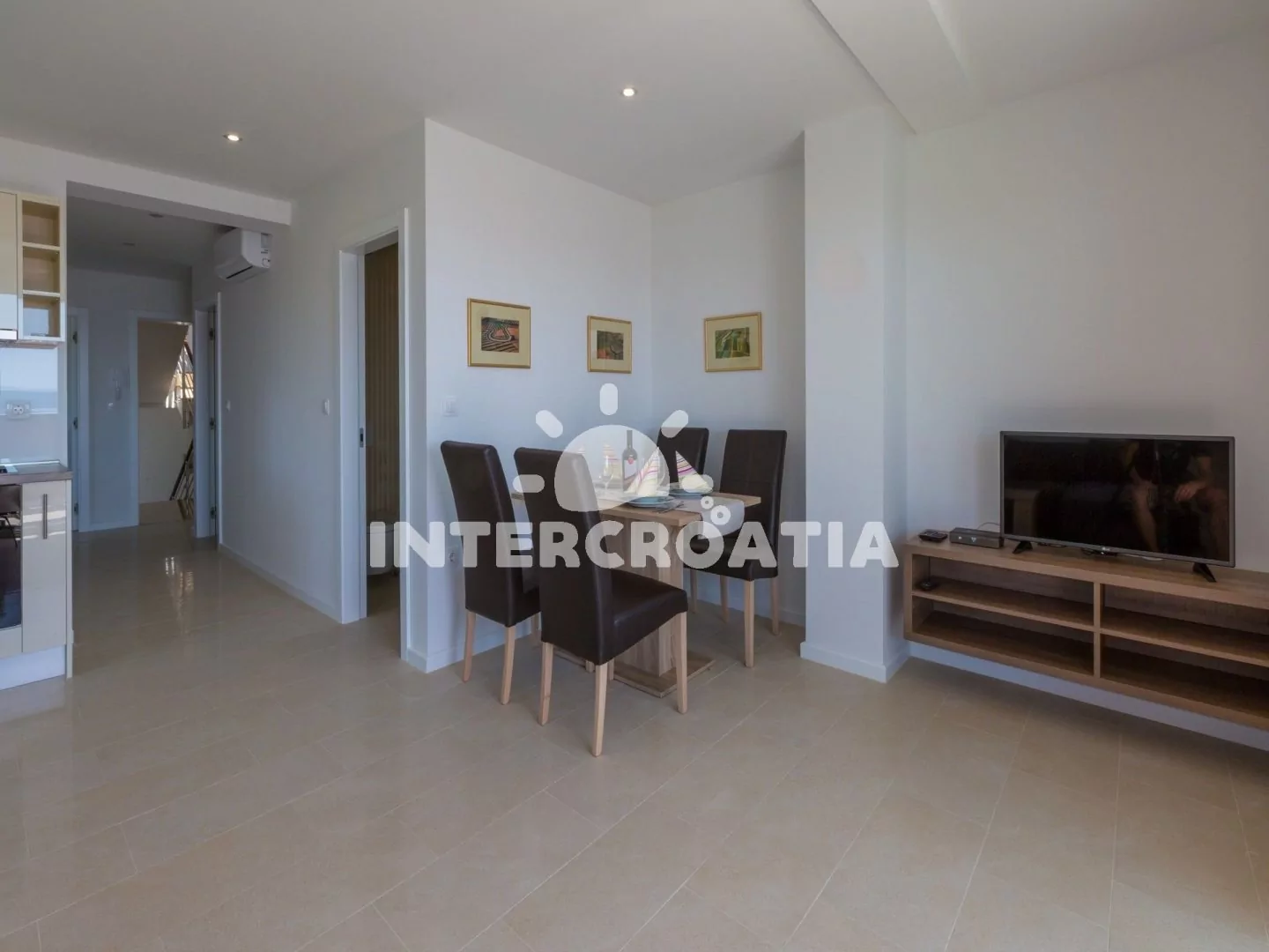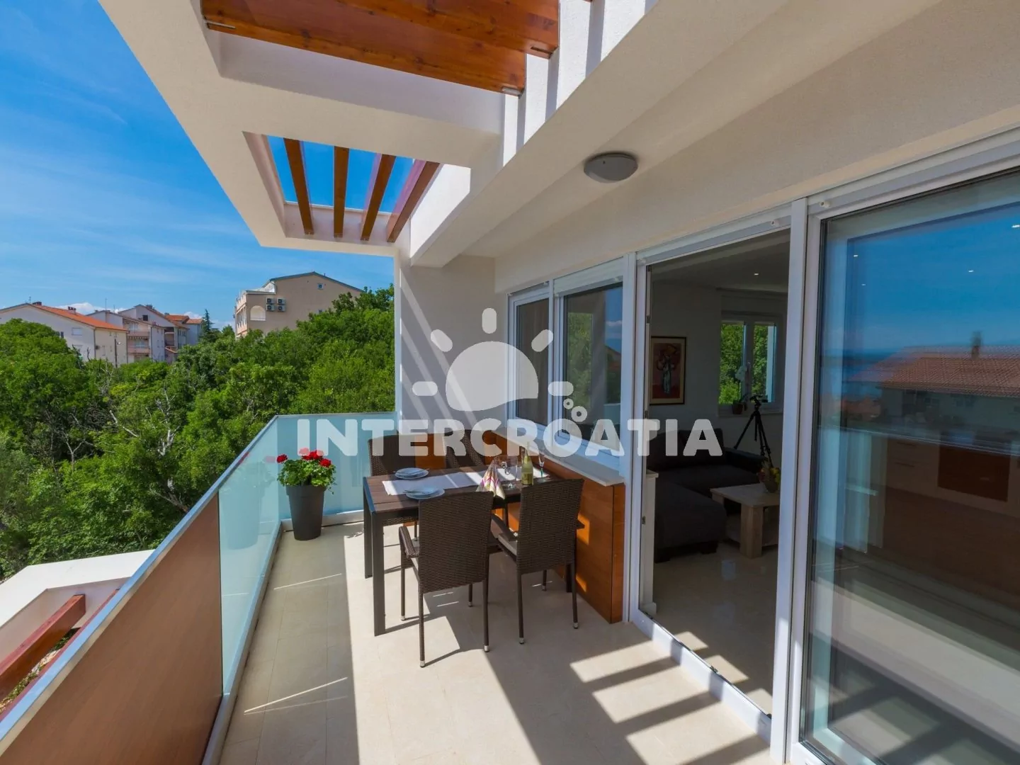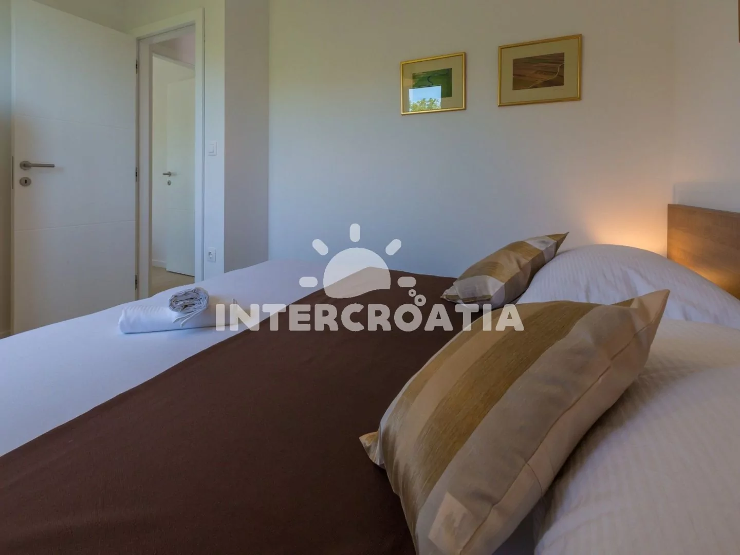 Skvěle zařízený apartmán (63 m2) s vlastní terasou a výhledem na moře se nachází v první patře vily a je vhodný pro 4 až 6 osob. Obývací pokoj je spojený s kuchyní. Kuchyňská linka je vybavena sklokeramickou varnou deskou, digestoří, vestavěnou troubou, myčkou na nádobí, mikrovlnnou troubou, kávovarem, rychlovarnou konvicí, toustovačem, nádobím a lednicí s mrazákem. Obývací pokoj s jídelním stolem pro 4 osoby, rohovou pohovkou (rozložitelná na extra lůžko pro 2 osoby), televizí se satelitním programem, radiem, sejfem, klimatizací a vstupem na terasu. První i druhá ložnice je vybavena vždy s jedním dvoulůžkem. Dvě koupelny se sprchovým koutem, umyvadlem a wc. Dále k dispozici fén, pračka, žehlička a dětská postýlka. Hostům je k dispozici parkování u objektu zdarma.
