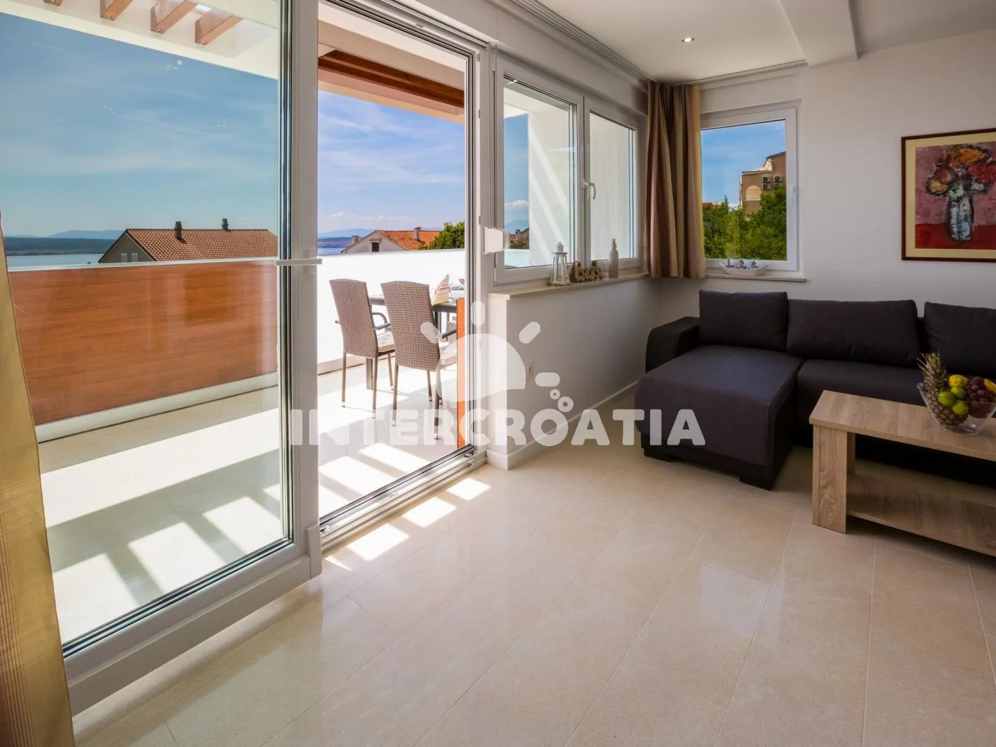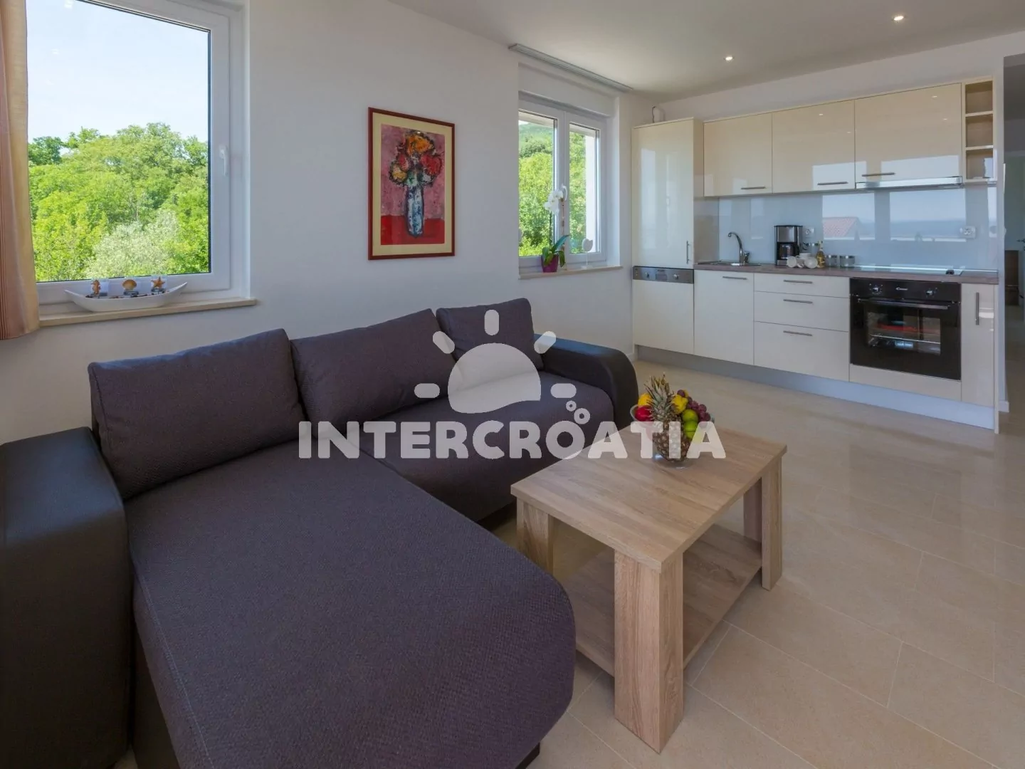 Skvěle zařízený apartmán (63 m2) s vlastní terasou a výhledem na moře se nachází v první patře vily a je vhodný pro 4 až 6 osob. Obývací pokoj je spojený s kuchyní. Kuchyňská linka je vybavena…
