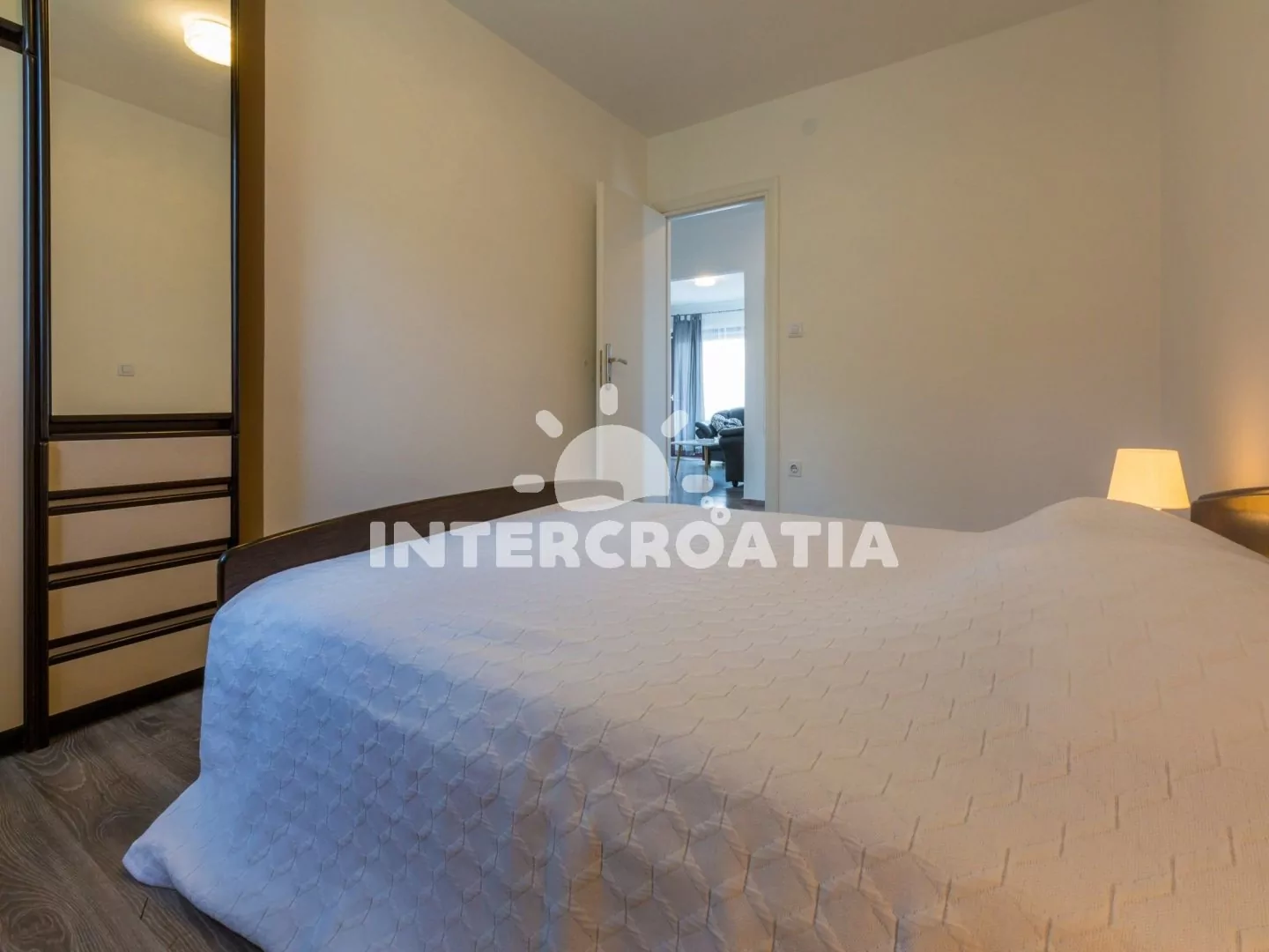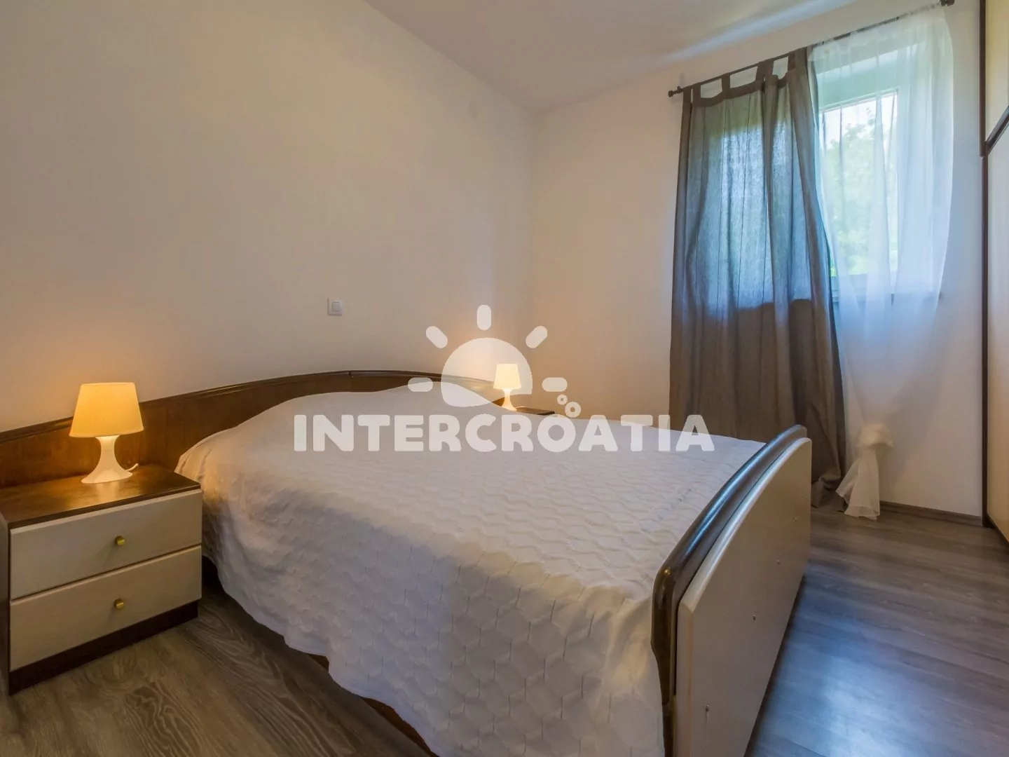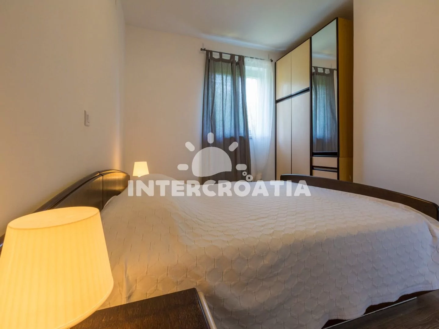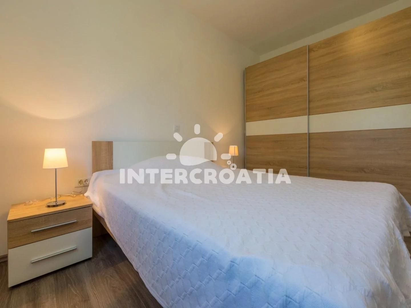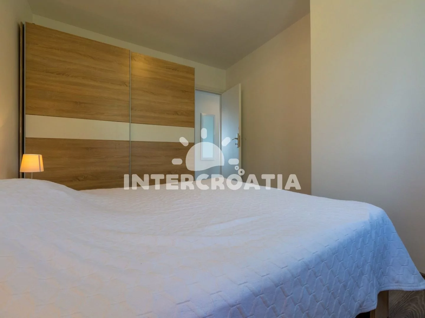 Apartmán (90 m2) s balkonem a výhledem na moře se nachází v 3. patře domu a je vhodný pro 4 až 6 osob. Obývací pokoj je částečně oddělený od kuchyně. Kuchyňská linka je vybavena sklokeramickou varnou deskou, myčkou na nádobí, rychlovarnou konvicí, mikrovlnnou troubou, kávovarem, toustovačem, nádobím a lednicí s mrazákem. Dále jídelní stůl pro 4 osoby a vstup na balkon. Obývací pokoj se sedací soupravou, pohovkou (rozložitelná na extra lůžko pro 2 osoby), televizí se satelitním programem, klimatizací a vstupem na balkon. První i druhá ložnice je vybavena vždy s jedním dvoulůžkem. Koupelna se sprchovým koutem, umyvadlem, fénem a wc. Hostům je k dispozici parkování u objektu zdarma.