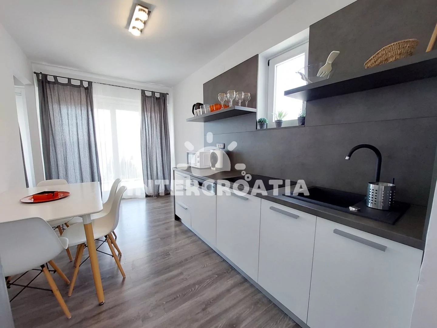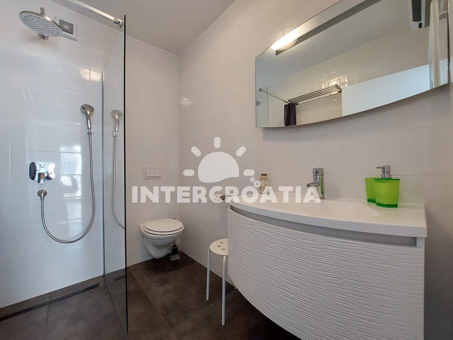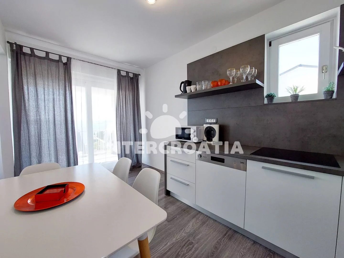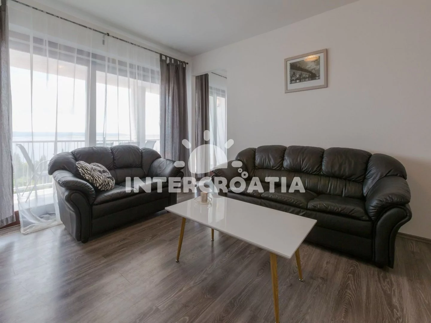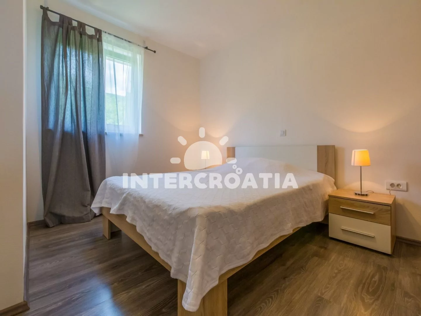 Apartmán (90 m2) s balkonem a výhledem na moře se nachází v 3. patře domu a je vhodný pro 4 až 6 osob. Obývací pokoj je částečně oddělený od kuchyně. Kuchyňská linka je vybavena sklokeramickou varnou deskou, myčkou na nádobí, rychlovarnou konvicí, mikrovlnnou troubou, kávovarem, toustovačem, nádobím a lednicí s mrazákem. Dále jídelní stůl pro 4 osoby a vstup na balkon. Obývací pokoj se sedací soupravou, pohovkou (rozložitelná na extra lůžko pro 2 osoby), televizí se satelitním programem, klimatizací a vstupem na balkon. První i druhá ložnice je vybavena vždy s jedním dvoulůžkem. Koupelna se sprchovým koutem, umyvadlem, fénem a wc. Hostům je k dispozici parkování u objektu zdarma.