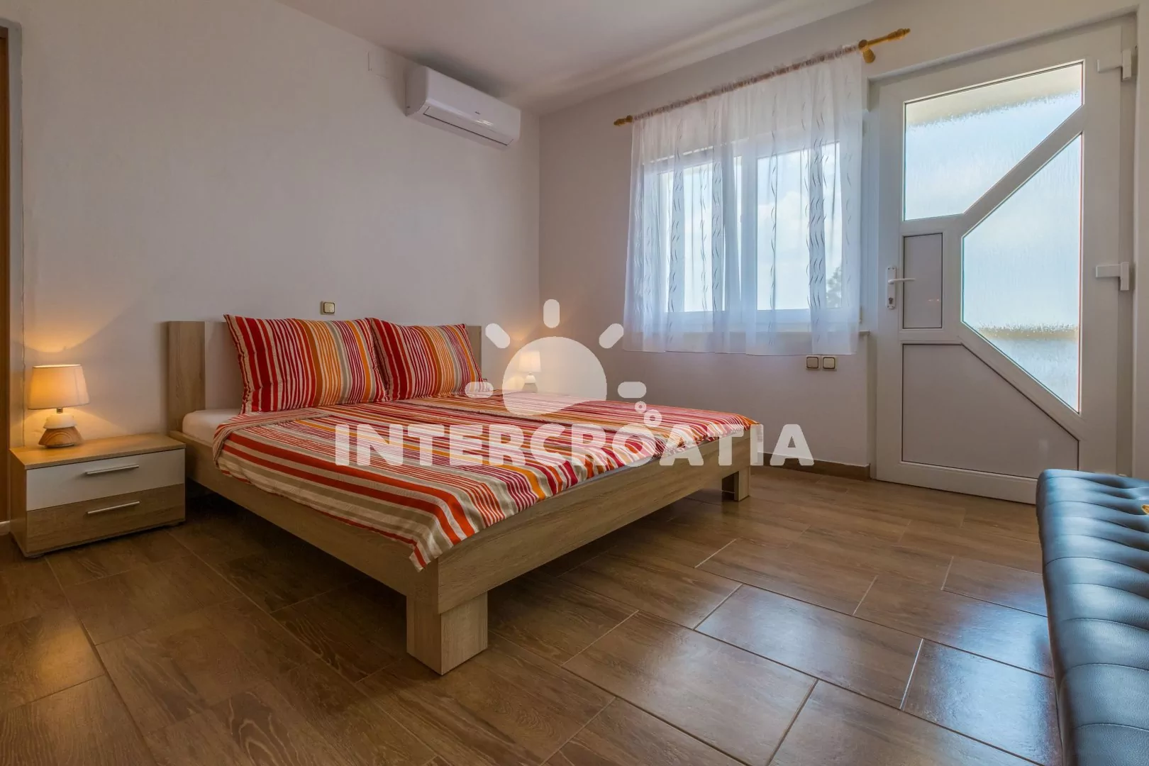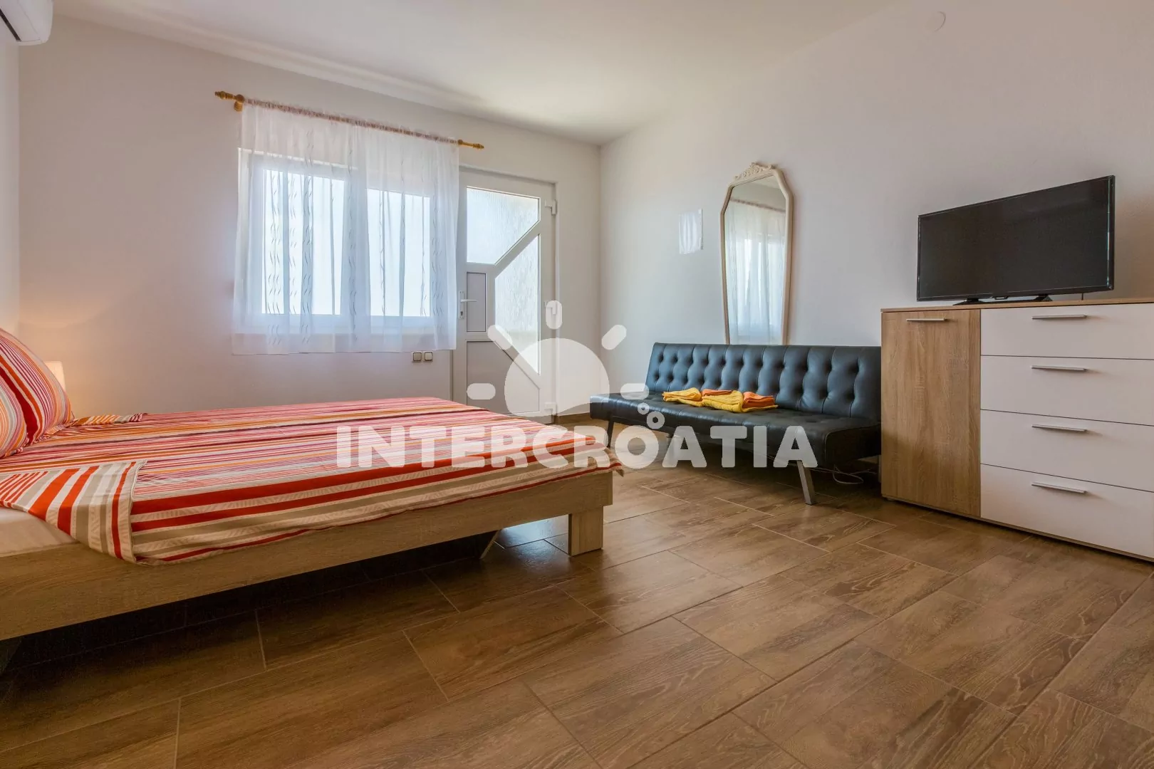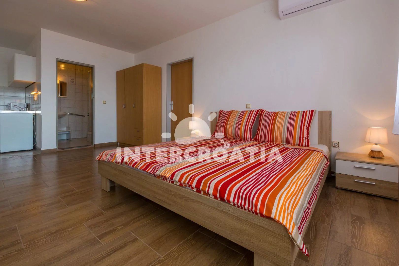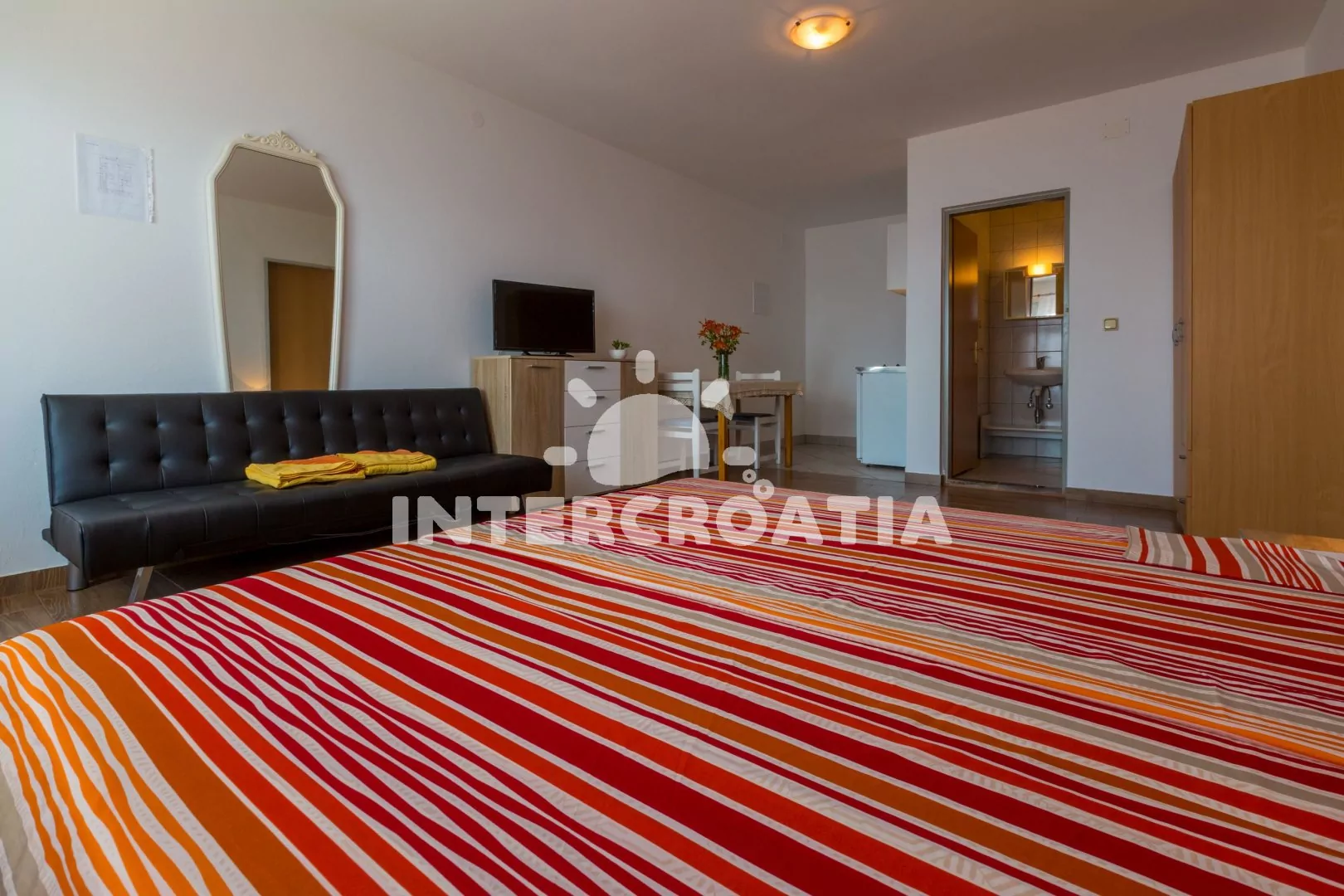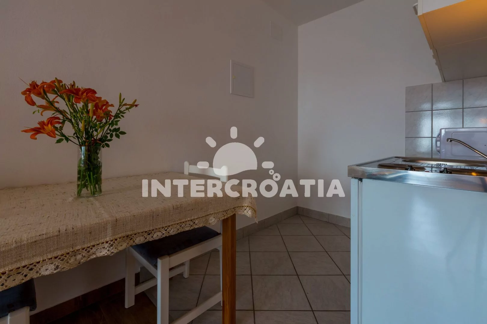 Apartmán typu studio, s vlastní terasou a výhledem na moře se nachází v 1. patře domu a je vhodný pro 2 až 3 osoby. Obývací místnost je spojena s kuchyní. Kuchyňská linka je vybavena dvouplotýnkovým vařičem, mikrovlnnou troubou, kávovarem, nádobím a lednicí s mrazákem. Obývací místnost s jídelním stolem, pohovkou (rozložitelná na extra lůžko pro 1 osobu), televizí se satelitním programem, radiem, klimatizací a vstupem na terasu. Koupelna se sprchovým koutem, umyvadlem a wc. Hostům je k dispozici parkování u objektu zdarma.