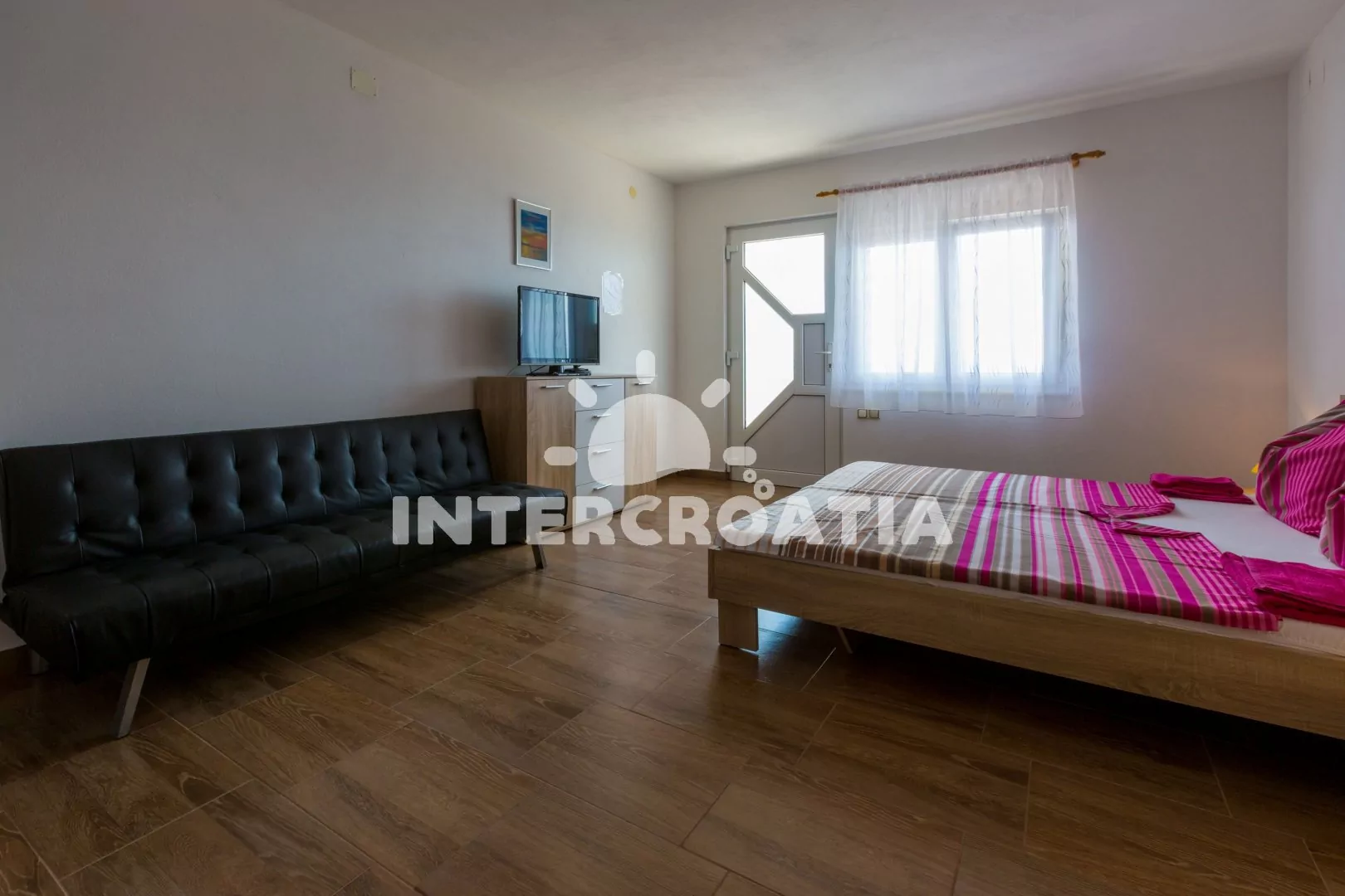 Apartmán typu studio, s balkonem a výhledem na moře se nachází v 1. patře a je vhodný pro 2 až 3 osoby. Obývací místnost je spojena s kuchyní. Kuchyňská linka je vybavena dvouplotýnkovým vařičem, mikrovlnnou troubou, kávovarem, nádobím a lednicí s mrazákem. Obývací místnost s jídelním stolem, pohovkou (rozložitelná na extra lůžko pro 1 osobu), televizí se satelitním programem, radiem, klimatizací a vstupem na balkon. Koupelna se sprchovým koutem, umyvadlem a wc. Hostům je k dispozici parkování u objektu zdarma.