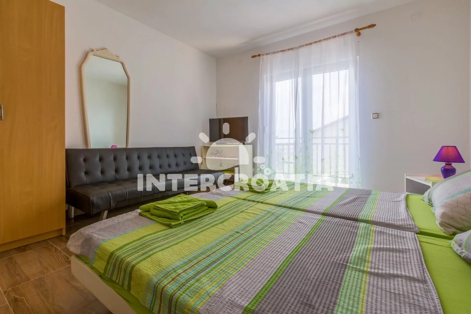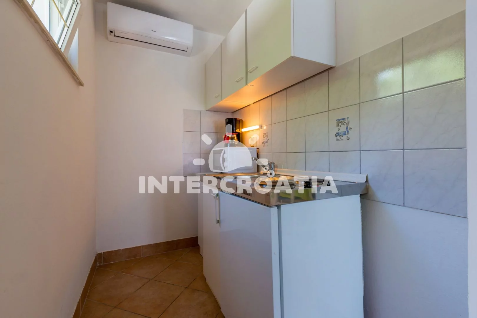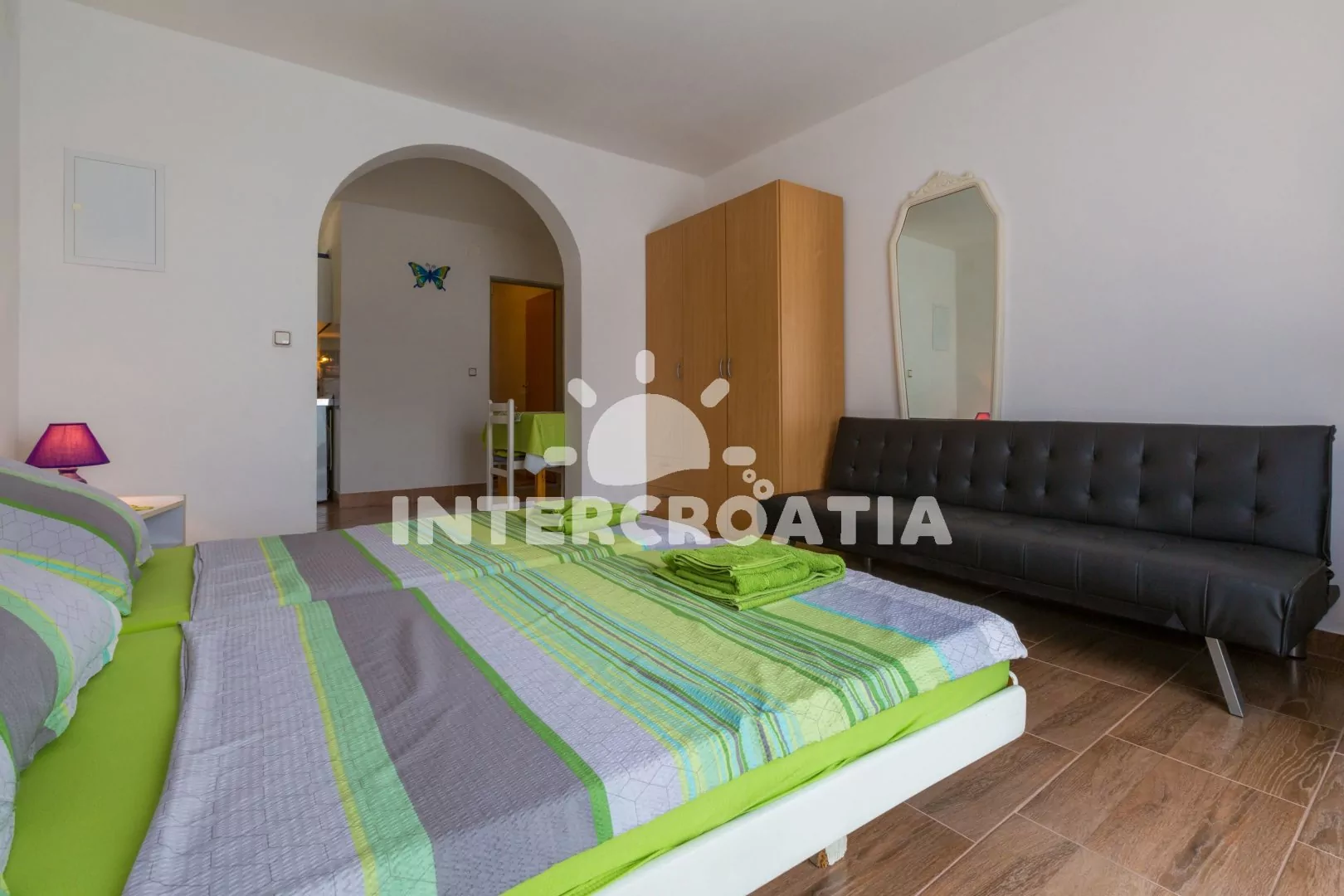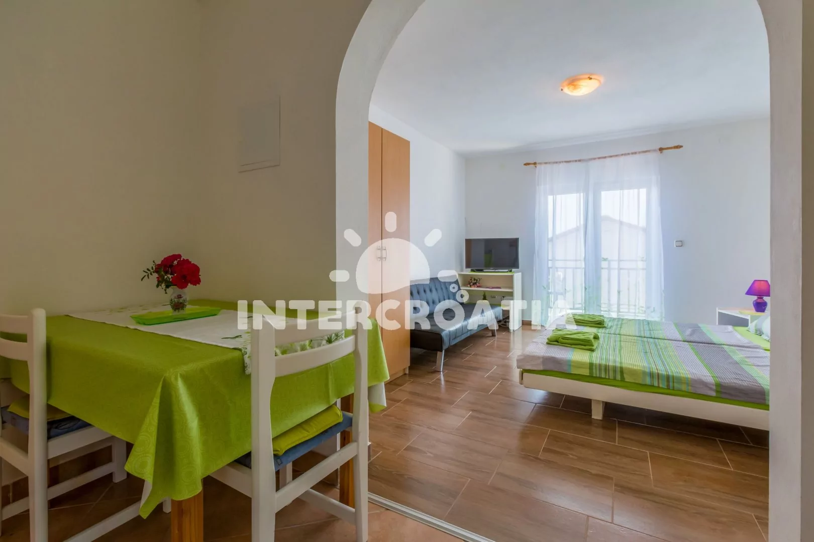 Apartmán typu studio, s balkonem a výhledem na moře se nachází v 1. patře a je vhodný pro 2 až 3 osoby. Obývací místnost je spojena s kuchyní. Kuchyňská linka je vybavena dvouplotýnkovým vařičem, mikrovlnnou troubou, kávovarem, nádobím a lednicí s mrazákem. Obývací místnost s jídelním stolem, pohovkou (rozložitelná na extra lůžko pro 1 osobu), televizí se satelitním programem, radiem, klimatizací a vstupem na balkon. Koupelna se sprchovým koutem, umyvadlem a wc. Hostům je k dispozici parkování u objektu zdarma.