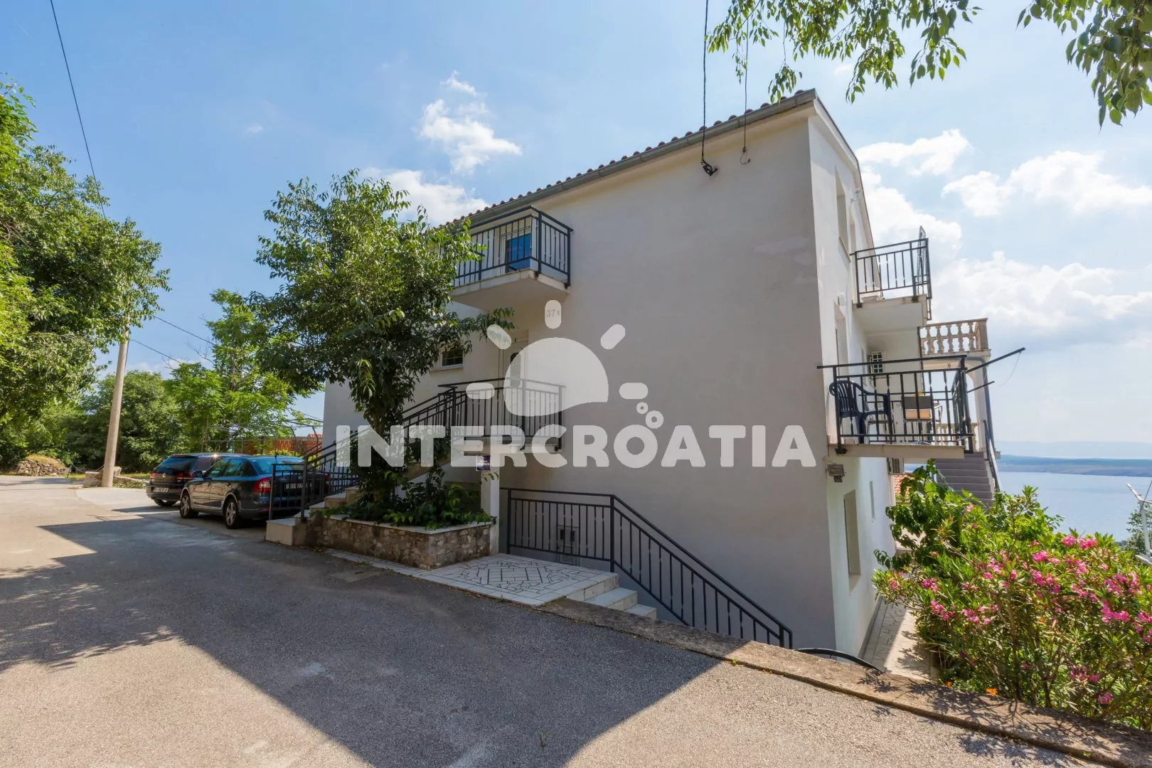 Apartmánový dům s terasami, lodžiemi a výhledem na moře. K dispozici venkovní bazén s lehátky a slunečníky. Velká společenská terasa s možností venkovního posezení a grilování. Parkovací místa u domu. Cesta k moři 700 m (cesta se schody), hlavní cesta 1,5 km (bez schodů), cesta autem 2 km.