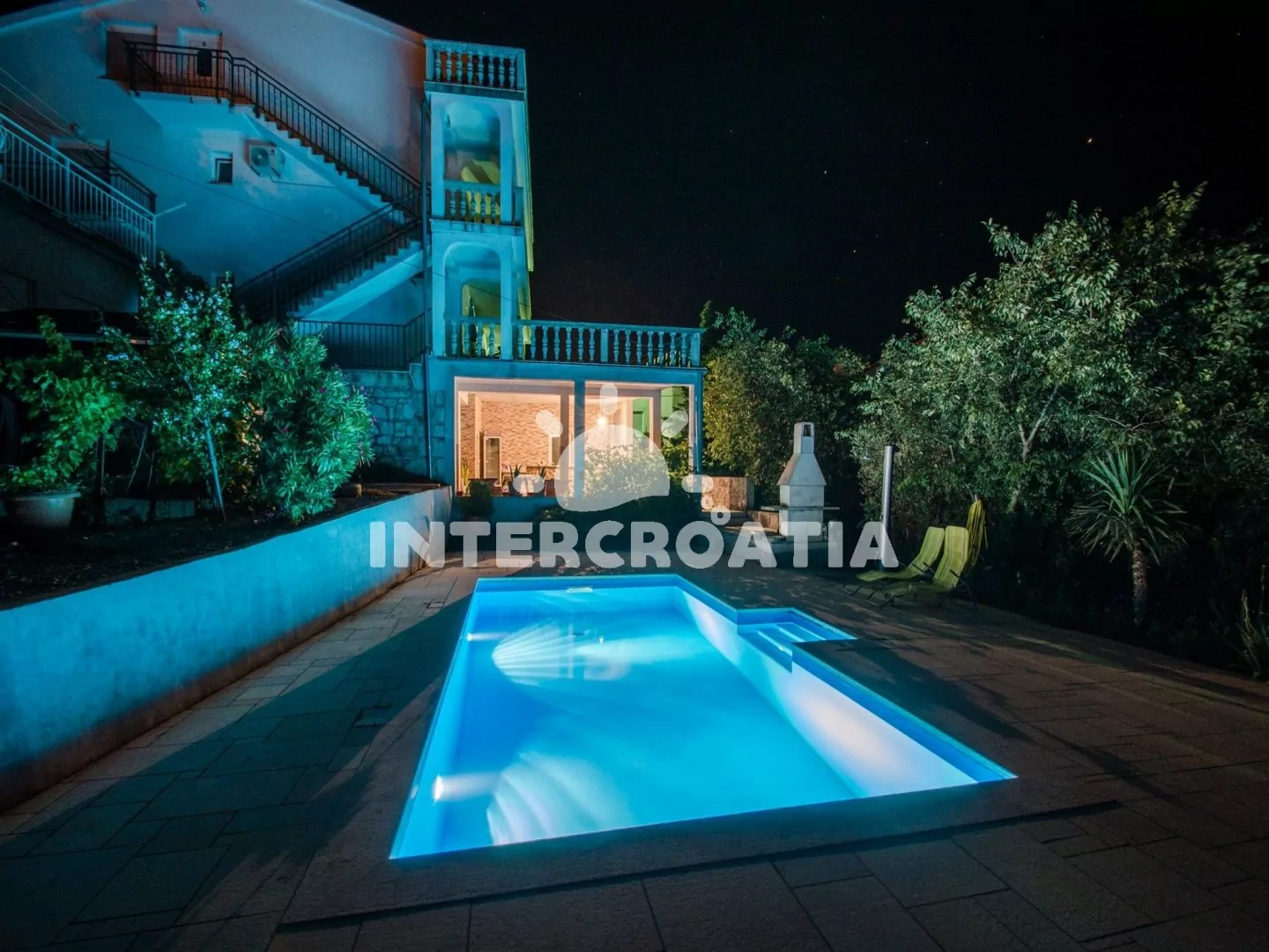 Apartmánová vilka s terasami, lodžiemi a výhledem na moře. Venkovní bazén s lehátky a slunečníky nabízí dokonalou relaxaci. Velká společenská terasa s možností posezení a grilování. Parkovací místa u domu. Cesta k moři 700 m (cesta se schody), hlavní cesta 1,5 km (bez schodů), cesta autem 2 km.
