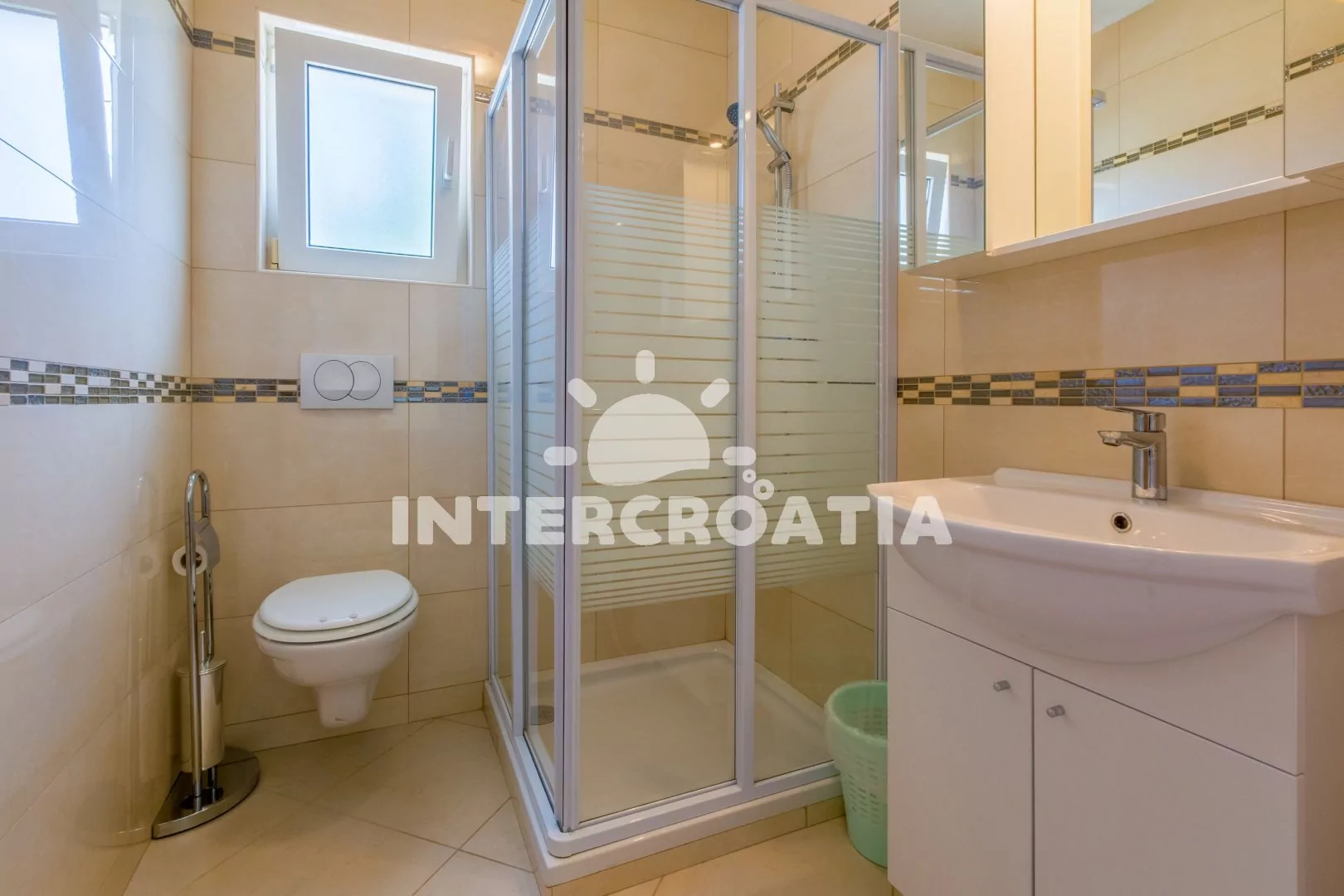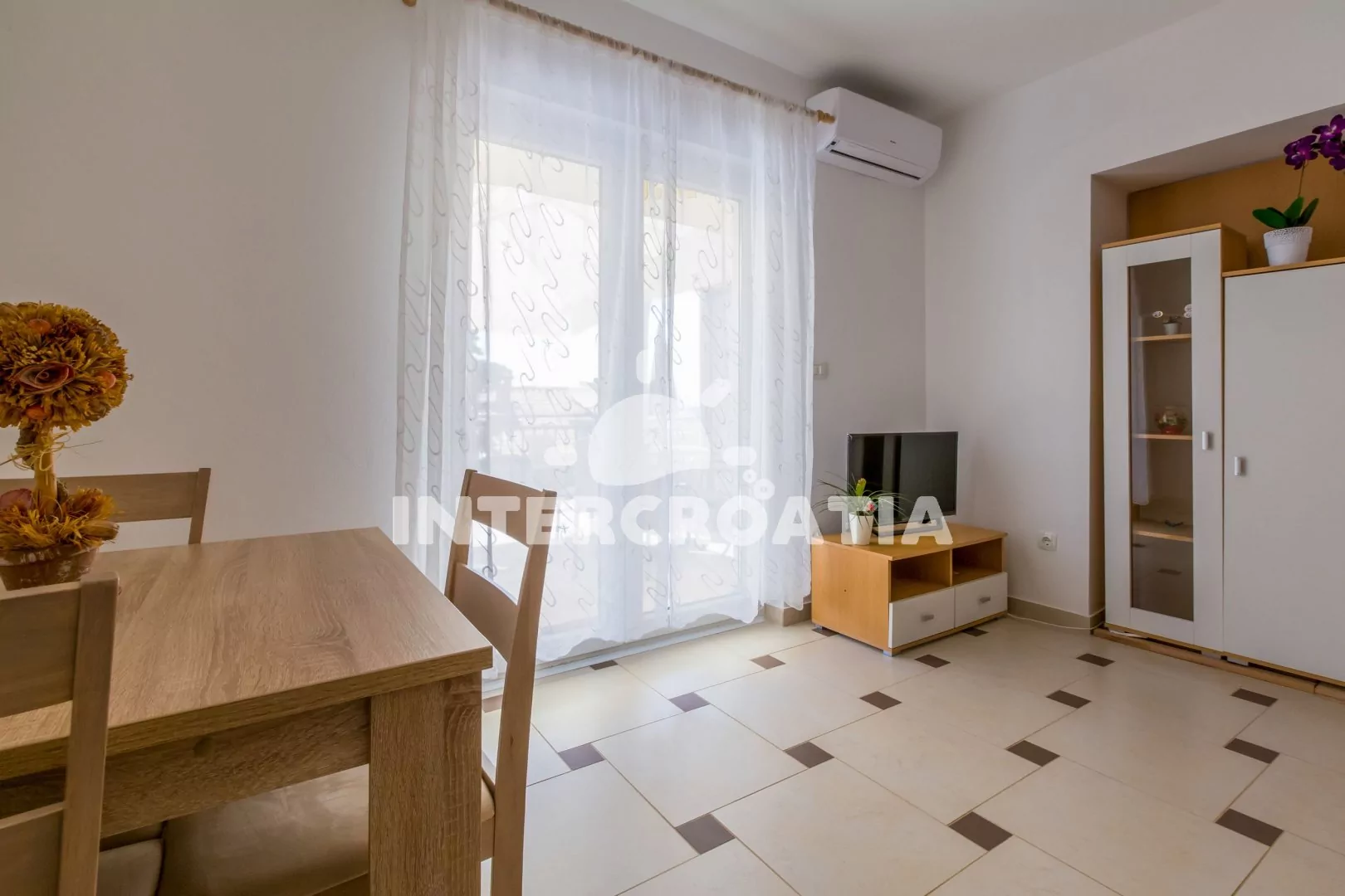 Moderně zařízený apartmán s terasou a výhledem na moře se nachází v přízemí a je vhodný pro 2 až 3 osoby. Obývací pokoj je spojený s kuchyní. Kuchyňská linka je vybavena dvouplotýnkovým vařičem, mikrovlnnou troubou, kávovarem, nádobím a lednicí s mrazákem. Obývací pokoj s jídelním stolem pro 3 osoby, pohovkou (rozložitelná na extra lůžko pro 1 osobu), televizí se satelitním programem, radiem, klimatizací a vstupem na terasu. Ložnice s jedním dvoulůžkem. Koupelna se sprchovým koutem, umyvadlem a wc. Hostům je k dispozici parkování u objektu zdarma.