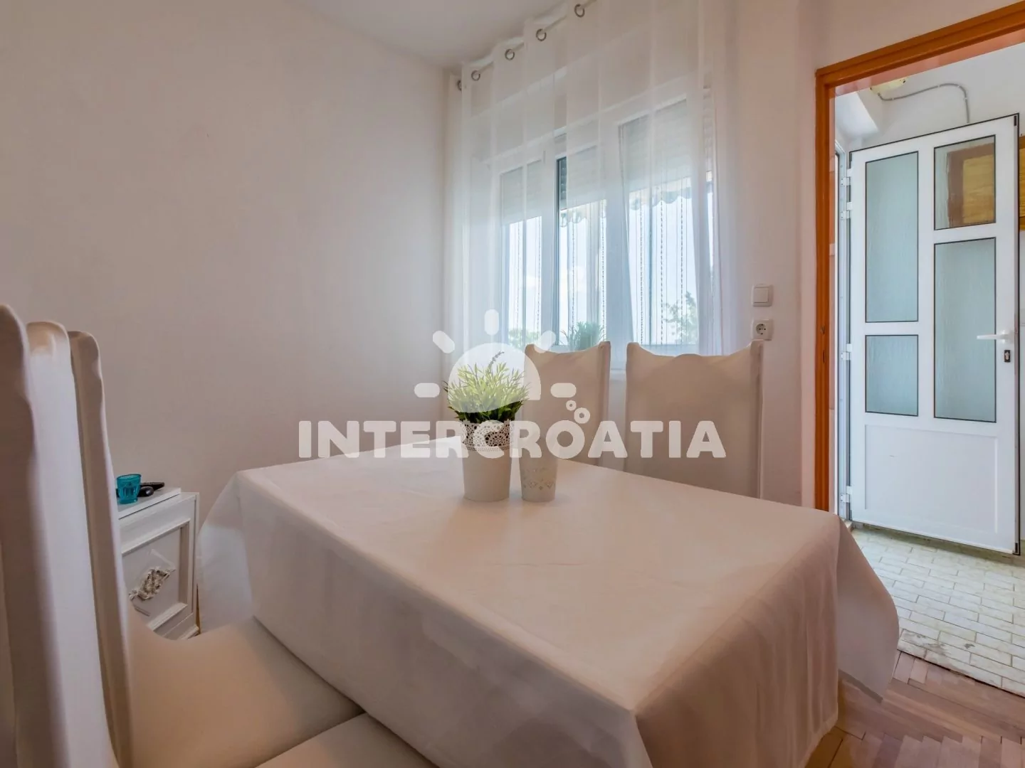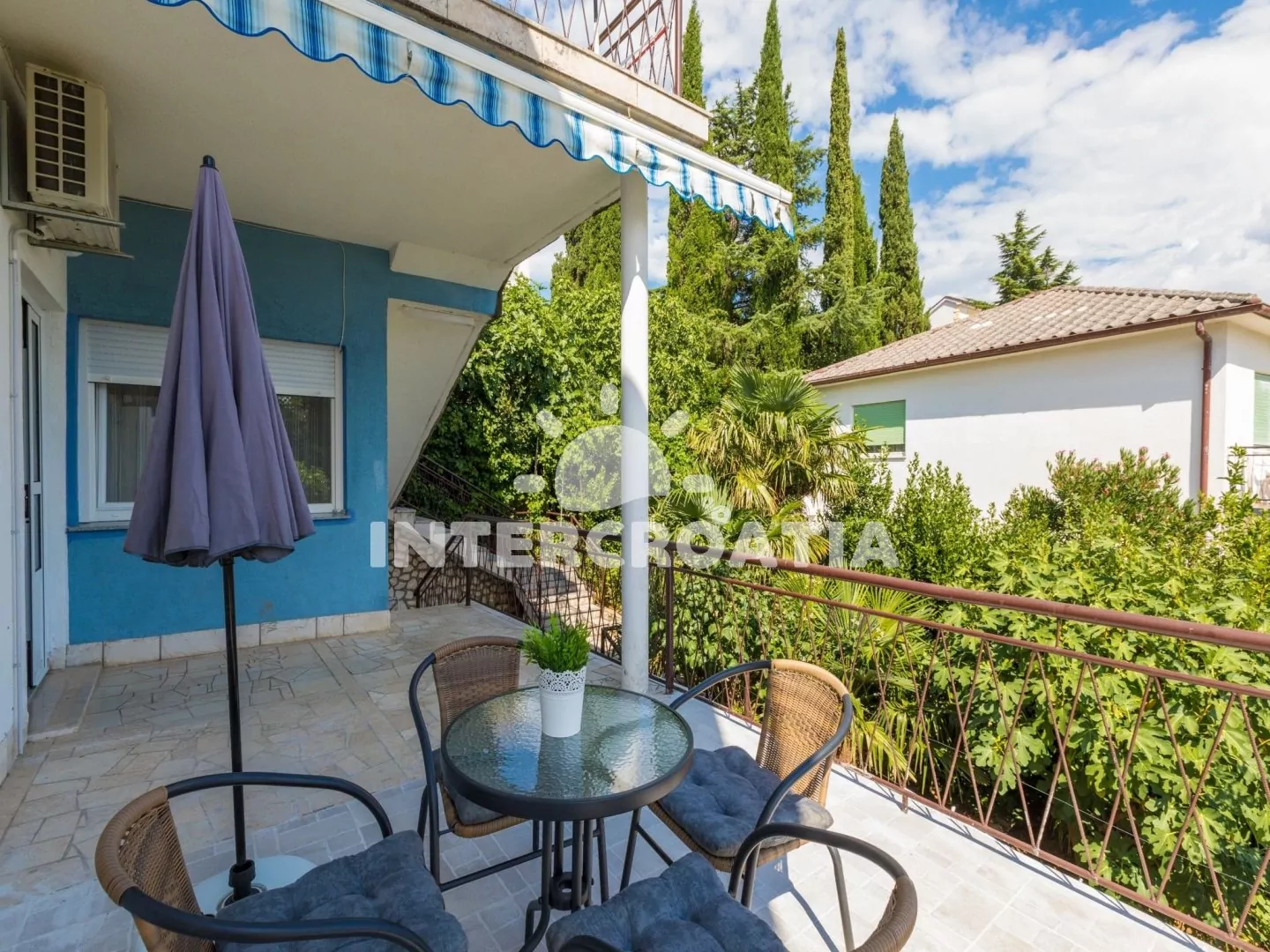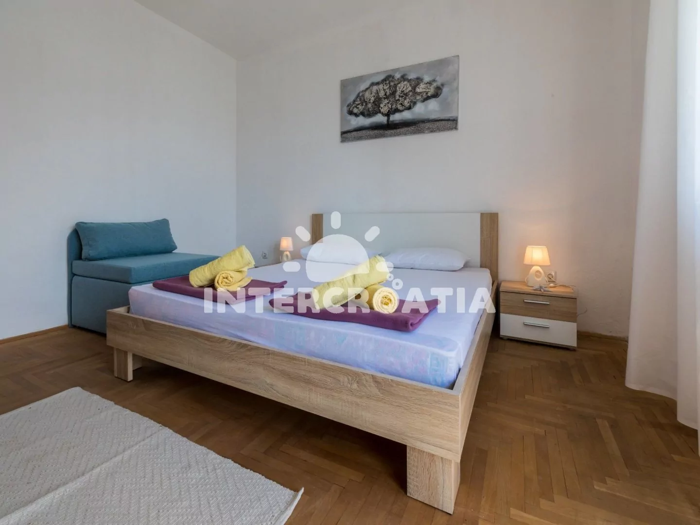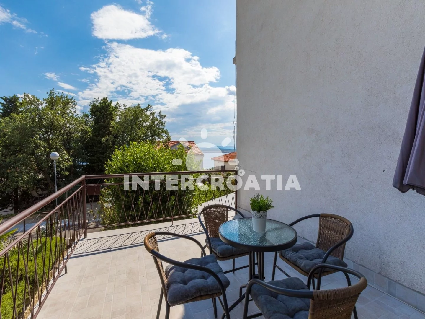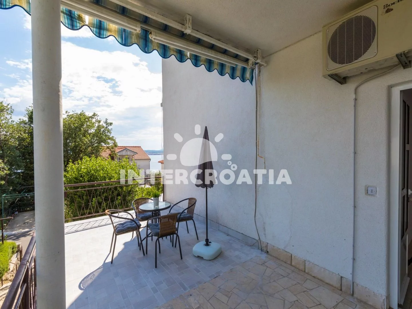 Apartmán s terasou a výhledem na moře se nachází v 1. patře domu a je vhodný pro 2 až 3 osoby. Vstup: kuchyň s jídelním stolem pro 4 osoby, televizí se satelitním programem, klimatizací, kuchyňskou linkou se sporákem, rychlovarnou konvicí, kávovarem, toustovačem, nádobím a lednicí s mrazákem. Ložnice s dvoulůžkem, pohovkou (rozložitelná na extra lůžko pro 1 osobu), klimatizací a vstupem na balkon. Koupelna se sprchovým koutem, umyvadlem a wc. Hostům je k dispozici parkování u objektu zdarma.