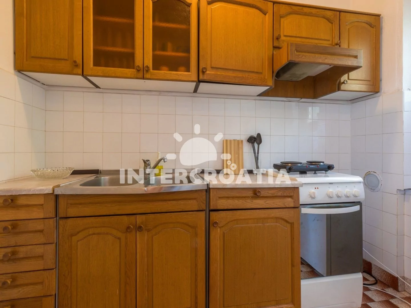 Apartmán s terasou a výhledem na moře se nachází v 1. patře domu a je vhodný pro 2 až 3 osoby. Vstup: kuchyň s jídelním stolem pro 4 osoby, televizí se satelitním programem, klimatizací, kuchyňskou…