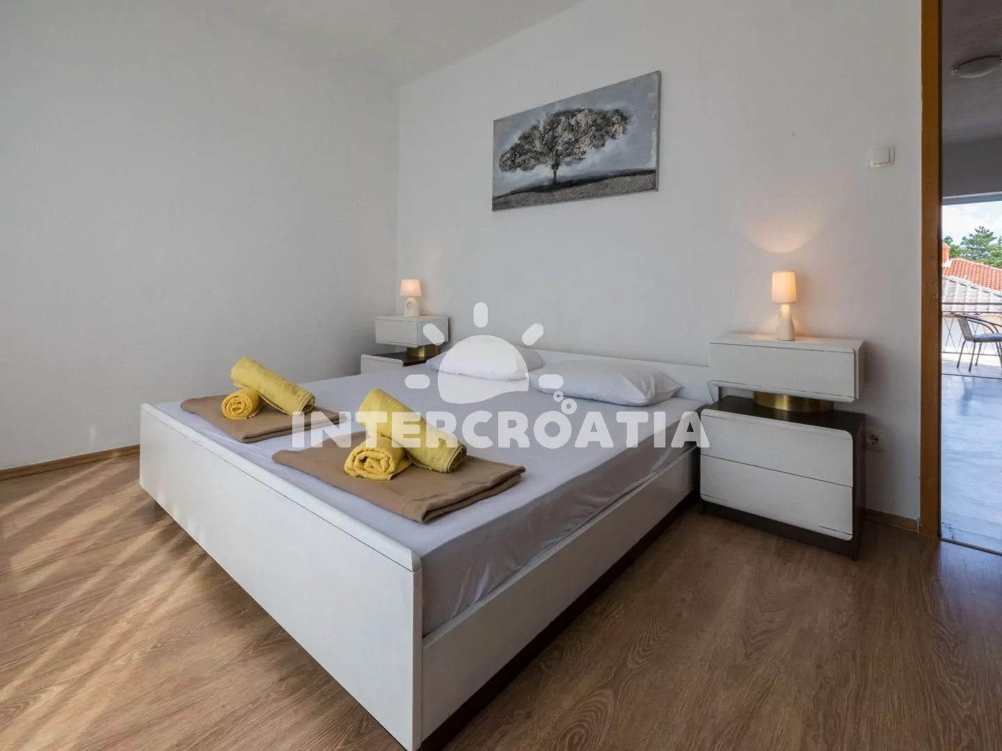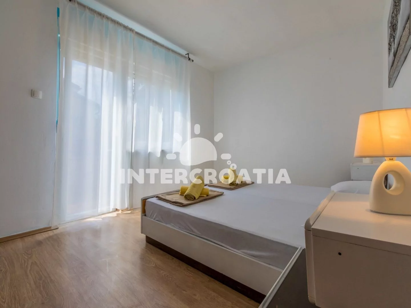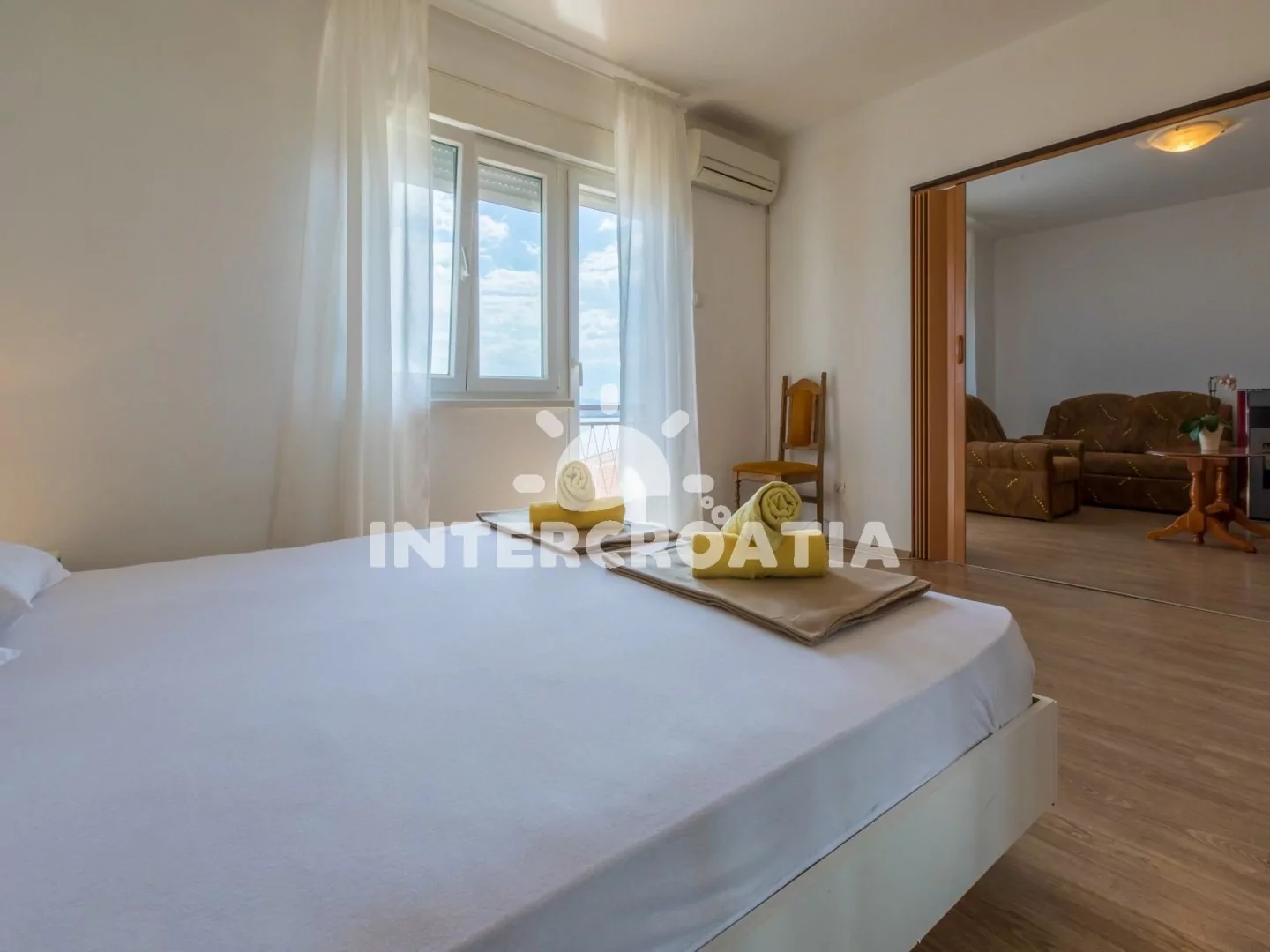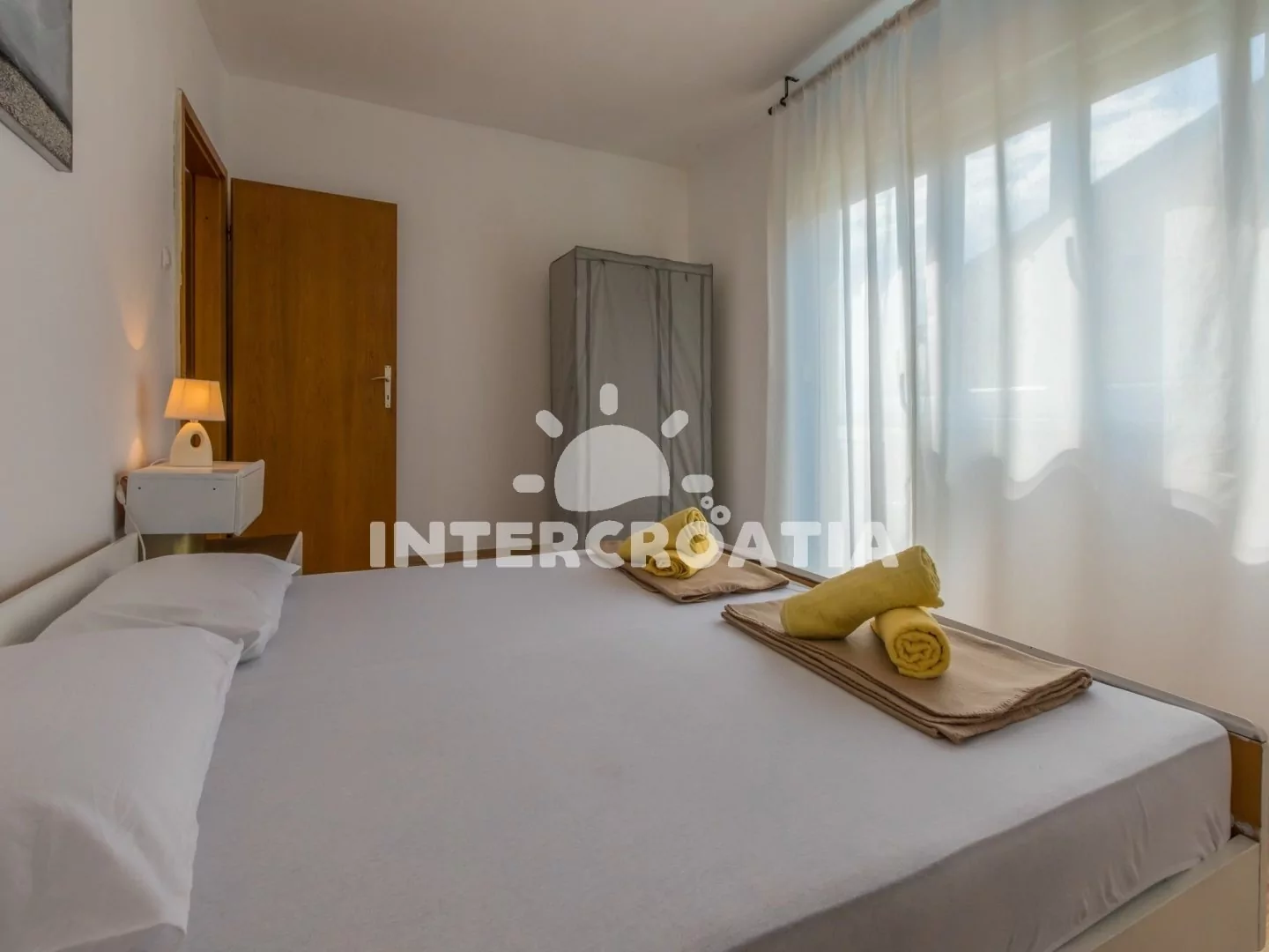 Příjemně zařízený apartmán (75 m2) s vlastní terasou, balkonem a výhledem na moře se nachází v 2. patře domu a je vhodný pro 4 až 5 osob. Vstup: Kuchyň s jídelním stolem pro 4 osoby, kuchyňskou linkou se sklokeramickou varnou deskou, digestoří, troubou, rychlovarnou konvicí, kávovarem, toustovačem, nádobím a lednicí s mrazákem. Obývací pokoj se sedací soupravou, pohovkou (rozložitelná na extra lůžko pro 1 osobu), televizí se satelitním programem a vstupem na balkon. První ložnice s dvoulůžkem, klimatizací a vstupem na balkon. Druhá ložnice s dvoulůžkem a vstupem na balkon. Koupelna se sprchovým koutem, umyvadlem, bidetem a wc. Hostům je k dispozici parkování u objektu zdarma.