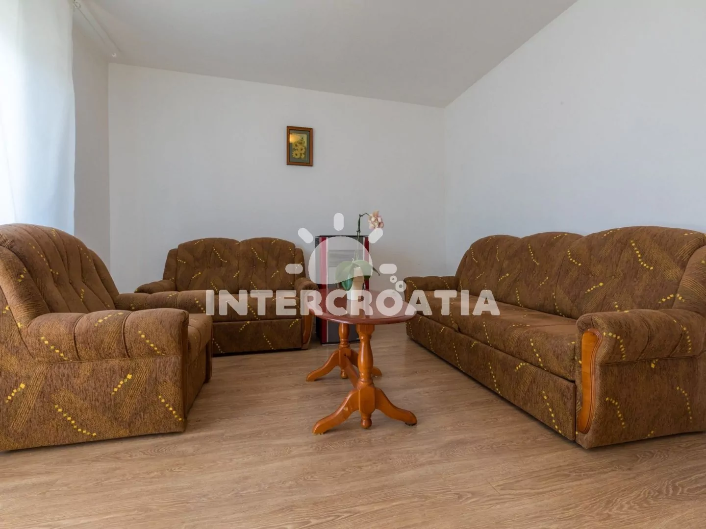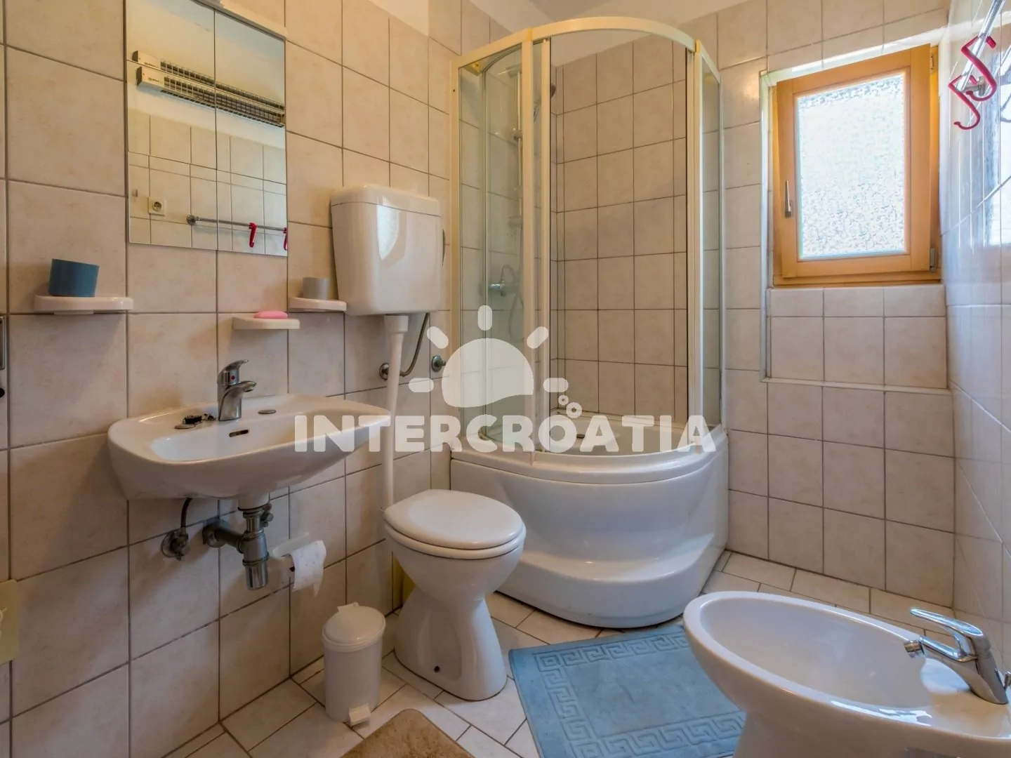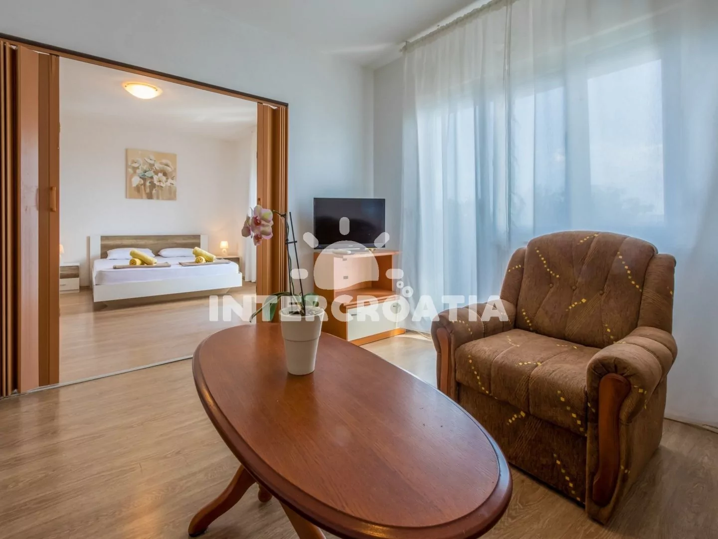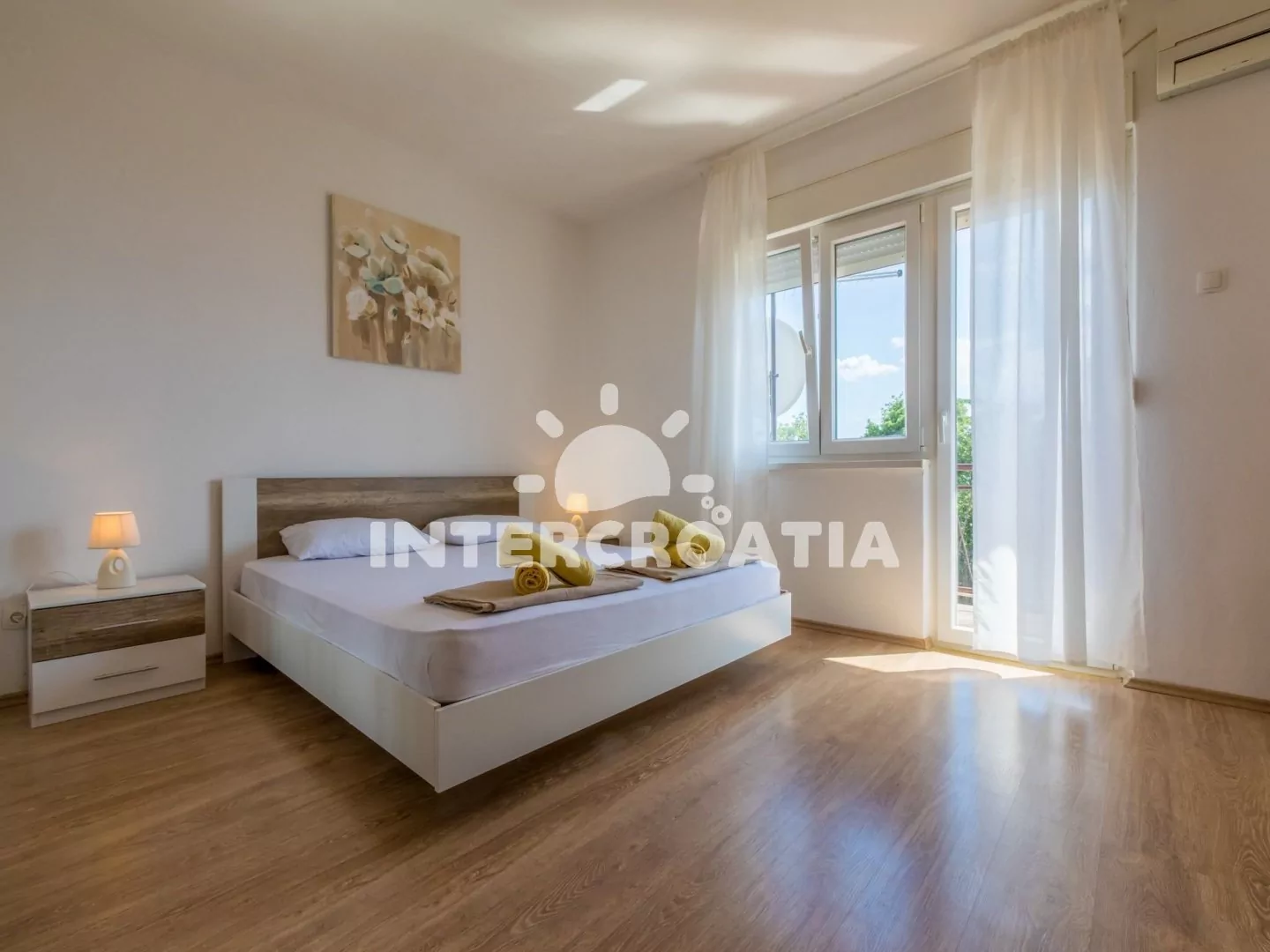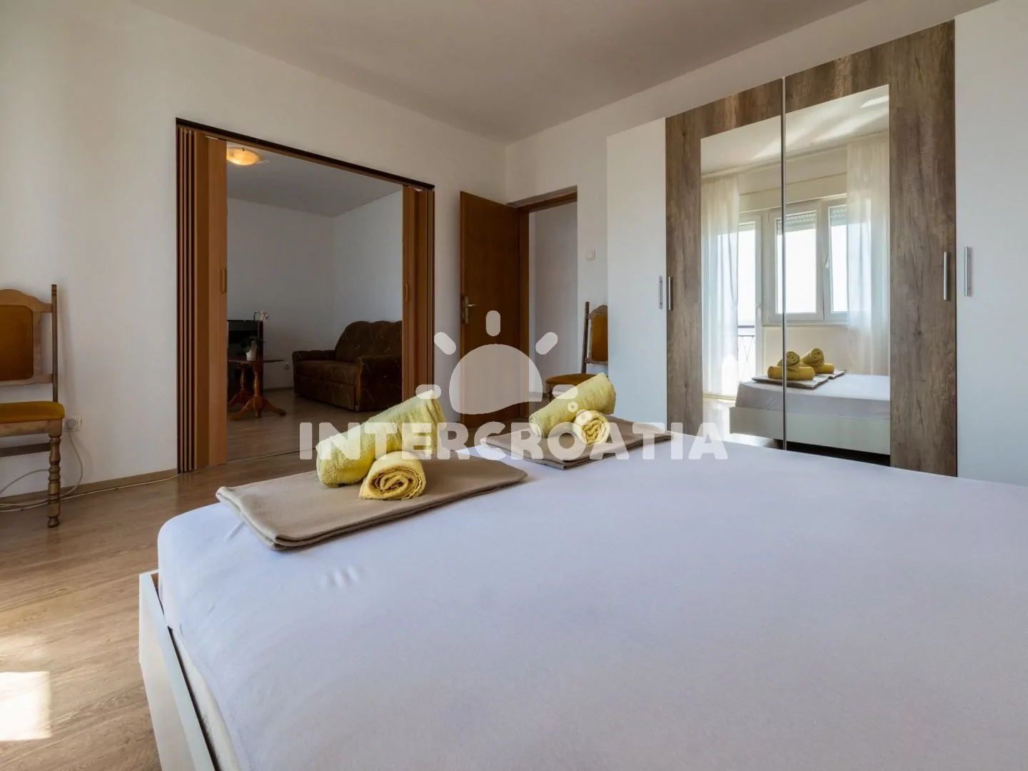 Příjemně zařízený apartmán (75 m2) s vlastní terasou, balkonem a výhledem na moře se nachází v 2. patře domu a je vhodný pro 4 až 5 osob. Vstup: Kuchyň s jídelním stolem pro 4 osoby, kuchyňskou linkou se sklokeramickou varnou deskou, digestoří, troubou, rychlovarnou konvicí, kávovarem, toustovačem, nádobím a lednicí s mrazákem. Obývací pokoj se sedací soupravou, pohovkou (rozložitelná na extra lůžko pro 1 osobu), televizí se satelitním programem a vstupem na balkon. První ložnice s dvoulůžkem, klimatizací a vstupem na balkon. Druhá ložnice s dvoulůžkem a vstupem na balkon. Koupelna se sprchovým koutem, umyvadlem, bidetem a wc. Hostům je k dispozici parkování u objektu zdarma.