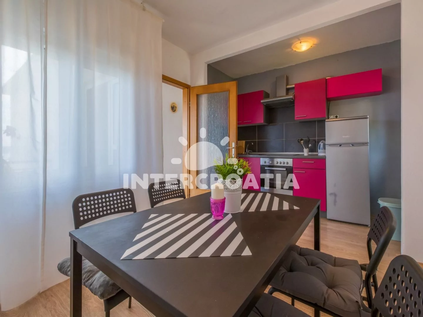Příjemně zařízený apartmán (75 m2) s vlastní terasou, balkonem a výhledem na moře se nachází v 2. patře domu a je vhodný pro 4 až 5 osob. Vstup: Kuchyň s jídelním stolem pro 4 osoby, kuchyňskou…
