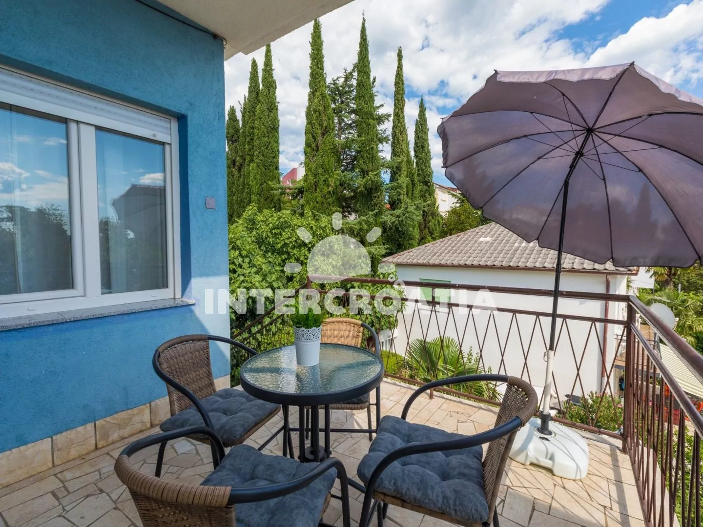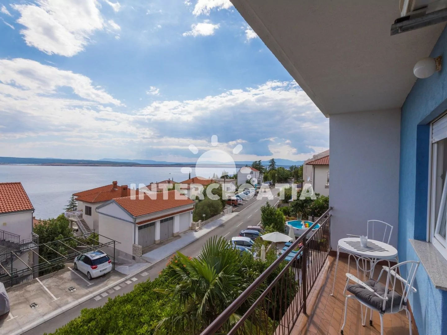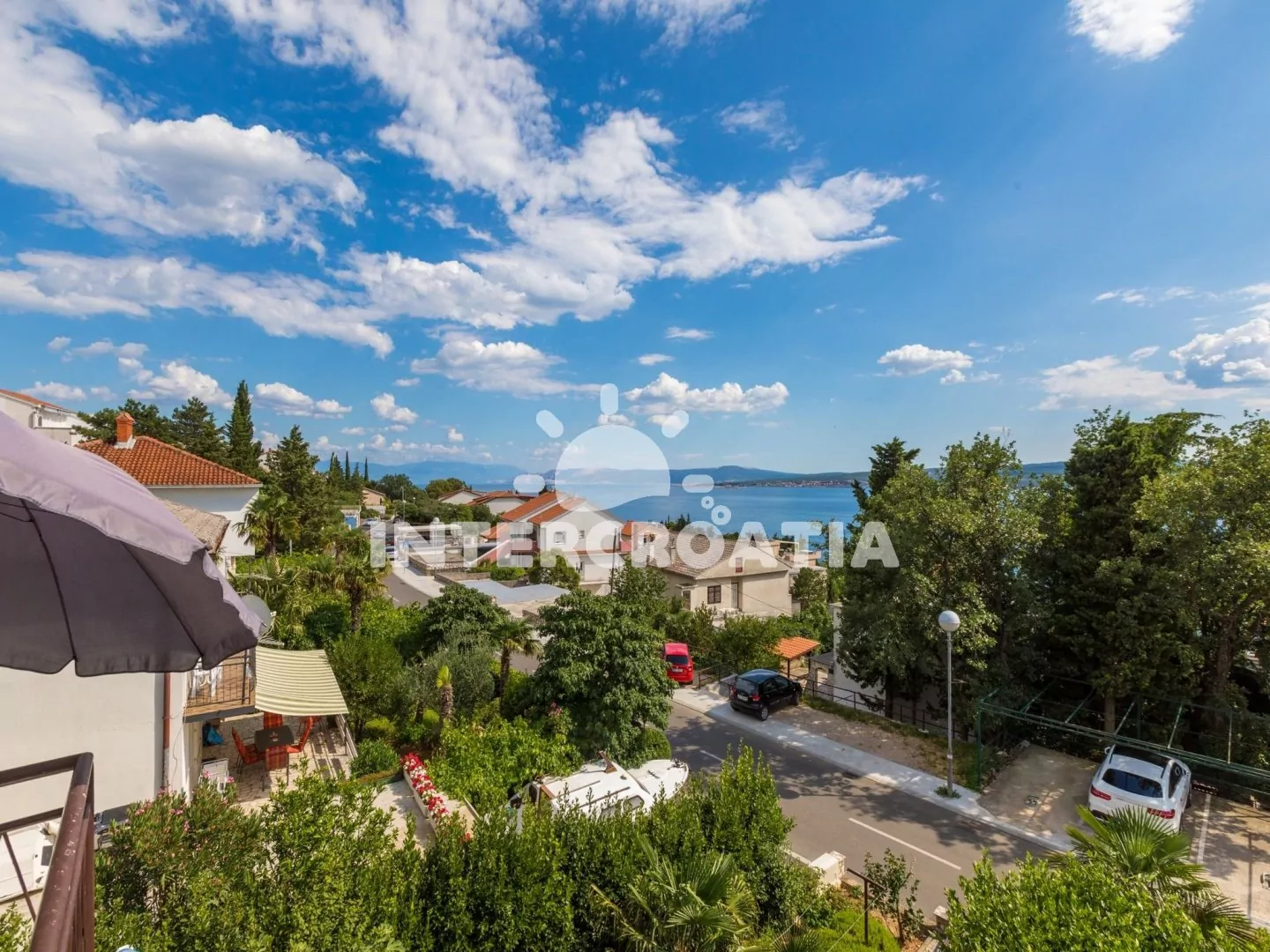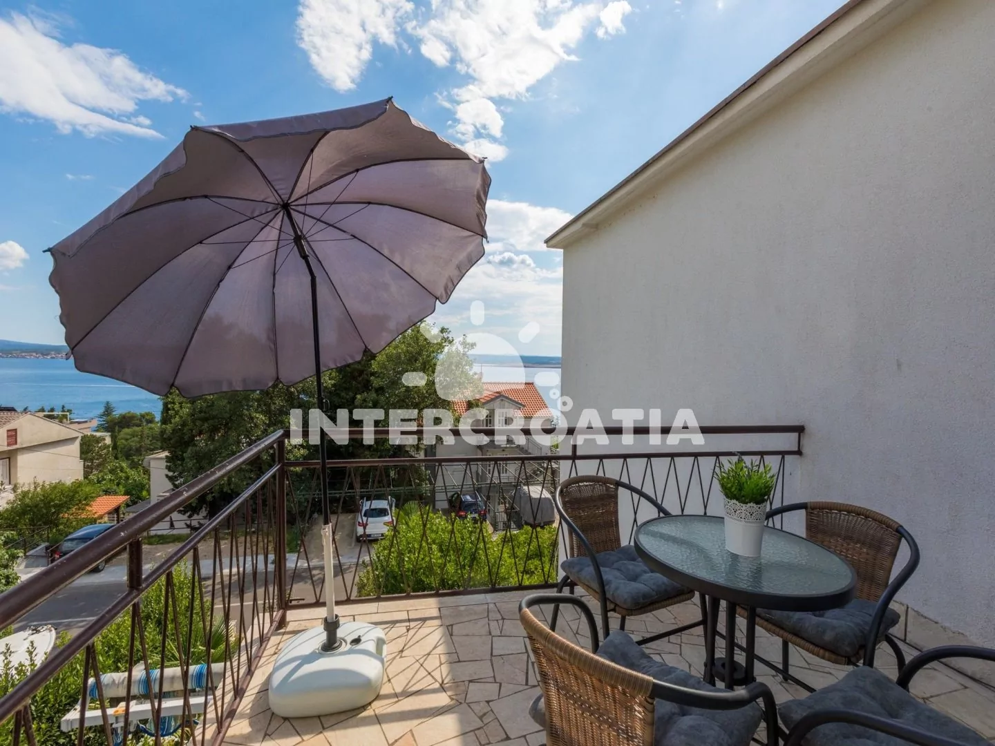 Moderně zařízený dům s výhledem na moře a lodžiemi s venkovním posezením. Dům je dobře dostupný k oblázkové pláži a moři. U domu parkovací místa pro automobily.